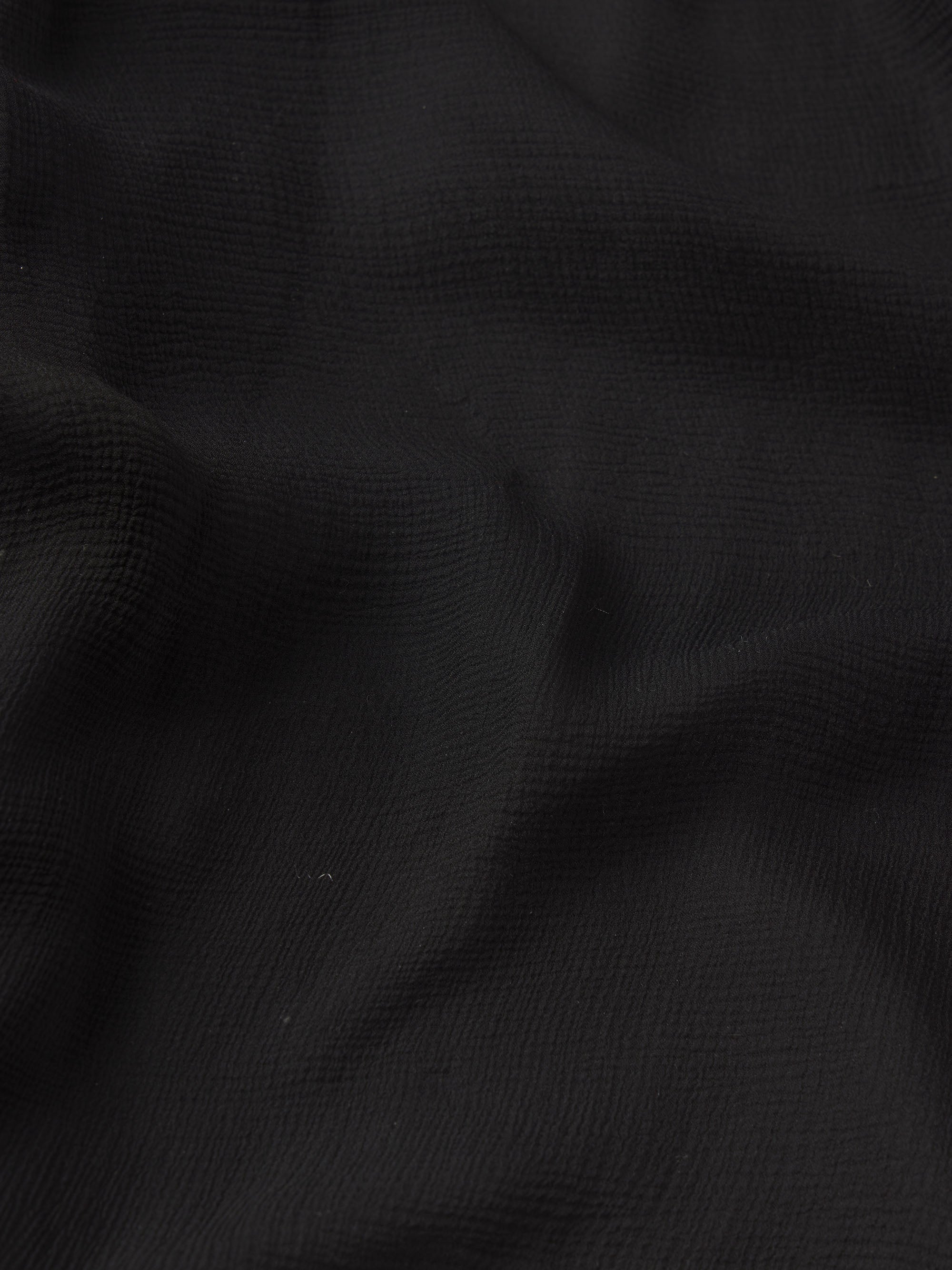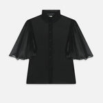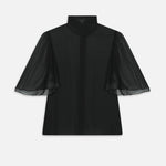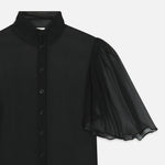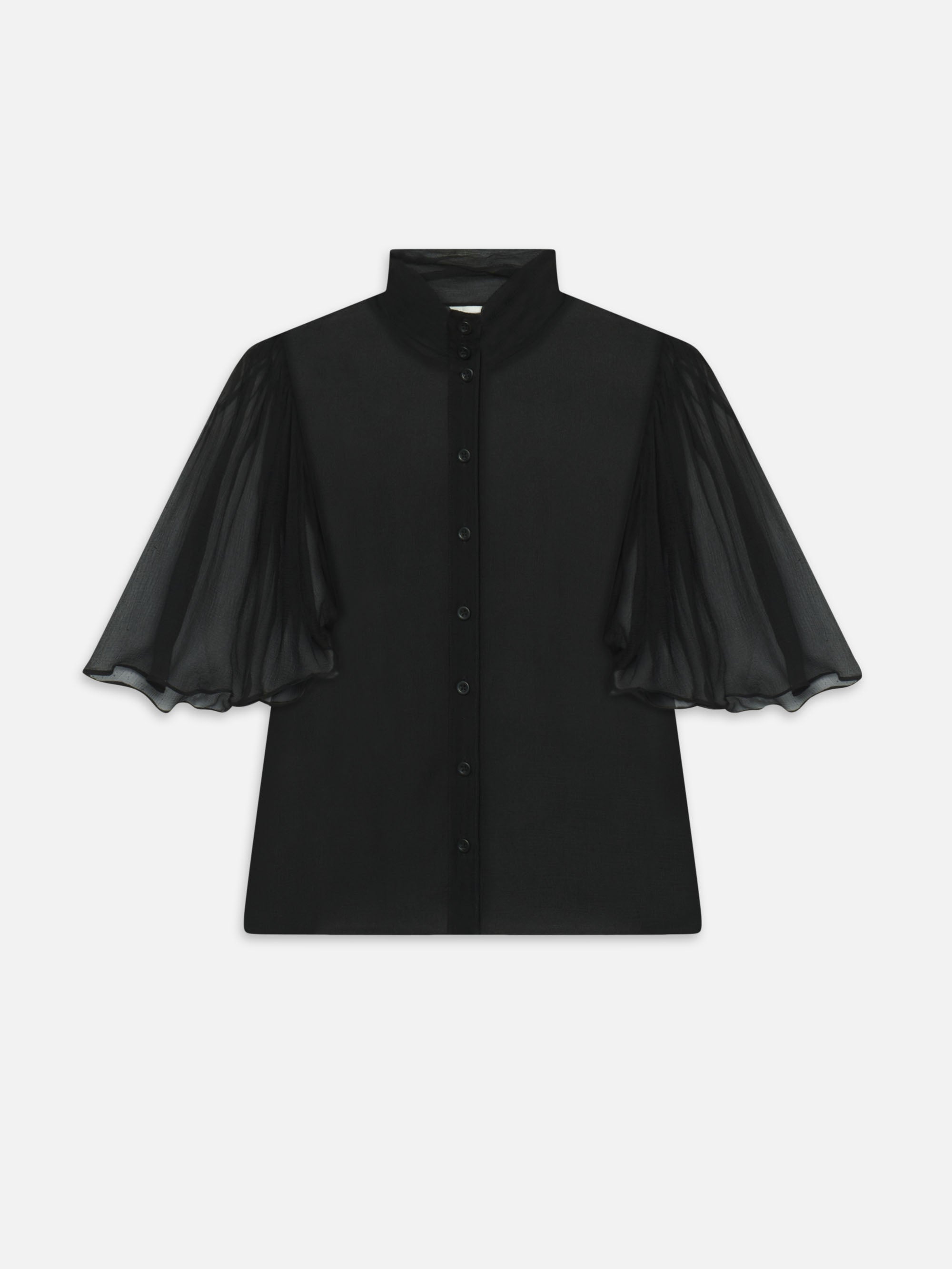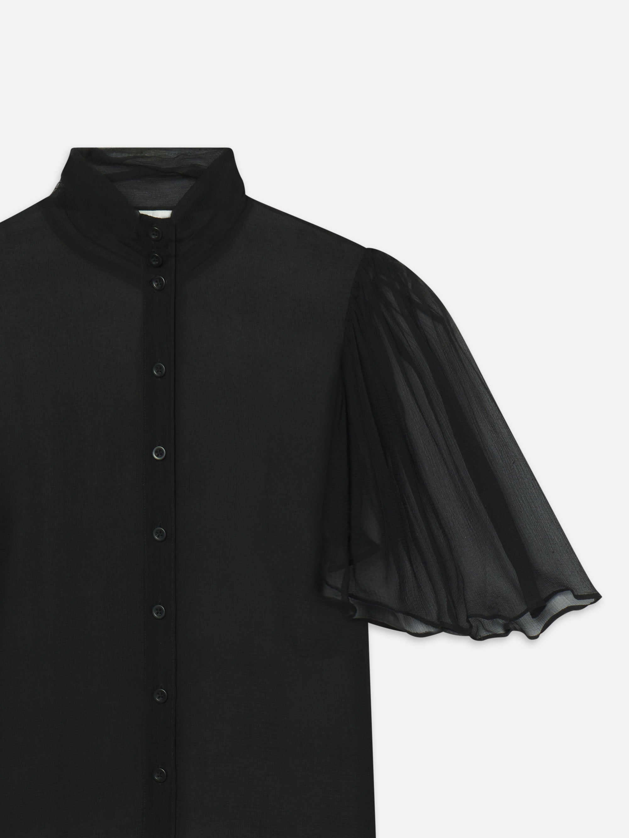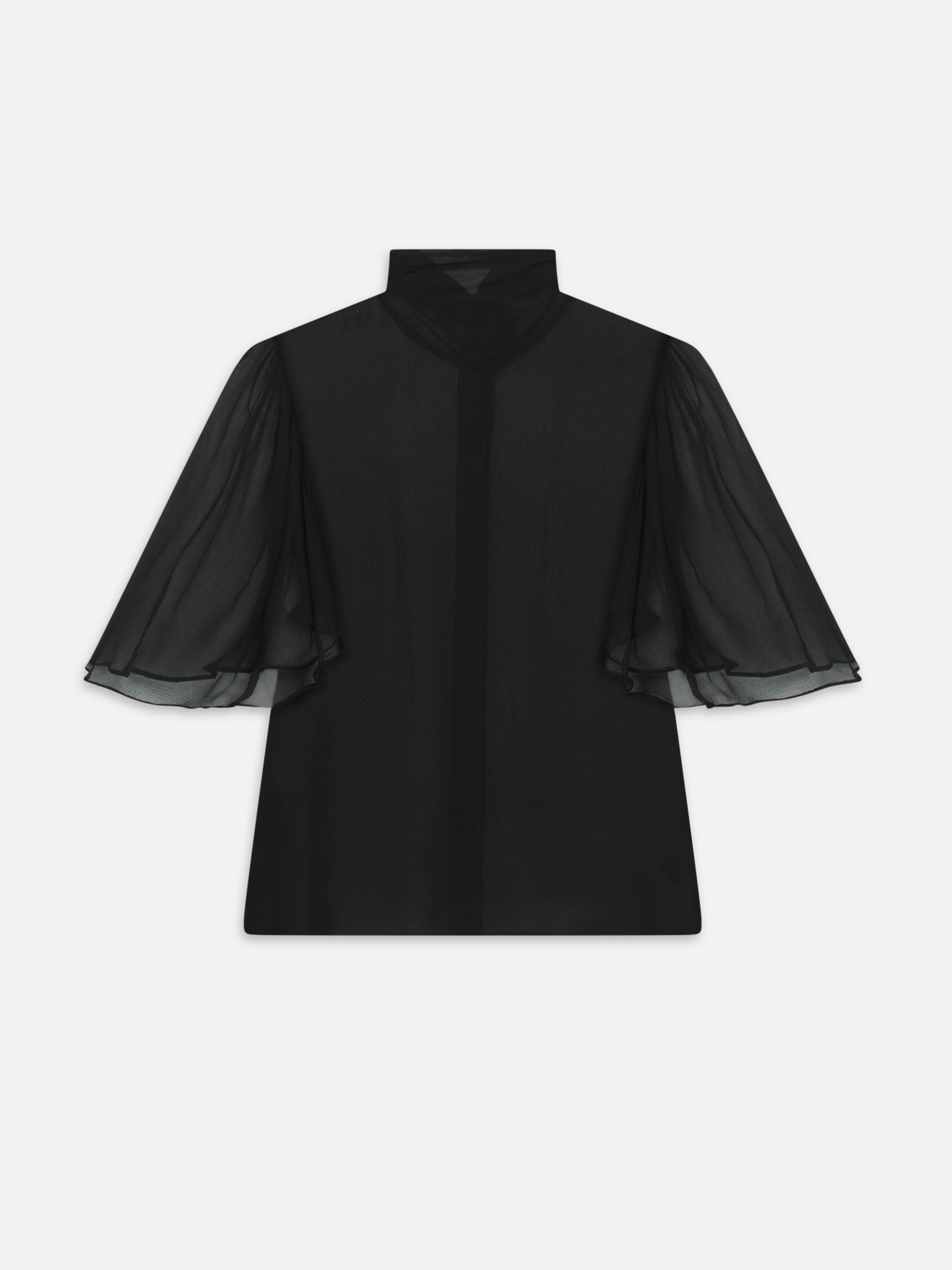 A delicate silk blouse with semi-sheer flutter sleeves that give a soft, airy quality. Full length and lined through the body for coverage.