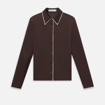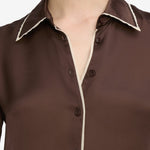 A sleek button-down in lustrous silk, detailed with the contrast mesh trim carried throughout the collection. Cut for a slim fit—size up for a fuller bust.
