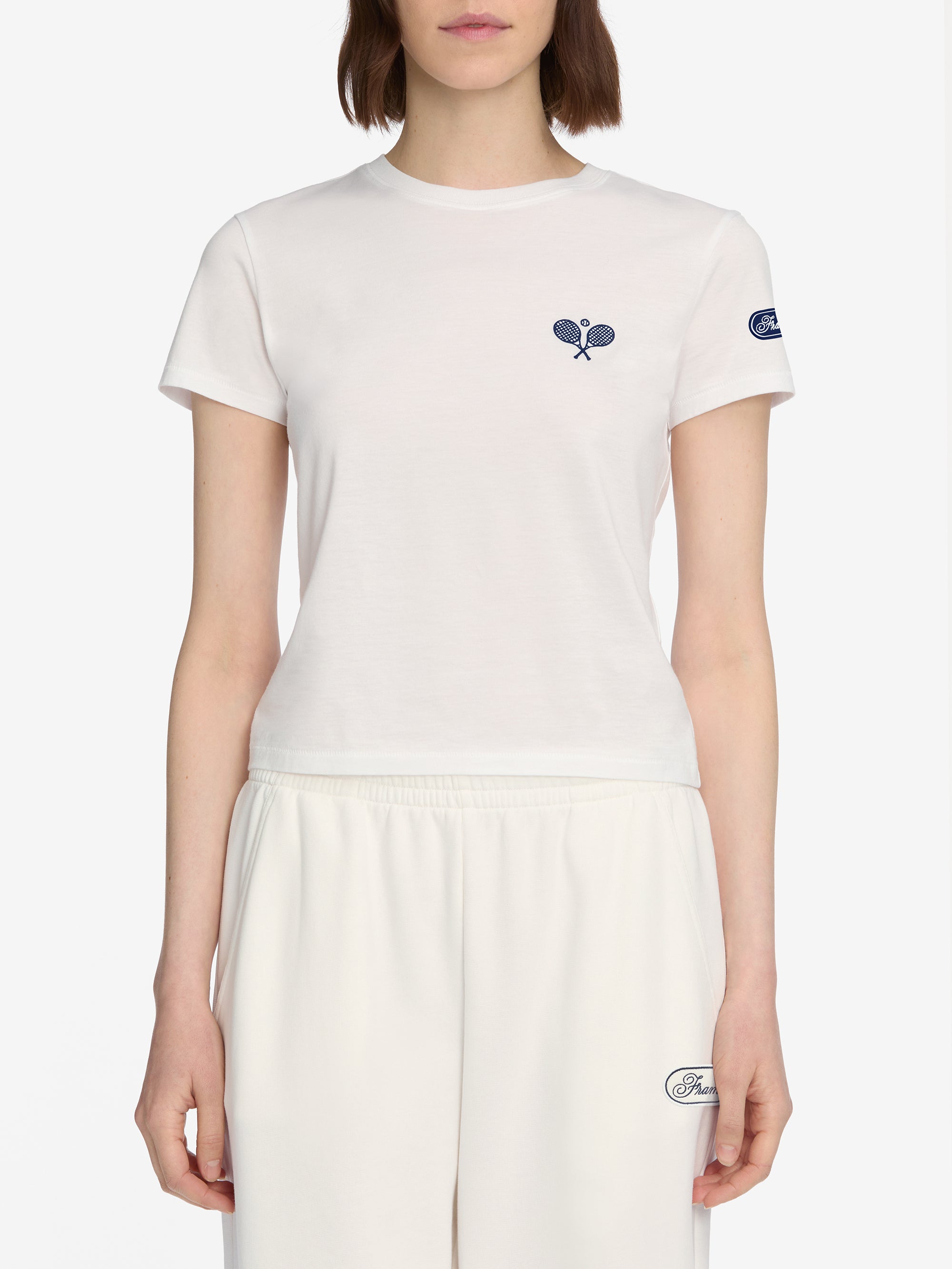 From our Tennis Capsule, this classic shrunken tee features embroidered tennis rackets at the chest. A wink to heritage style, rendered in soft, breathable cotton.