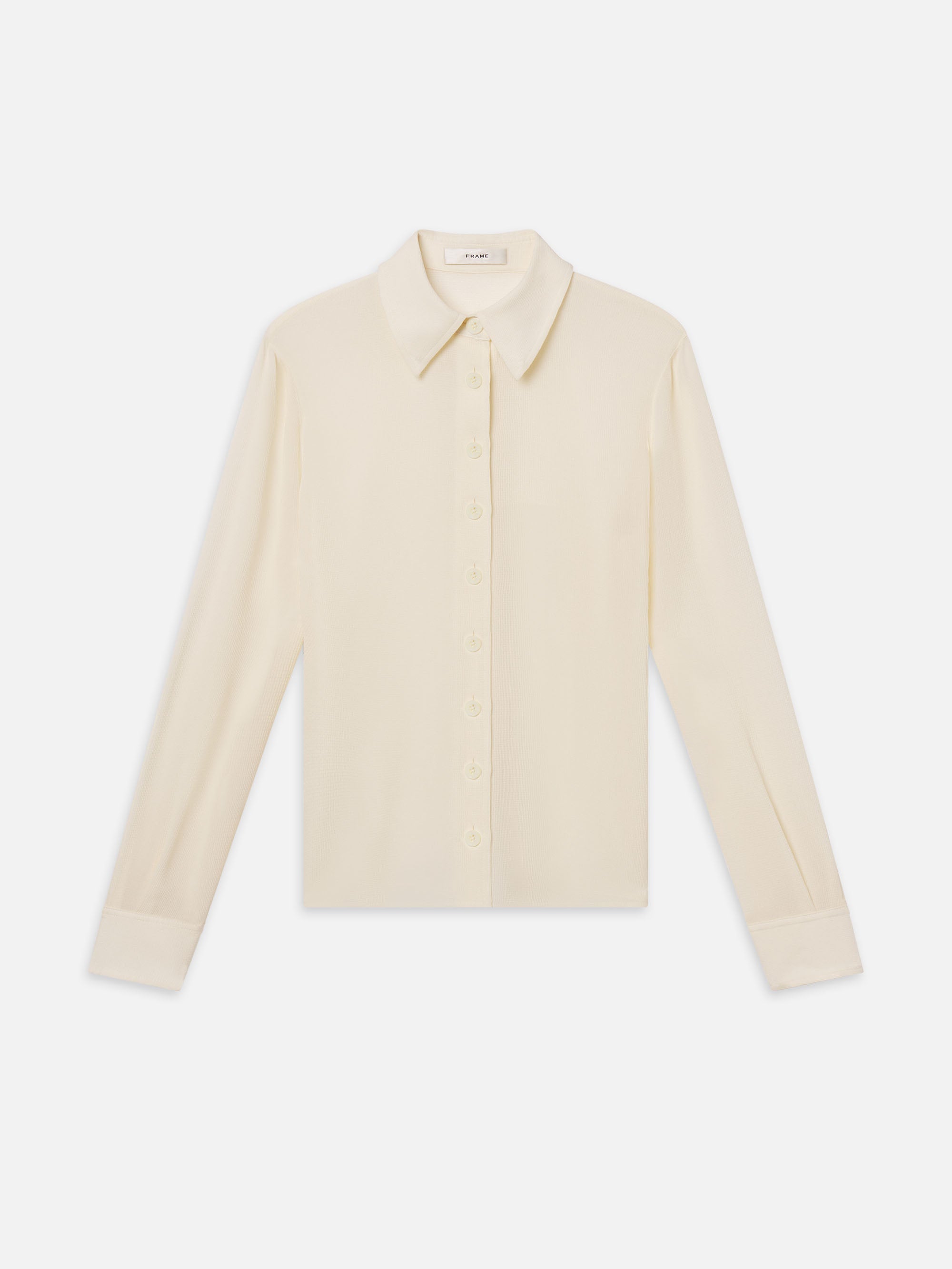 A slim-fitting dobby silk shirt with vented sides and adjustable cuffs. Tailored with a clean, easy drape that pairs effortlessly with denim or trousers.