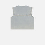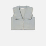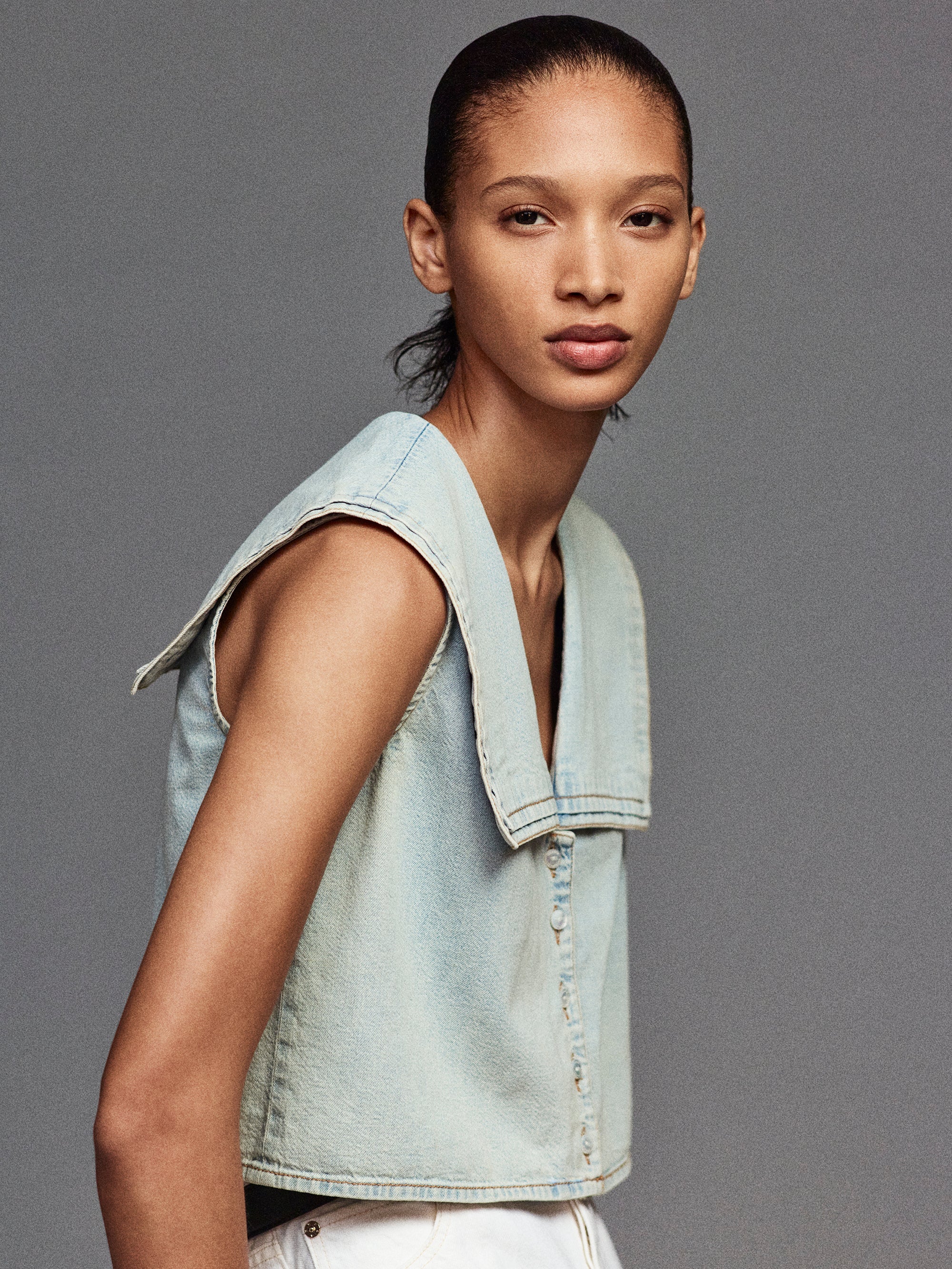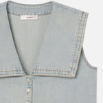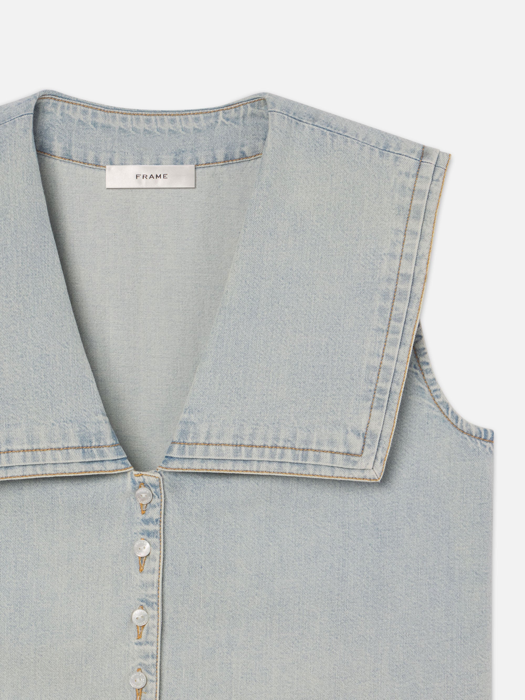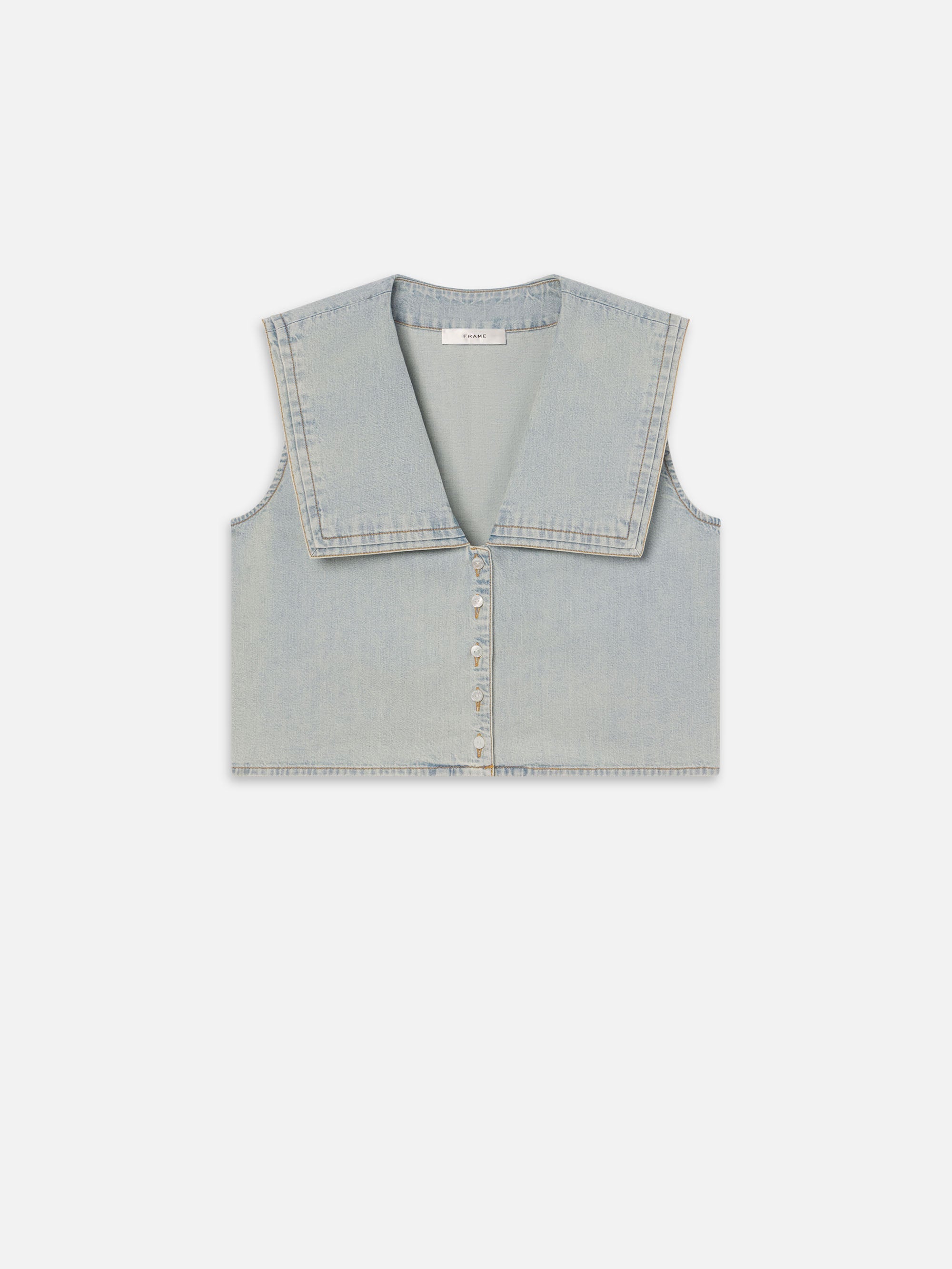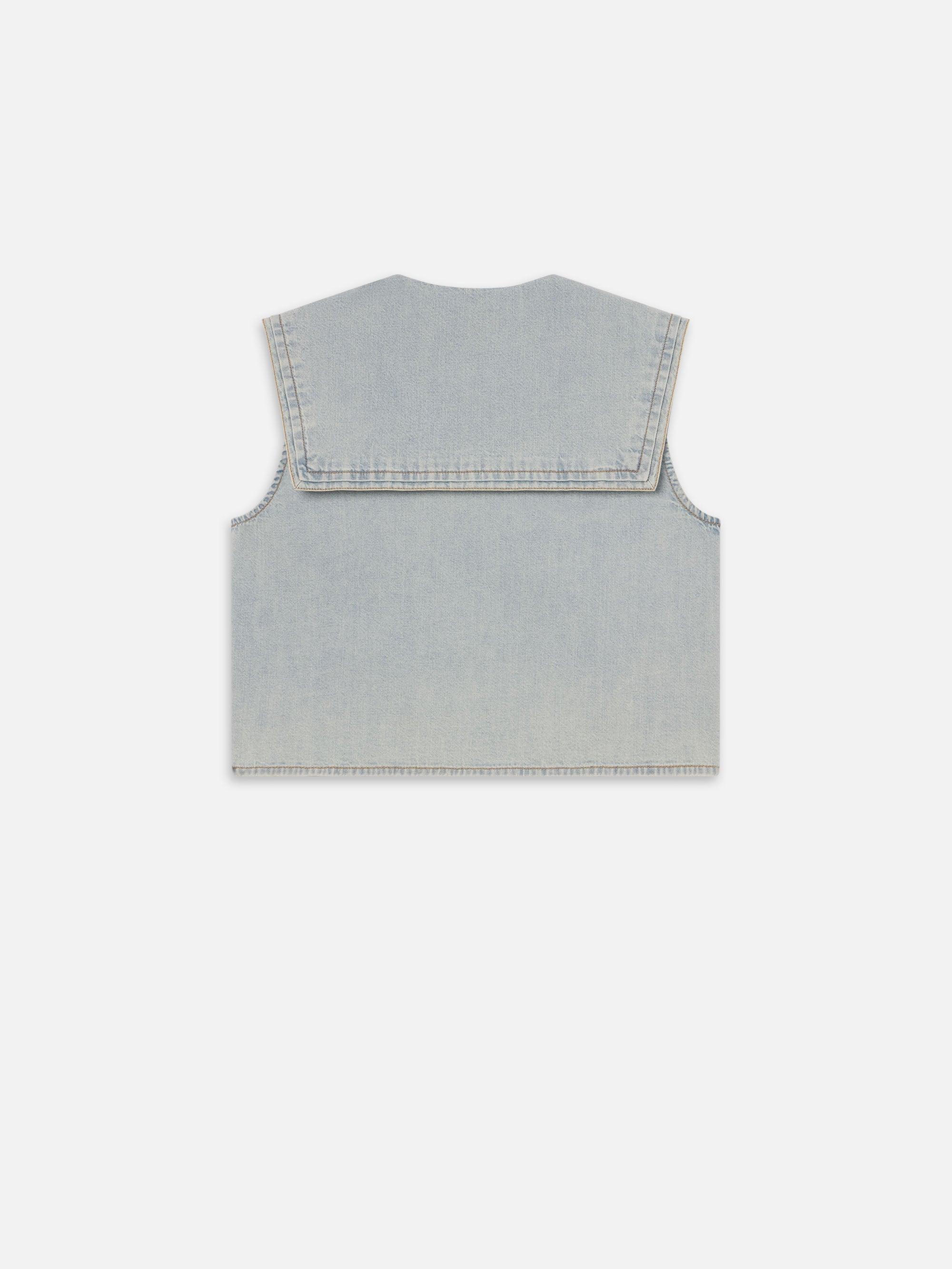 A sleeveless denim top with a wide sailor collar and a soft, sun-faded wash. Cropped to meet high-rise waistbands, it’s equal parts charming and relaxed—ready for the boat, brunch, or both.