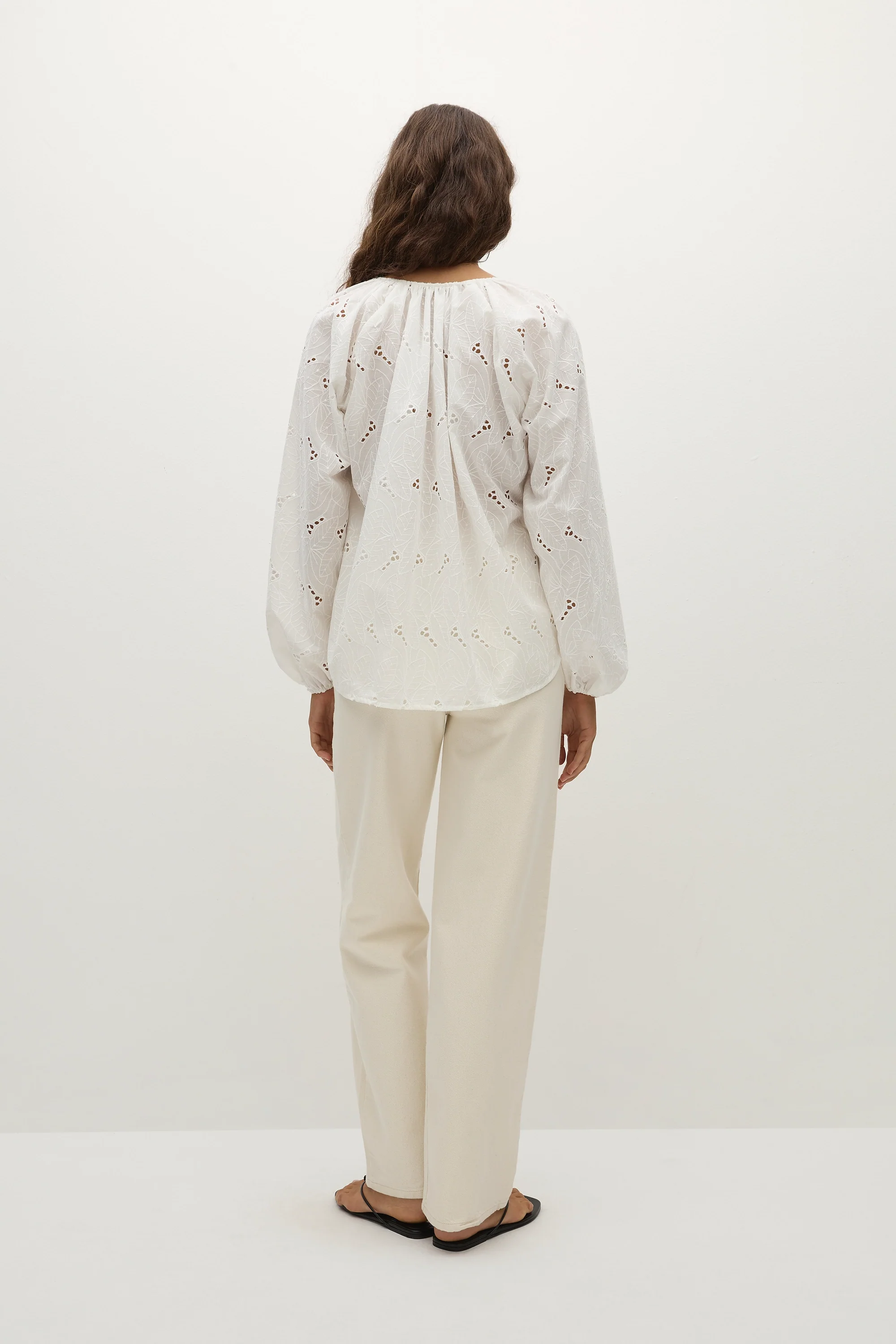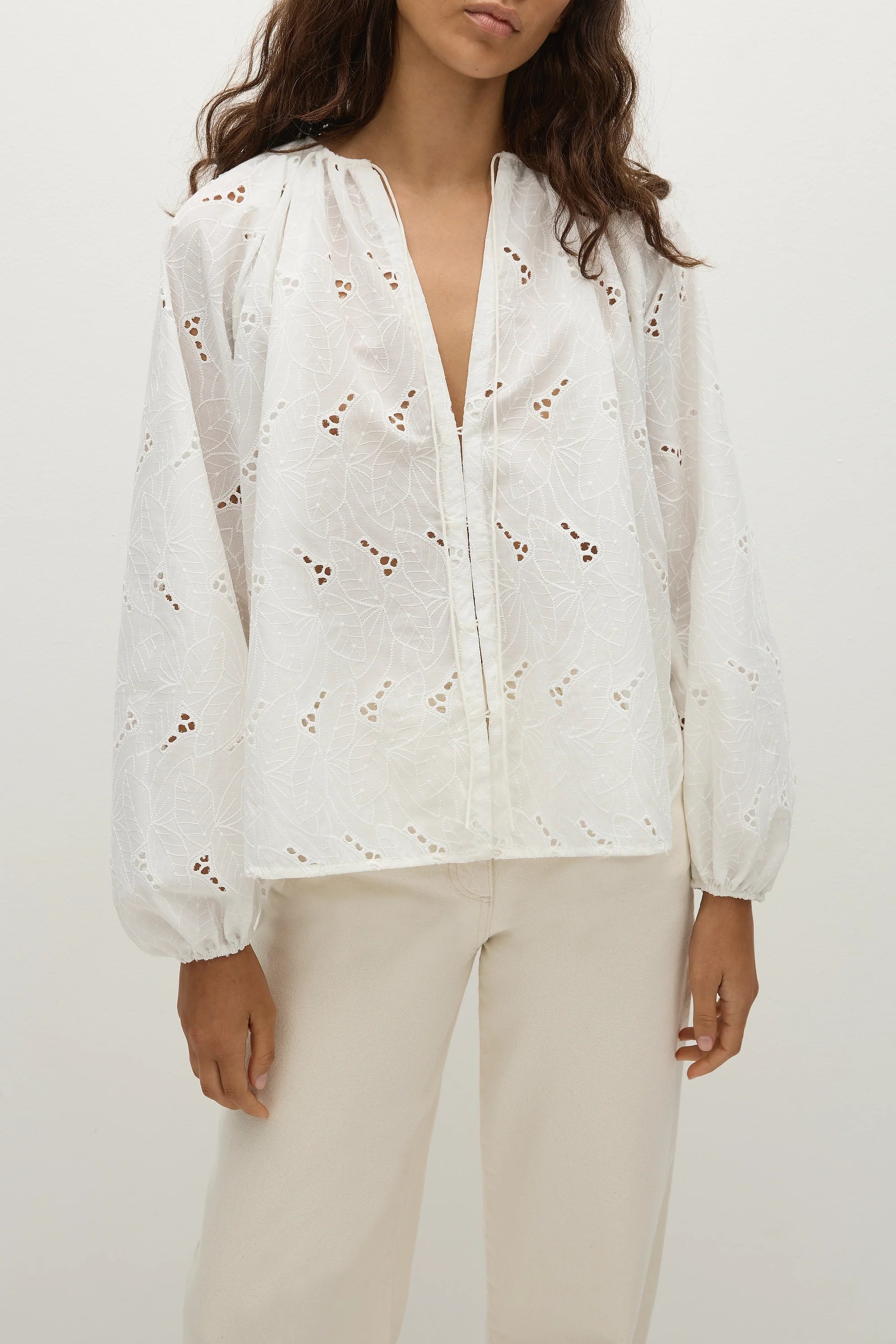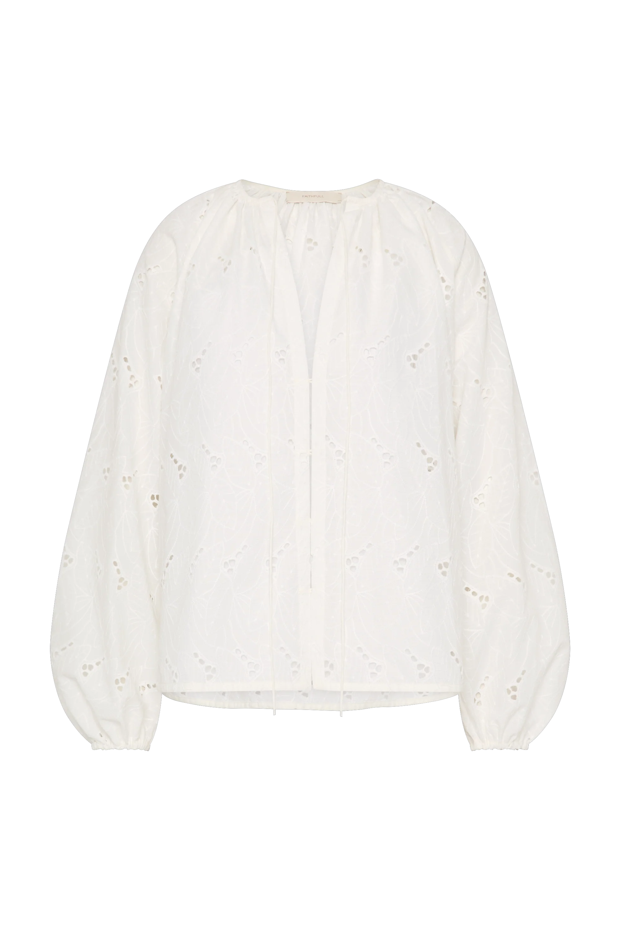 A blouse-style top with an open V-neckline and long balloon sleeves, elasticated at the cuff. There is a tie detail at the front neckline and clasps down the front so it can be worn closed over your FAITHFULL denim or open over swimwear. Offered in a soft cotton blend in a new white anglaise broderie, it is intended to be slightly oversized for a relaxed fit.