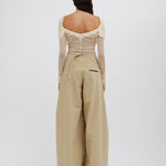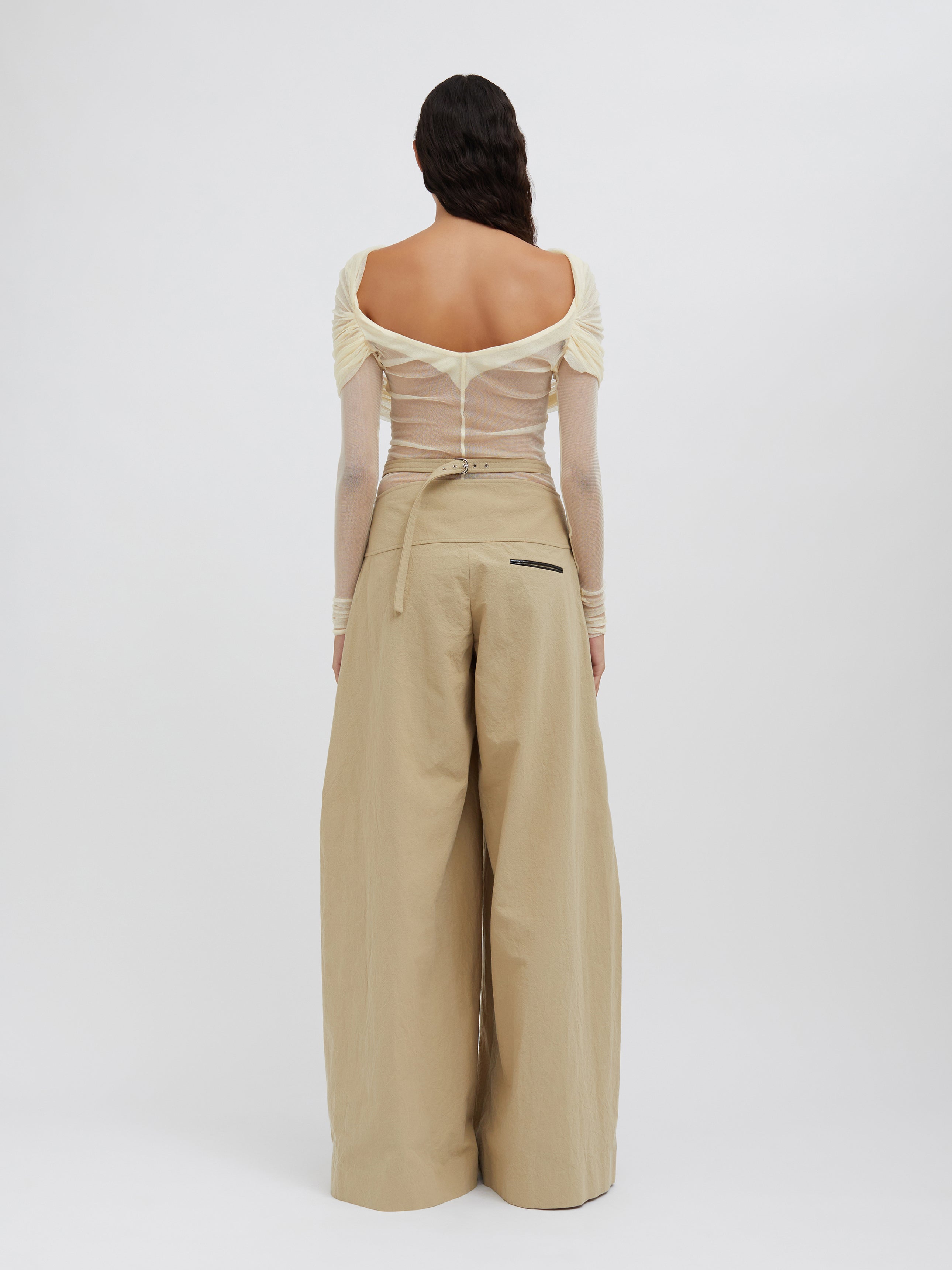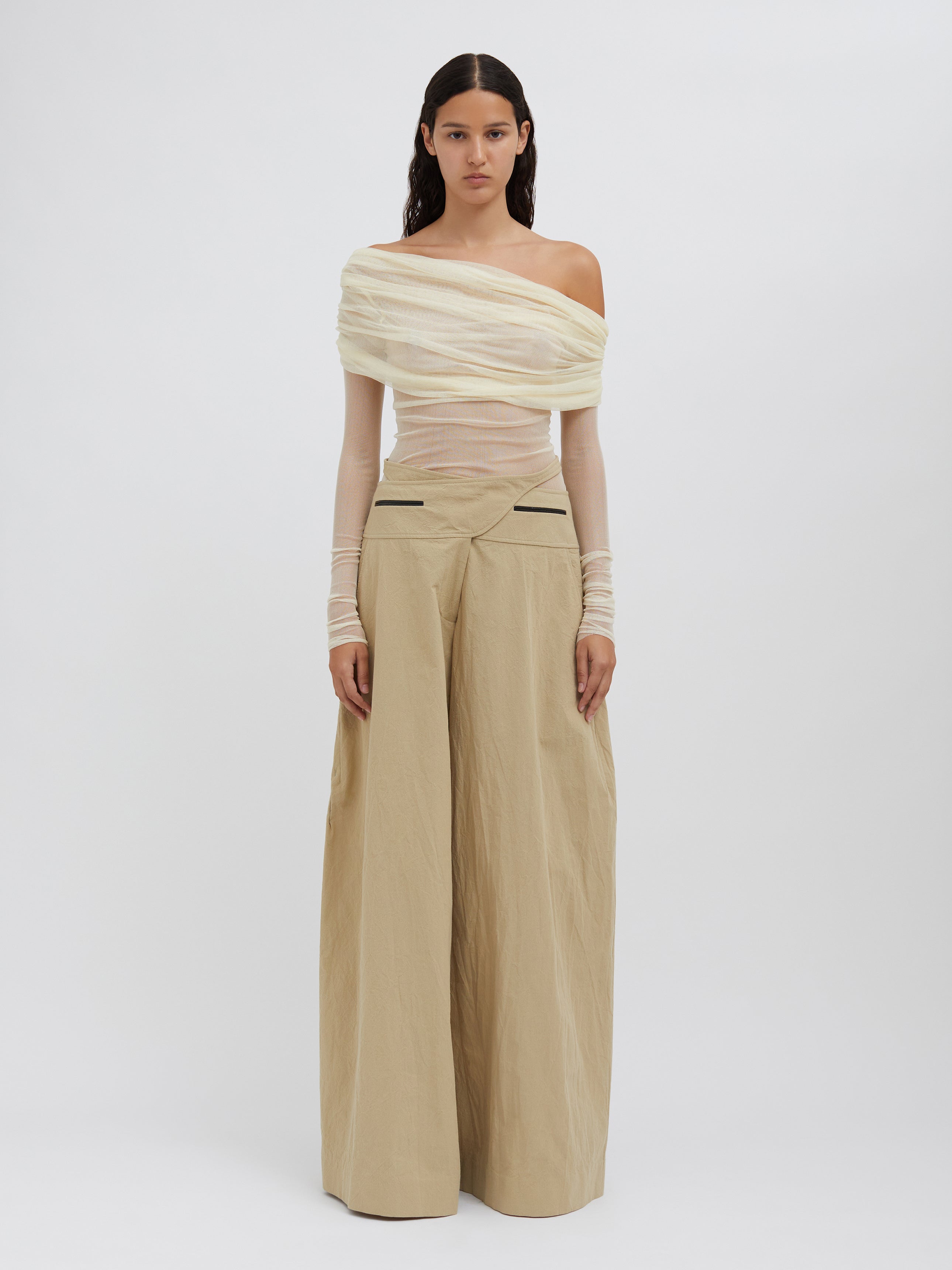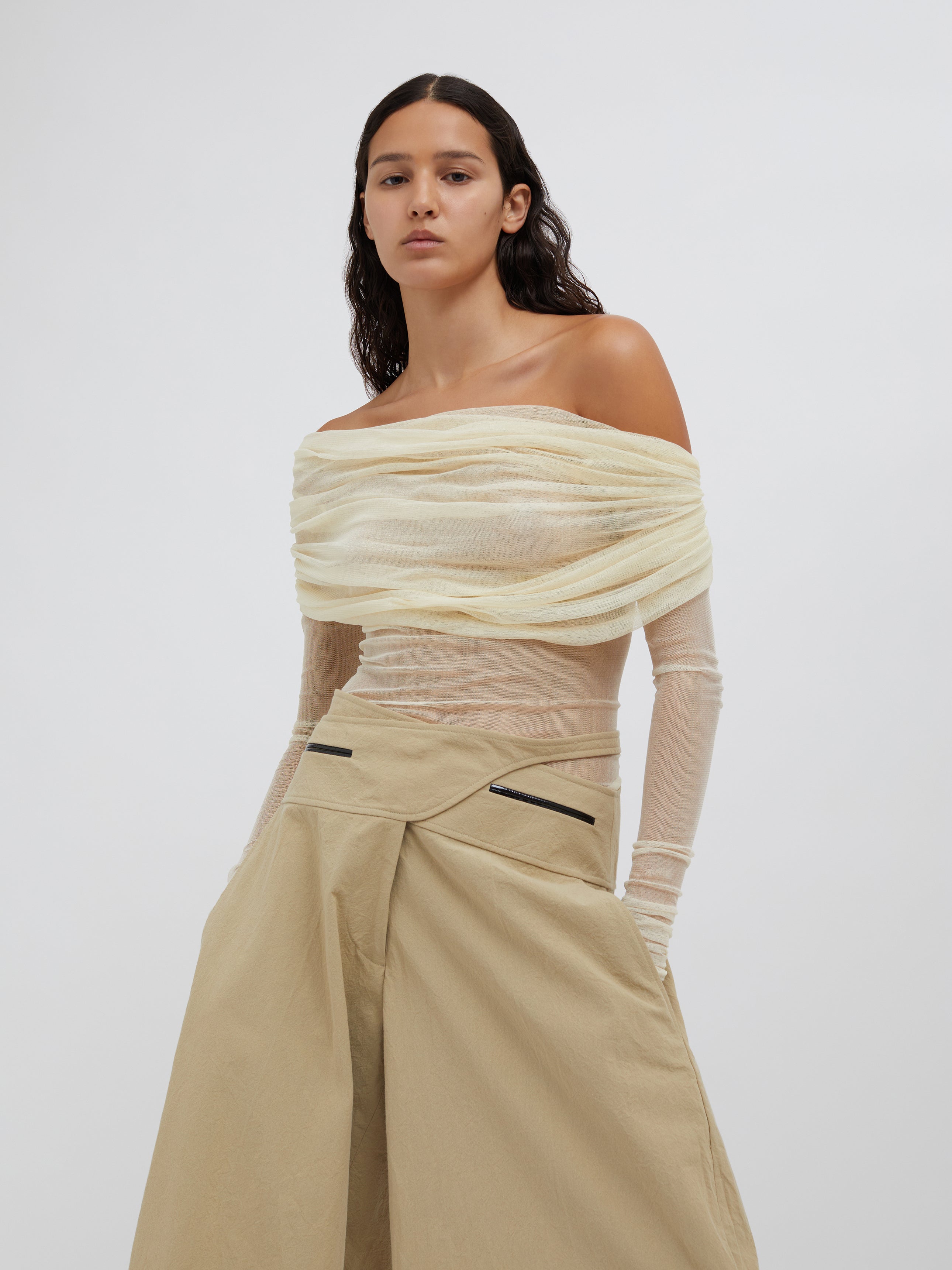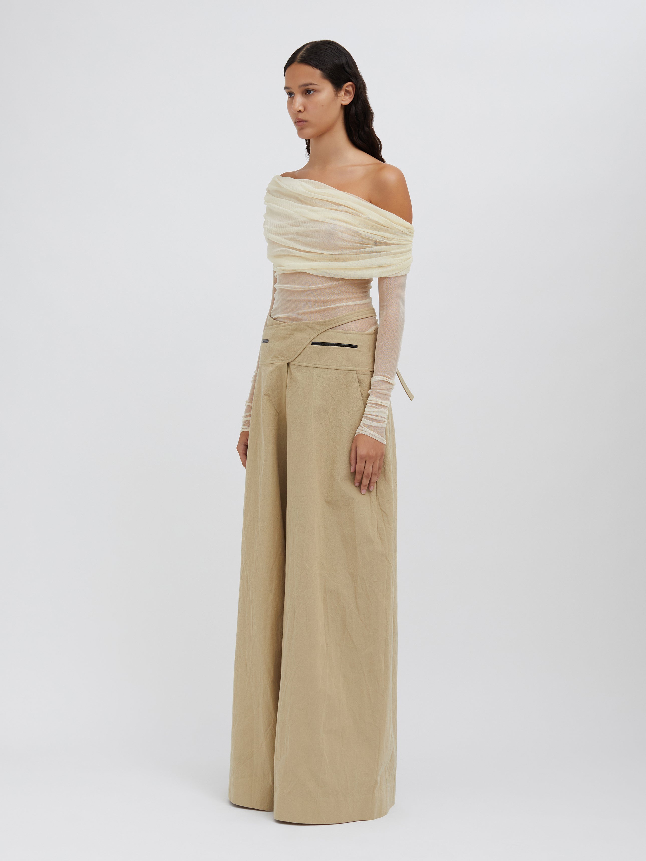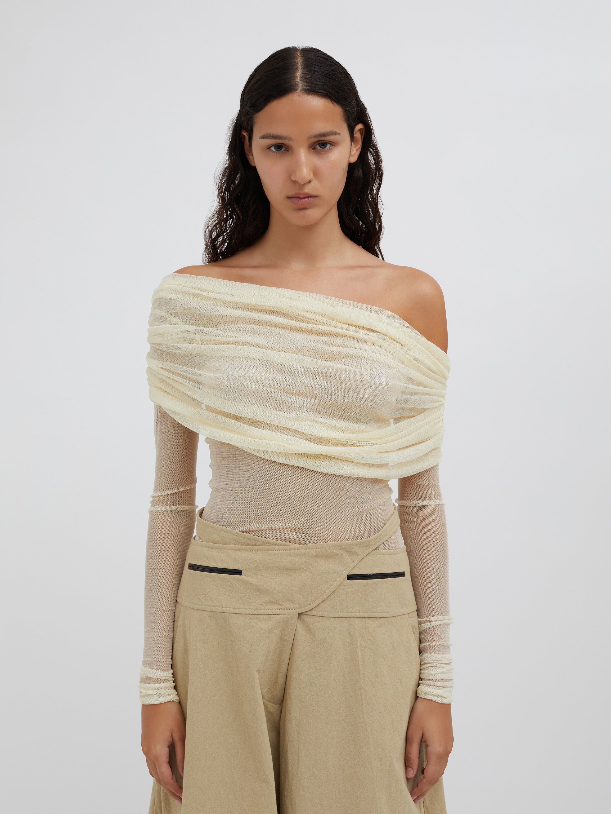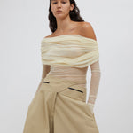 A signature Christopher Esber silhouette, the Veiled Top is worn off the shoulder and features a sheath of soft stretch silk tulle across the bust, which then offers transparency across the body. Designed to be worn with a tailored trouser or skirt, and a strapless bra for modesty.