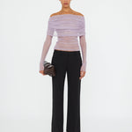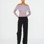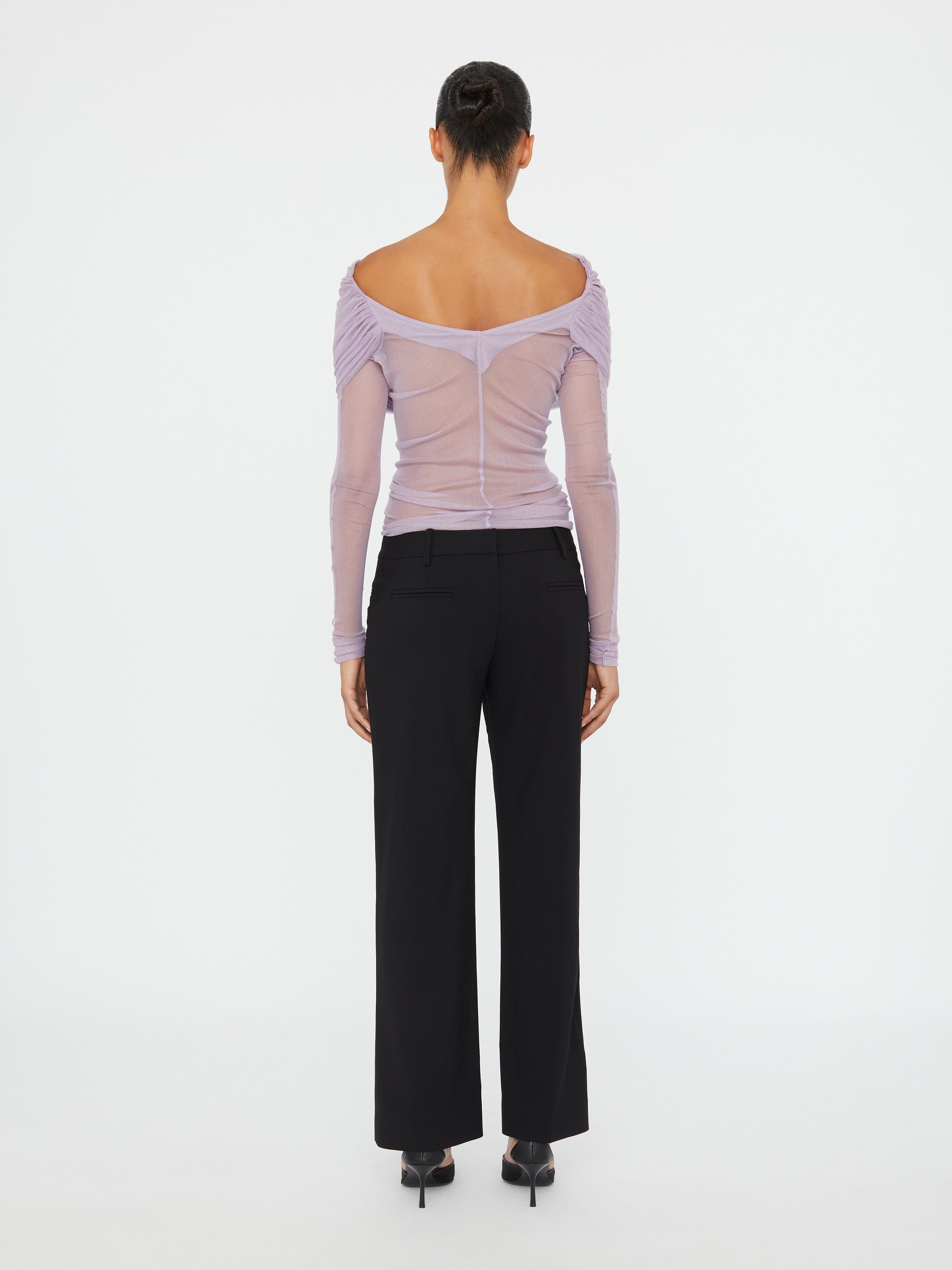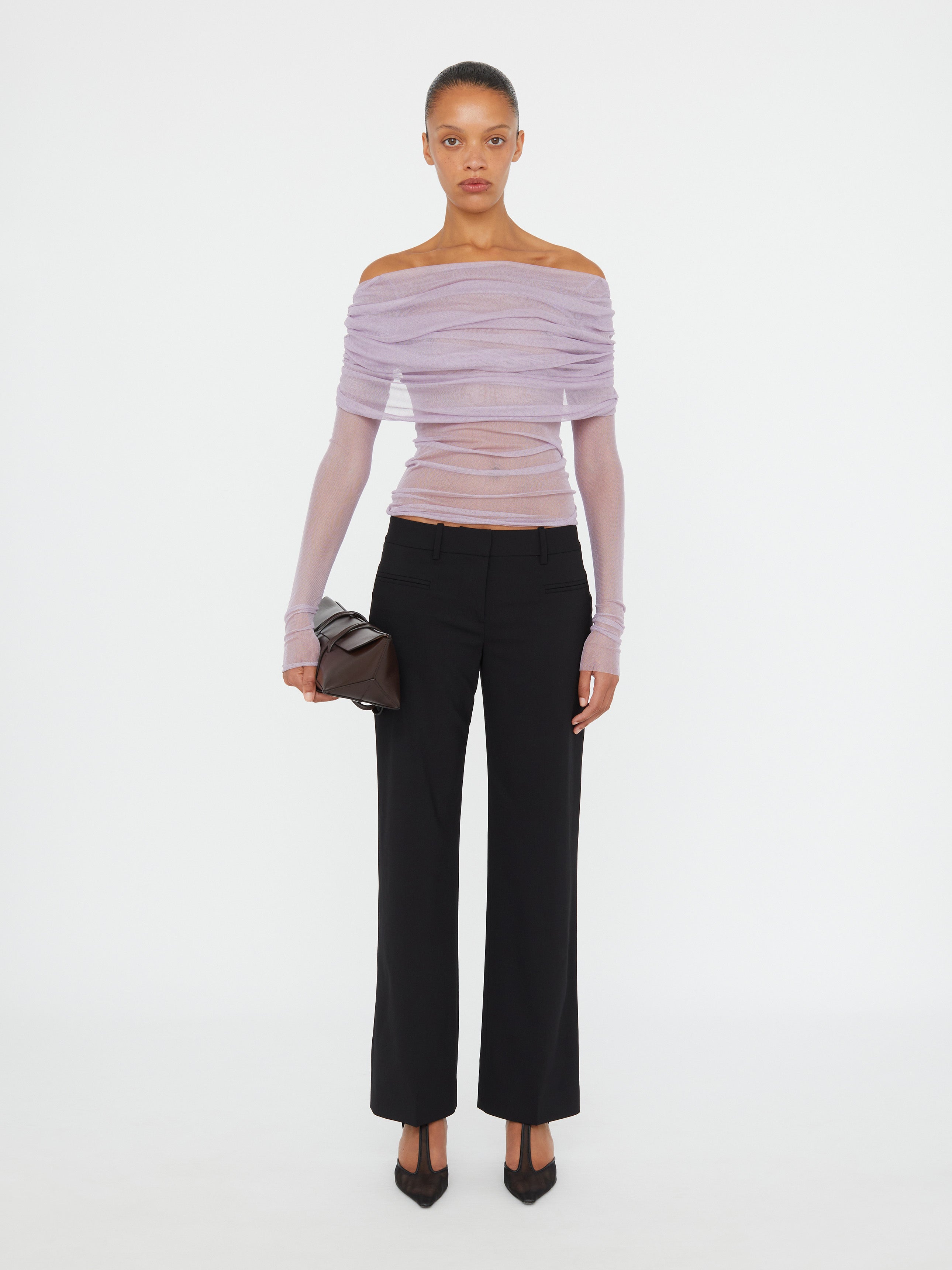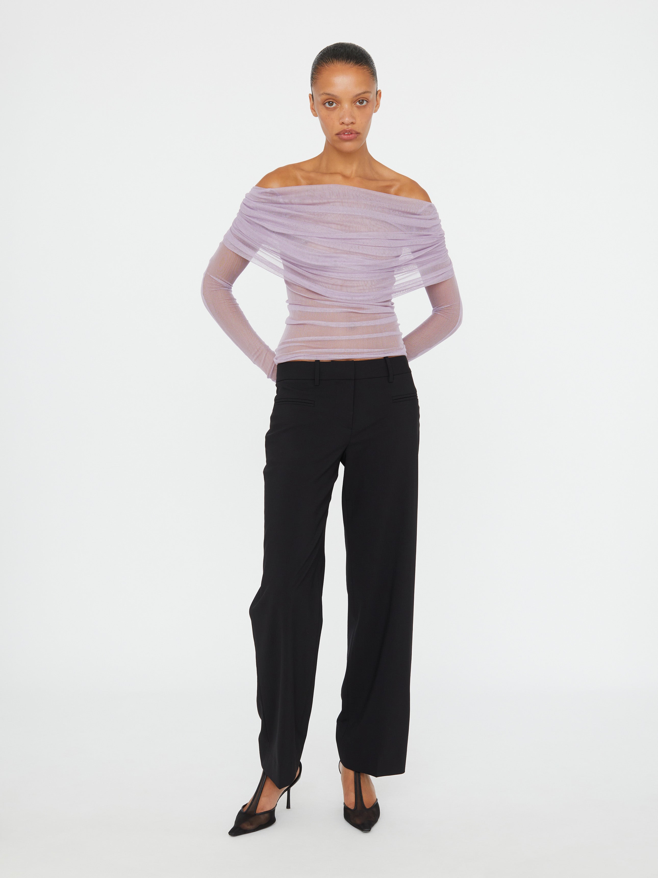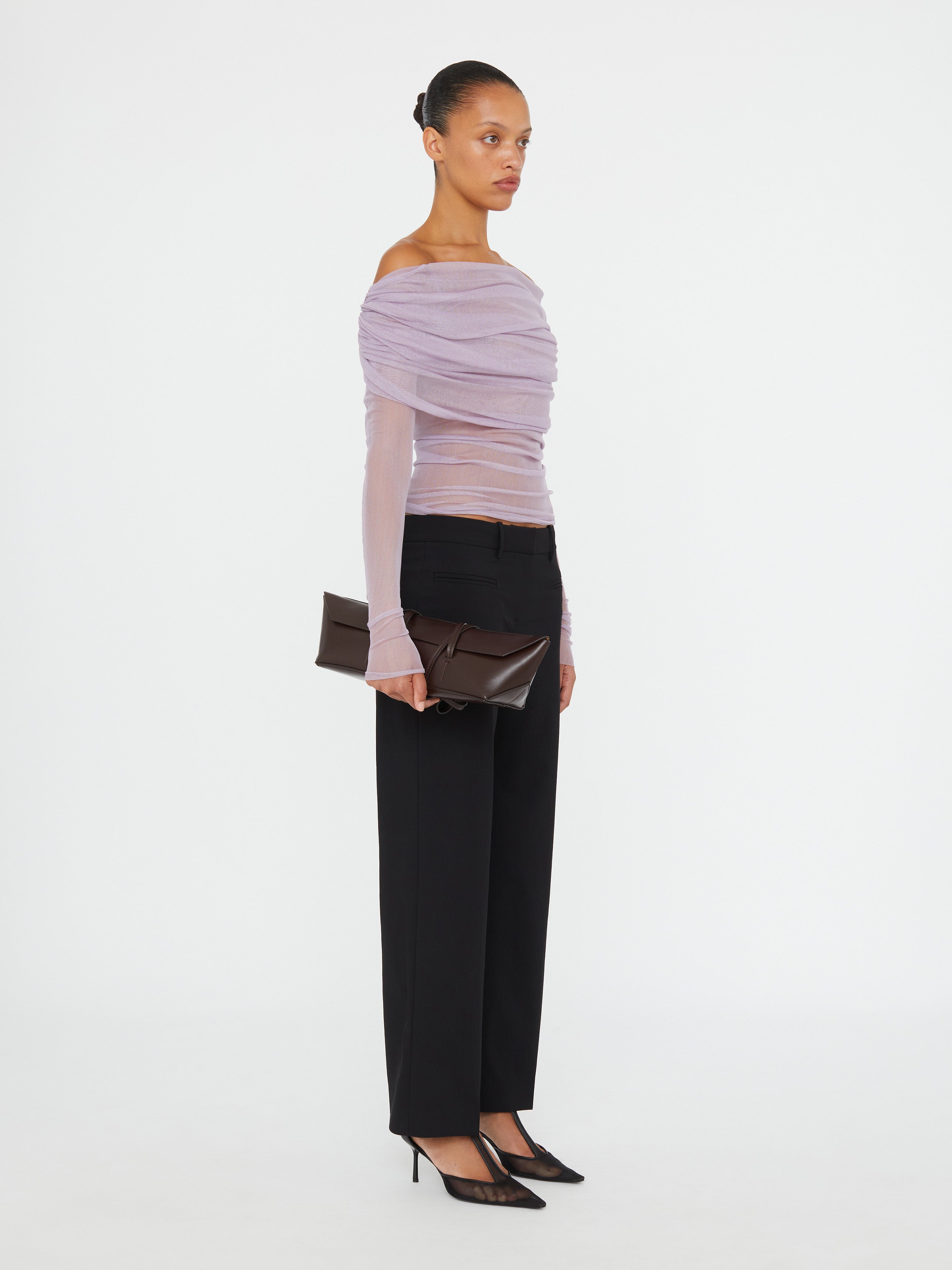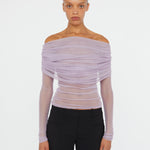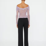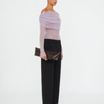 A Christopher Esber Icon introduced in a new season hue of Mauve. The Veiled Top is worn off the shoulder and features a sheath of soft stretch silk tulle across the bust, offering transparency across the body.