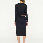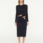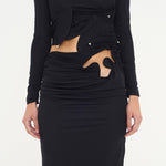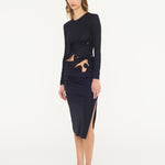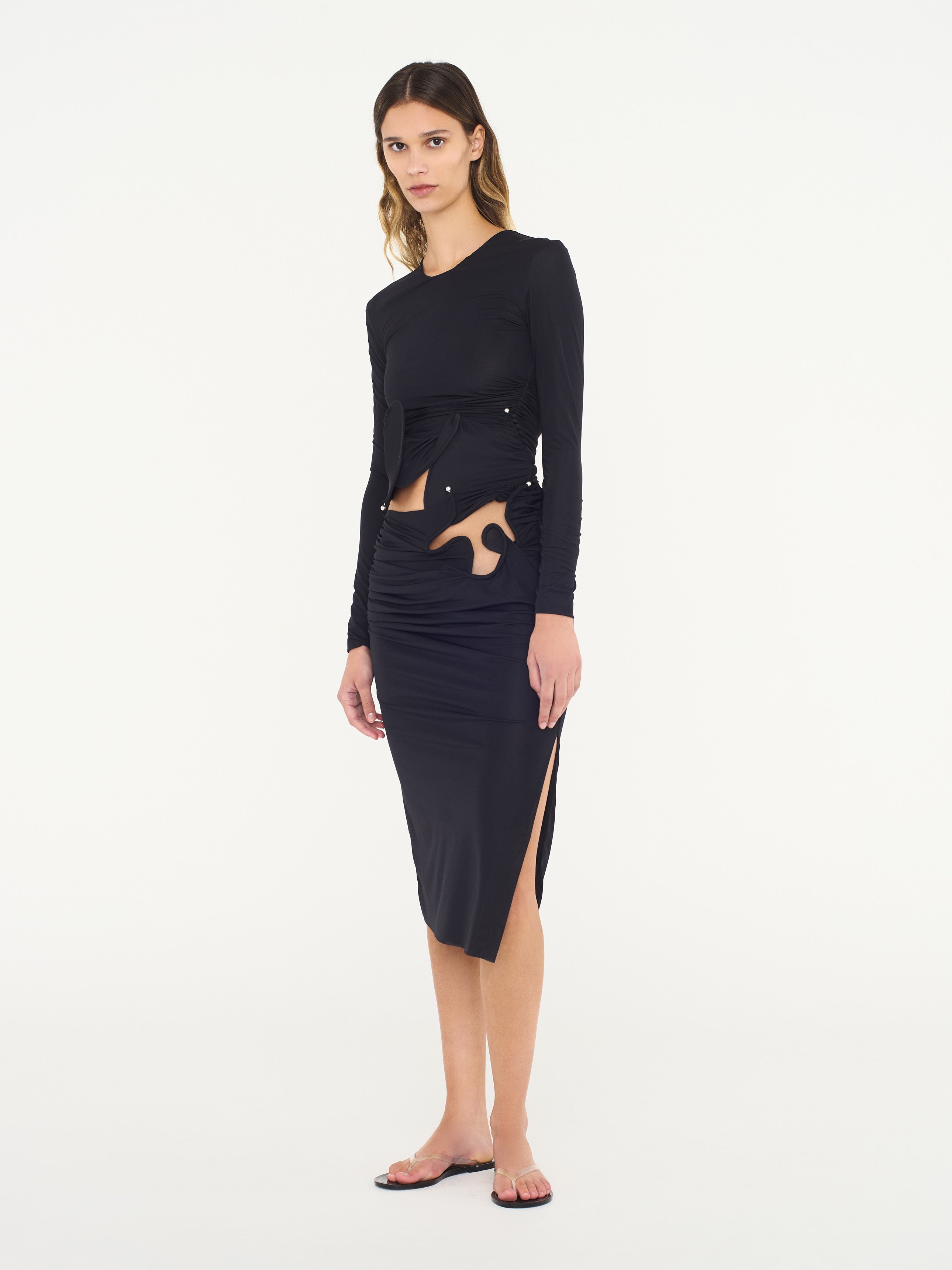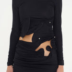 Sculptural hardware anchors fine Italian jersey to form around the body. Ruched gently at the side seams, this long sleeve top is finished with pearlescent studs.