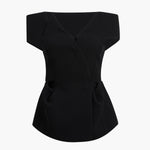A sleek and sculptural silhouette tailored in double-faced Italian crepe selected for its modern character and matte finish. Framed by deconstructed lapels and raw-edge seaming, this artfully asymmetric top gains its waist-defining peplum from hand tacking at the sides and back. Threaded latch closures, with concealed zipper at wrapped front.