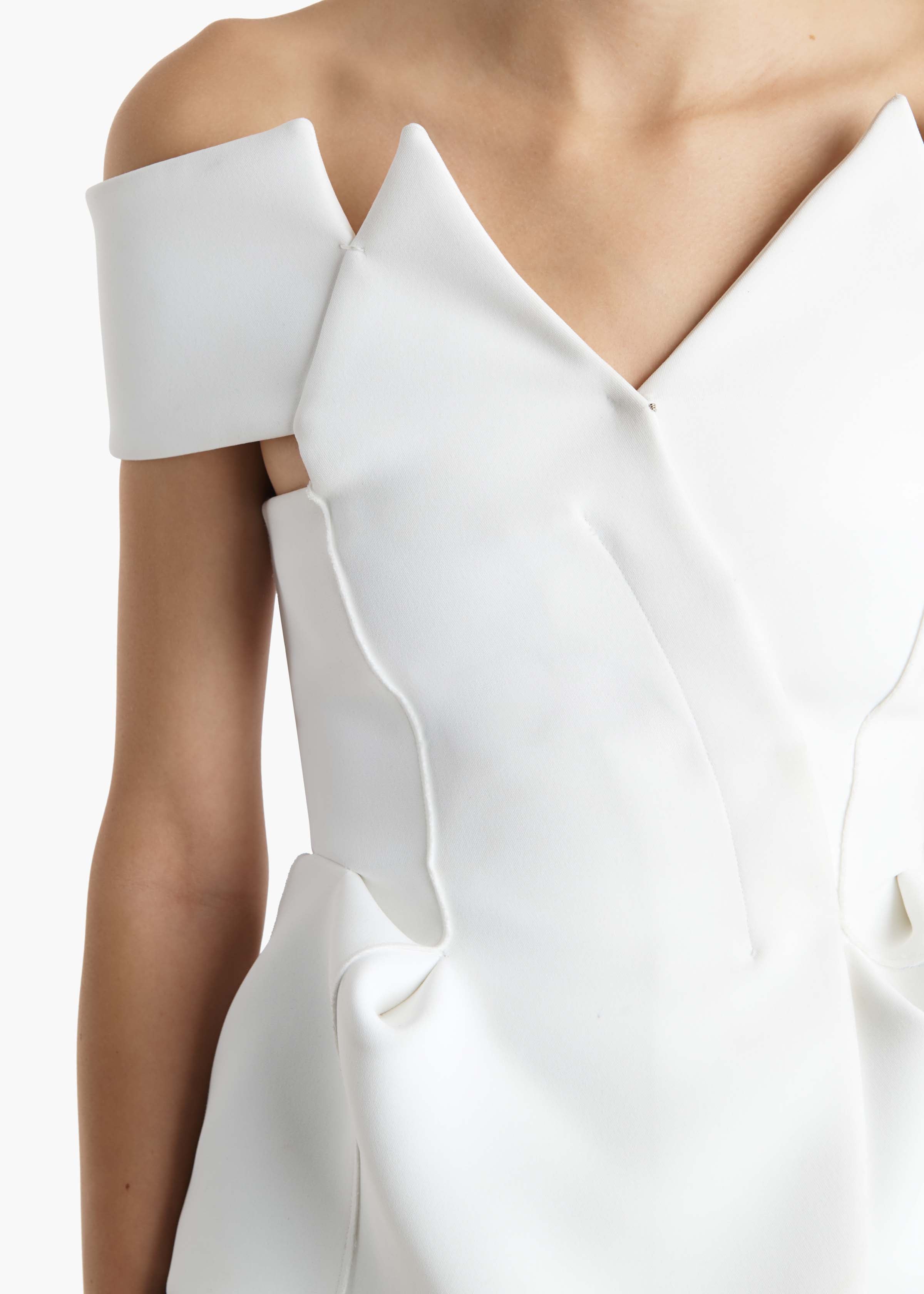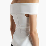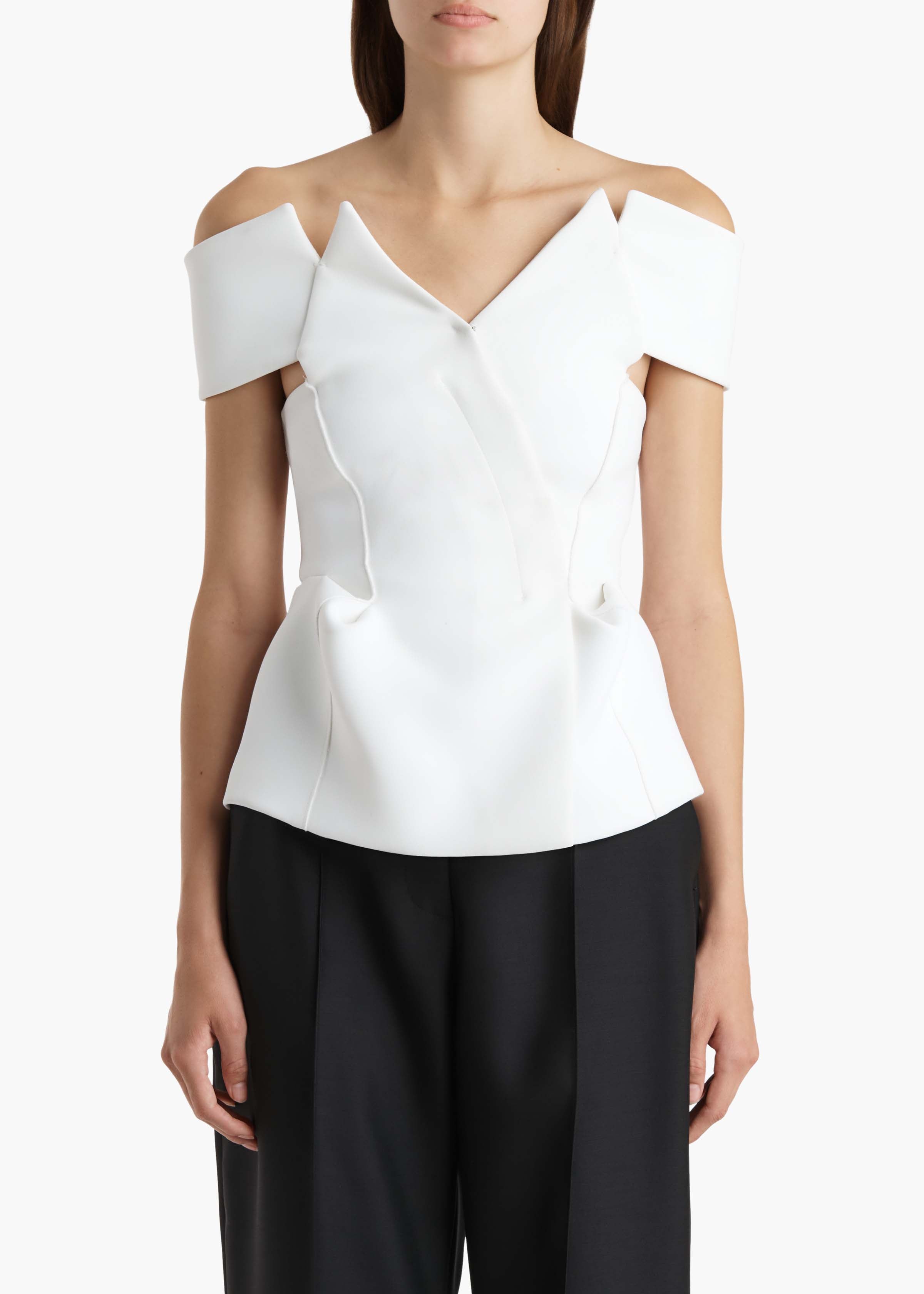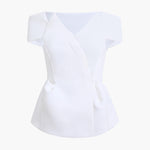 A sleek and sculptural silhouette tailored in double-faced Italian crepe selected for its modern character and matte finish. Framed by deconstructed lapels and raw-edge seaming, this artfully asymmetric top gains its waist-defining peplum from hand tacking at the sides and back. Threaded latch closures, with concealed zipper at wrapped front.