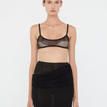 A delicate interplay of transparency and texture. A minimal bralette refined by floral embroidered cotton lace encased in binding. Featuring a soft, curved neckline and a straight hem, its semi-sheer construction is suspended from fine straps.