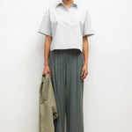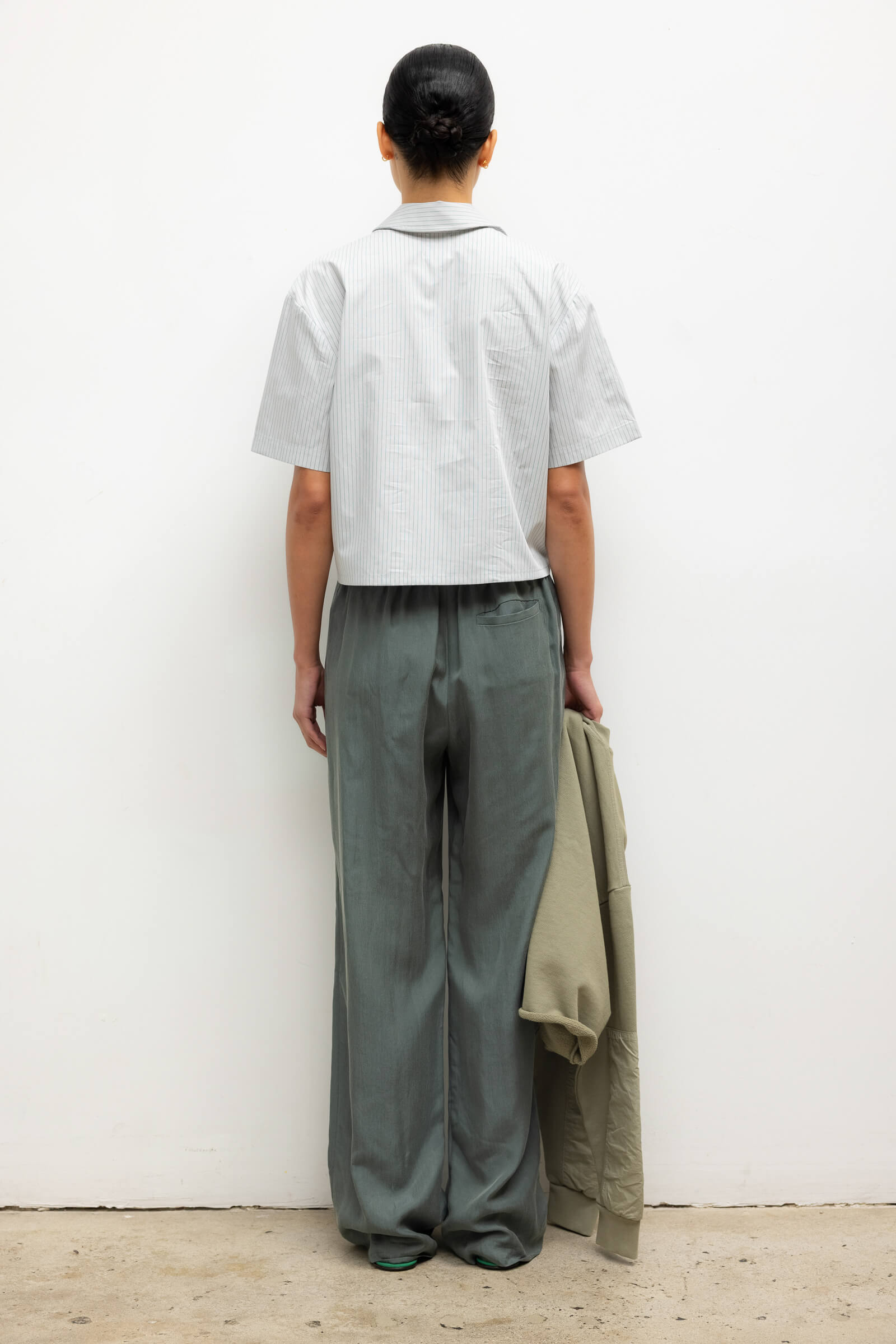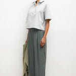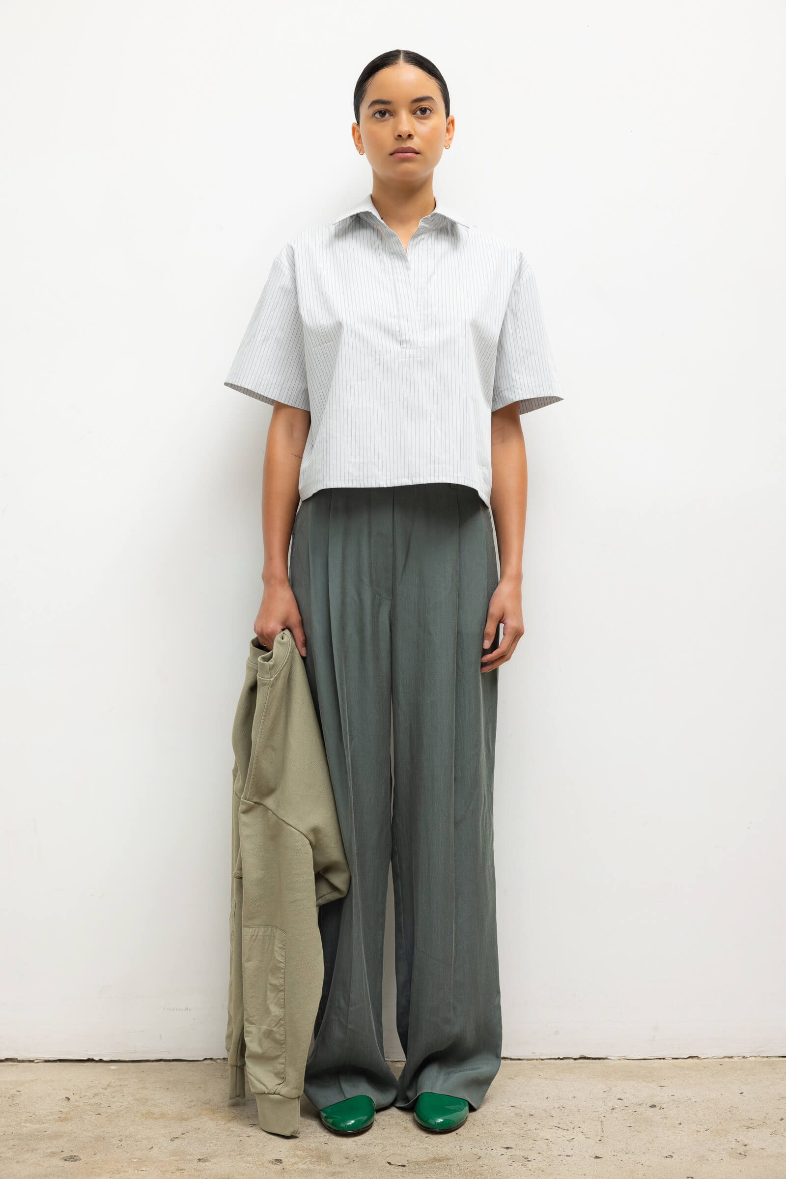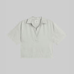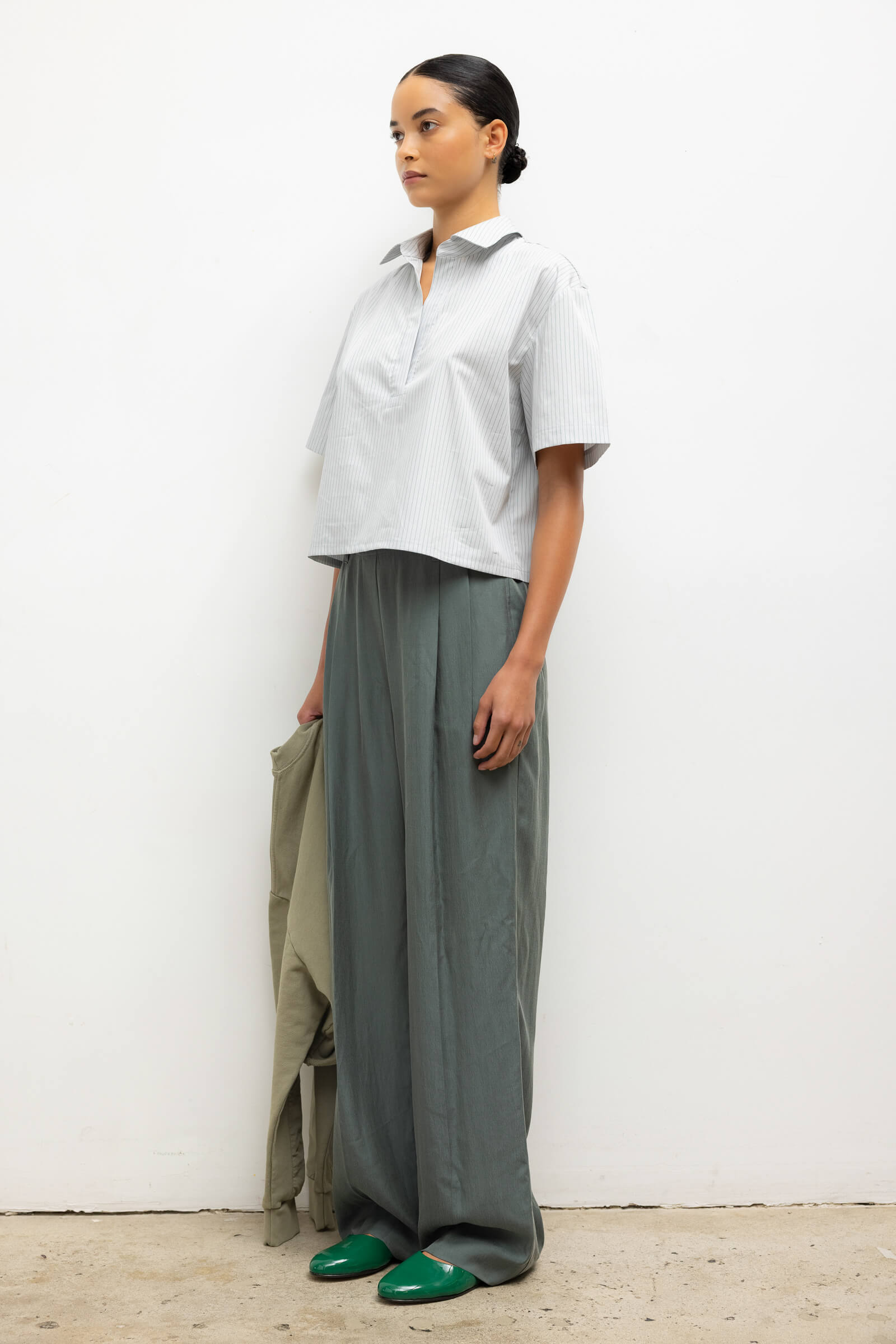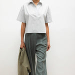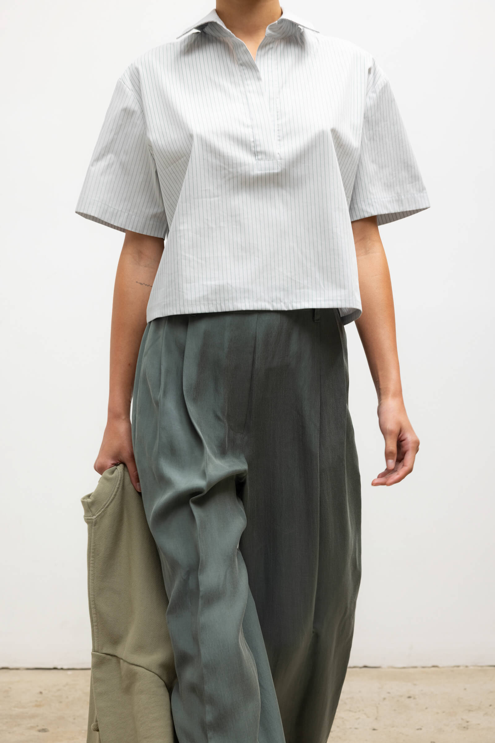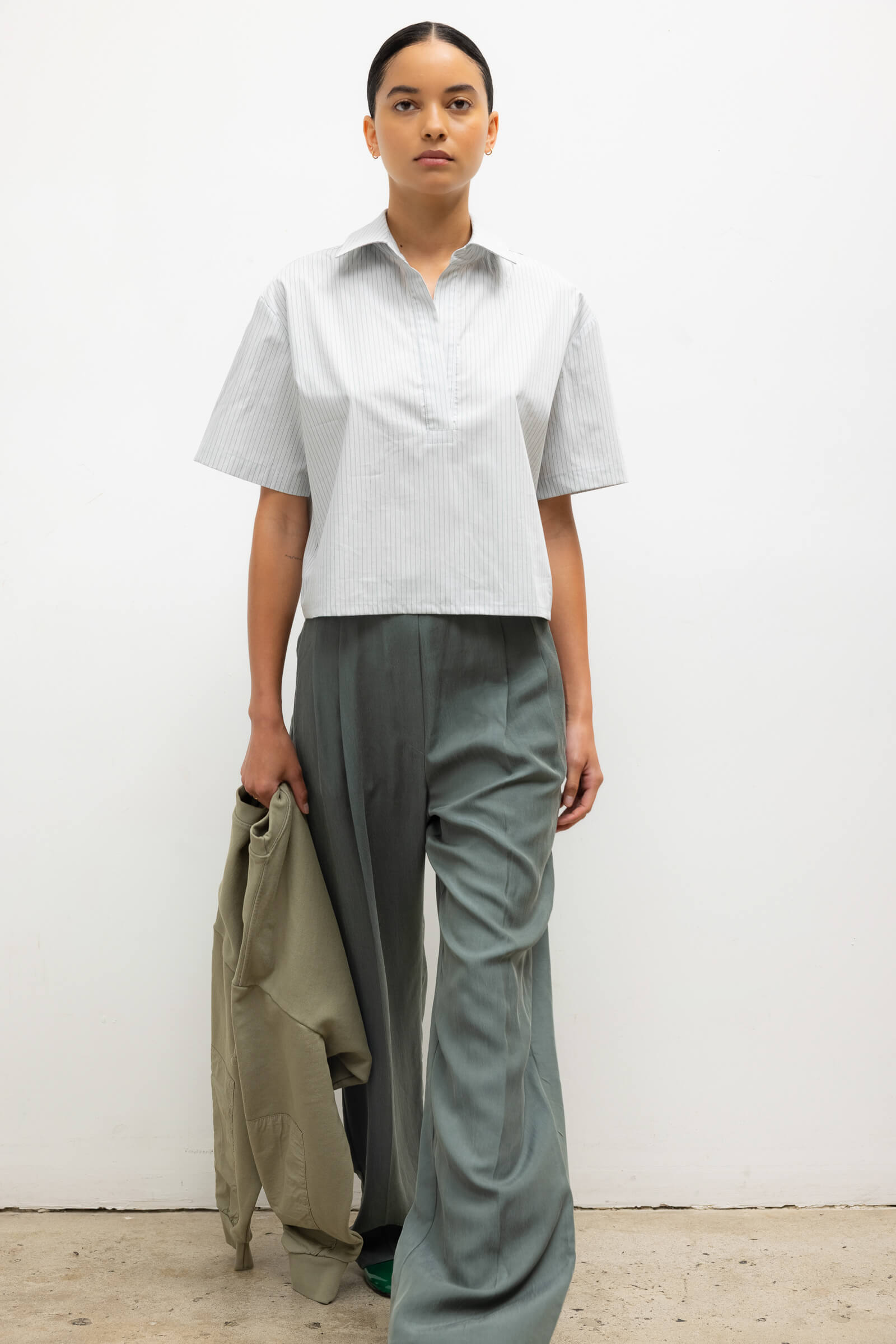 Cut in our Yoshi Cotton Twill, The Yoshi Stripe Short Sleeve Polo is a boxy silhouette that features a classic pointed collar with V neck and slightly elongated sleeve. Make it a matching set with any Yoshi Bottom.