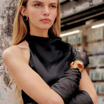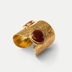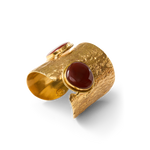 A cuff that makes a statement. Designed in Paris and handcrafted in India, the Ajourée cuff is made from 22k gold-plated brass with a hammered finish. Adjustable for ease, it’s defined by two bezel-set carnelian cabochons sourced from Jaipur. It’s part of our jewelry capsule with Parisian artist and designer Sylvia Toledano—colorful, meticulously crafted talismans that embody a luxe bohemian spirit and complement our Fall 2025 collection.