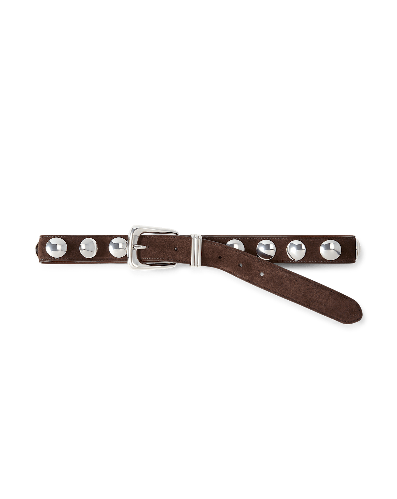 The classic brown suede belt—with a statement-making twist. Crafted from butter-soft Italian suede and lined in soft nubuck, the Arch belt features a thick silver prong buckle with a wide, ridged keeper. Along the length, silver studs add shine and dimension. Style with minimalist pieces to let the details stand out.