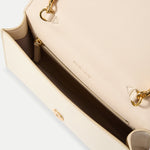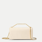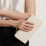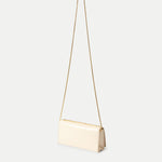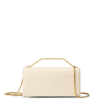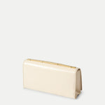 An elegant evening bag with a modern twist. Crafted from ecru patent leather, the Barre clutch is defined by its sleek, slim silhouette and collapsible gold-toned top handle. A magnetic snap closure and interior zip pocket keep essentials secure, while a removable snake chain crossbody strap adds versatility. It's the perfect finishing touch, from cocktail hour to black-tie.