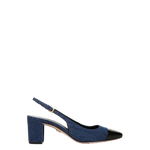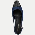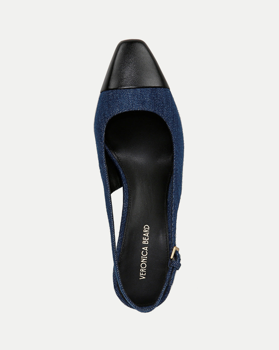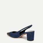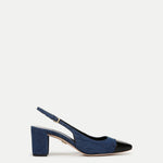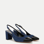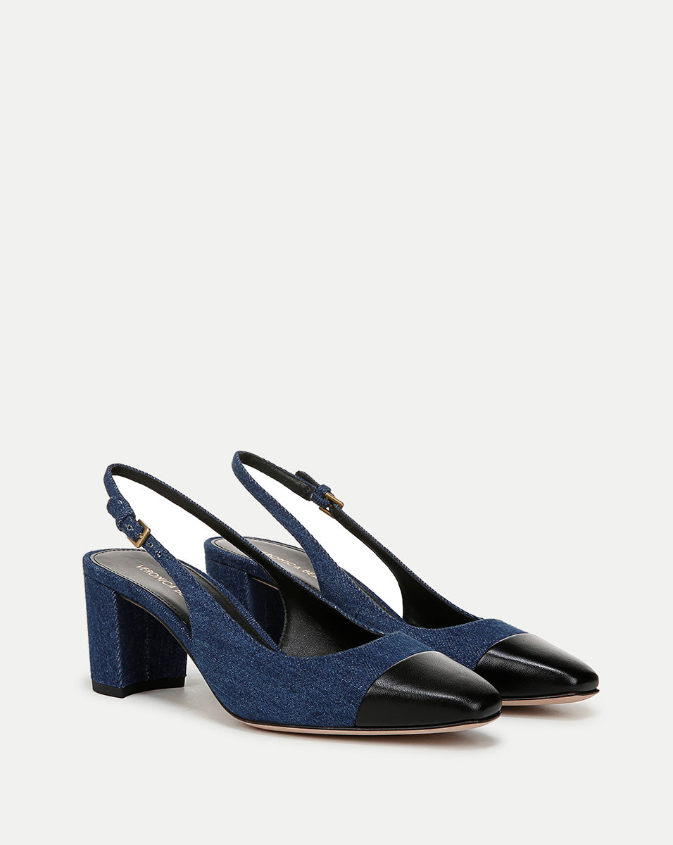 Meet the Cecile, our take on the classic cap-toe slingback now with a mid heel. Expertly crafted from chic denim and supple leather, this color-blocked style features a tapered leather square toe, a 2.5 inch block heel and an elasticized strap for comfort. Pair with jeans and a button-down—this adds instant polish.