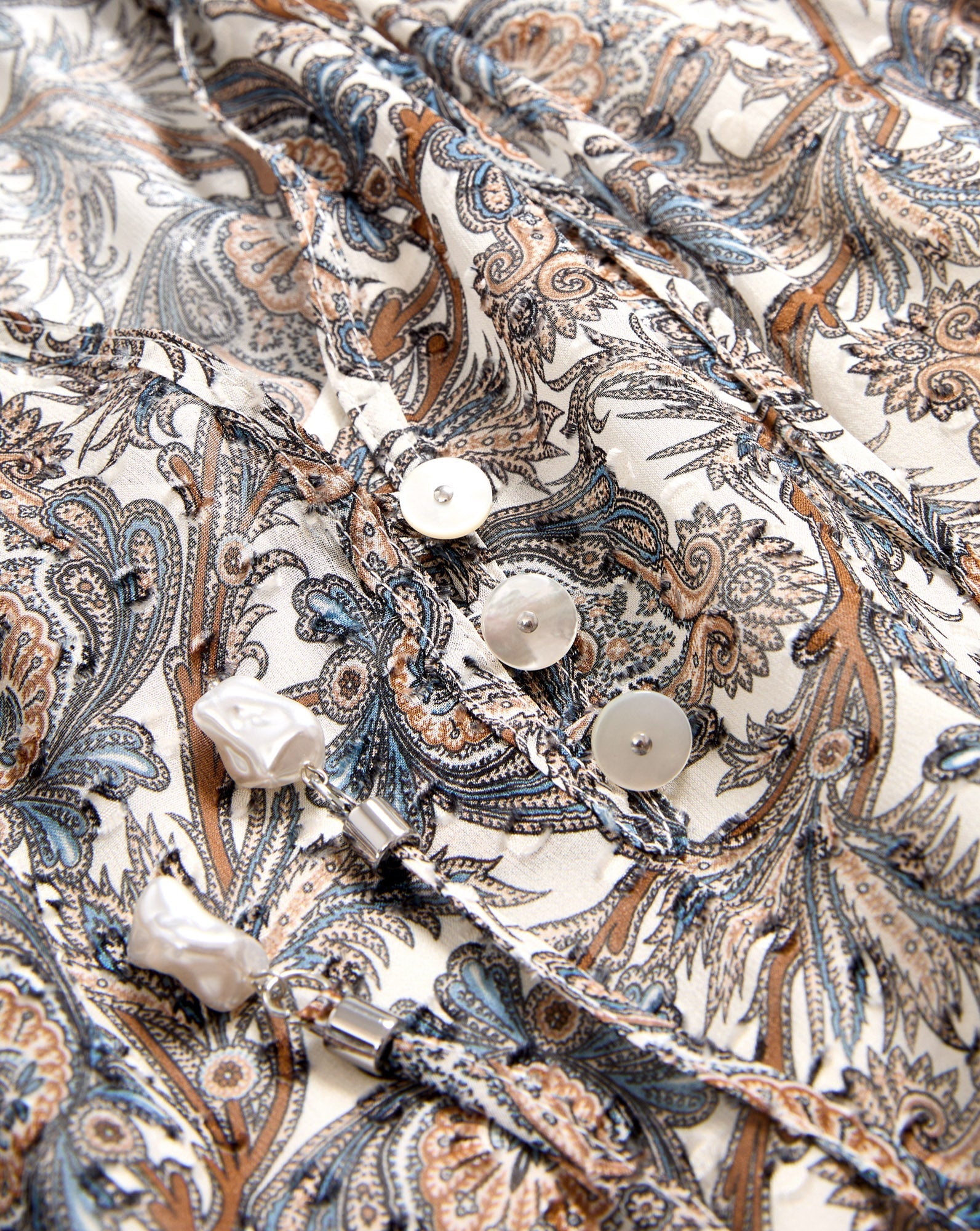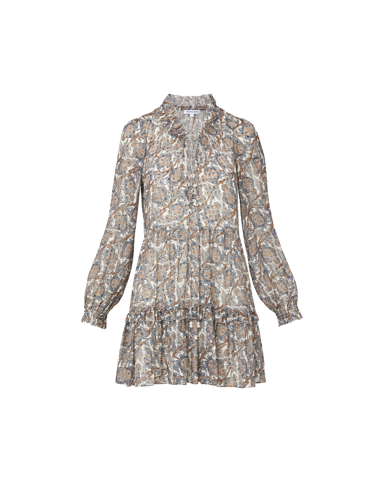Made from premium stretch silk in a bold paisley print, the Charles mini dress captures the spirit of bohemian chic. The relaxed tent silhouette and gently voluminous sleeves allow for ease while the flounce and decorative ruffles at the neck, flounce, and cuffs add a romantic touch. A self-tie neckline completes the look. Pair with sneakers or flats for an easy, one-and-done look that works from weekends to getaways.