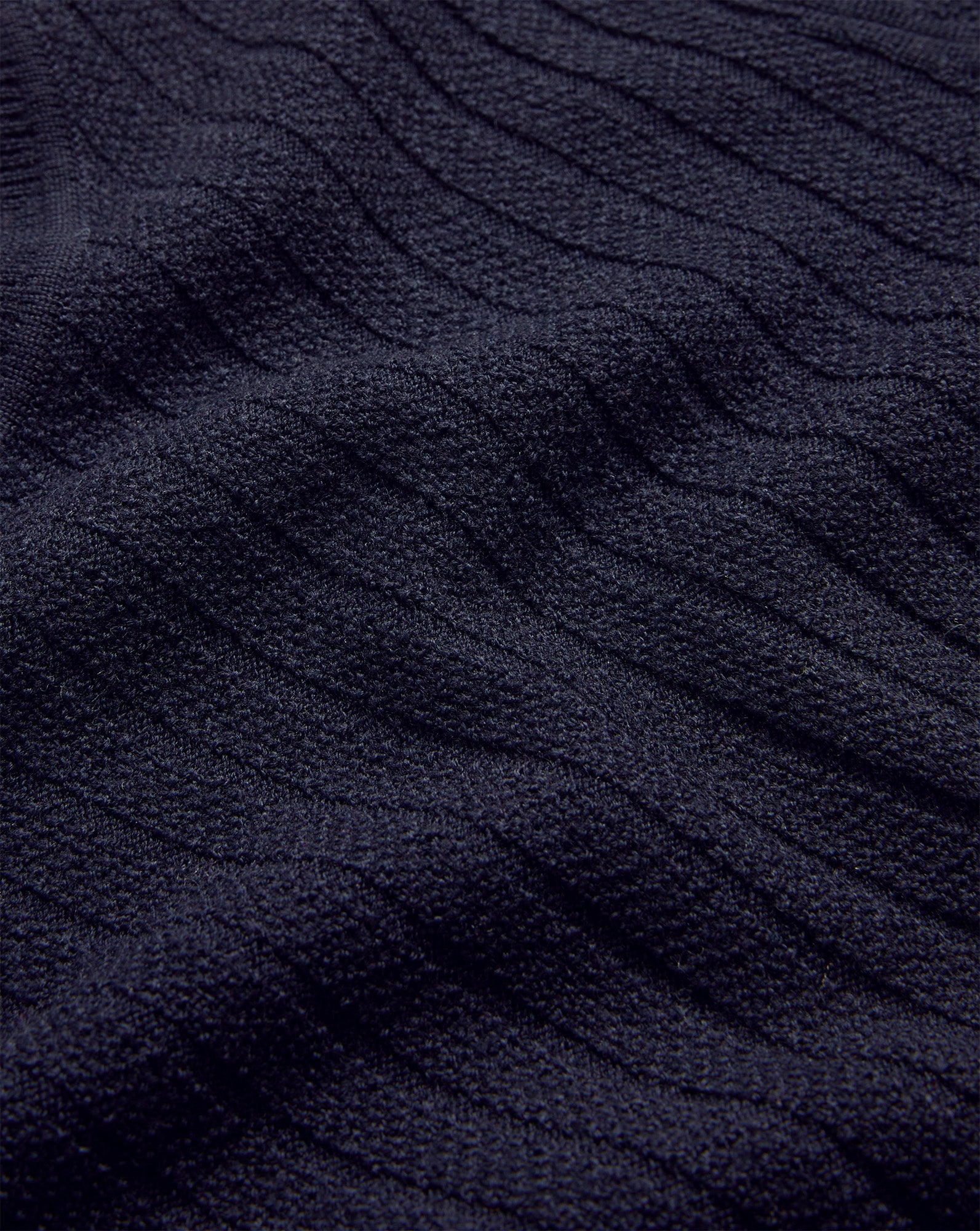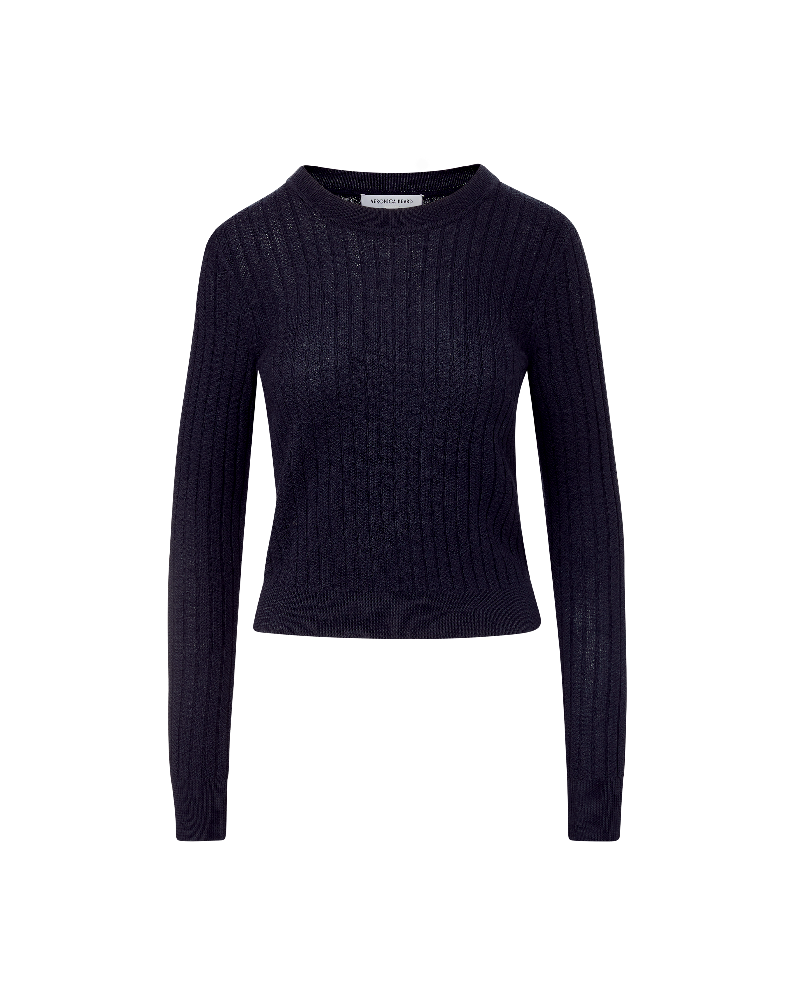 The summer sweater, perfected. Spun from exceptionally soft and lightweight Merino wool, the navy Cheval pullover features a slim fit, a classic crew neck, ribbed detailing, and elongated cuffs. Wear alone with jeans or a pencil skirt, or as a layering essential—it's a must-have for chilly offices and cool nights.
