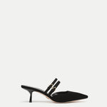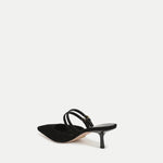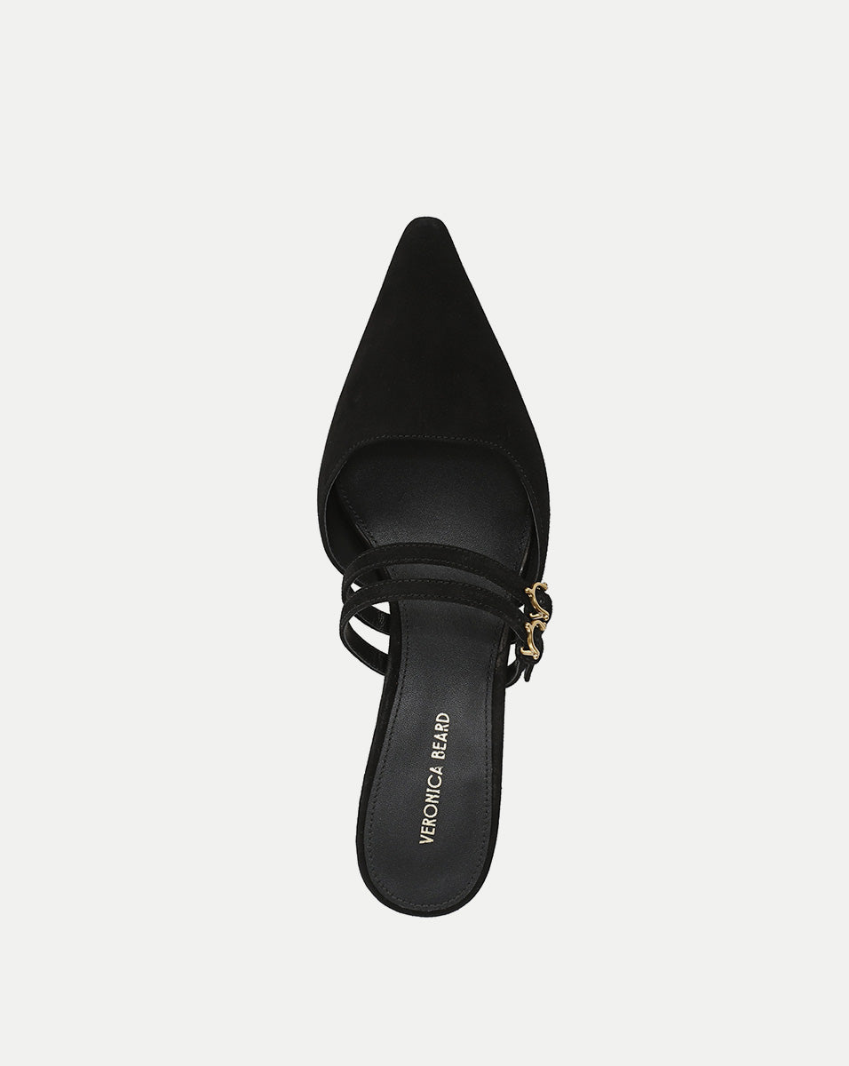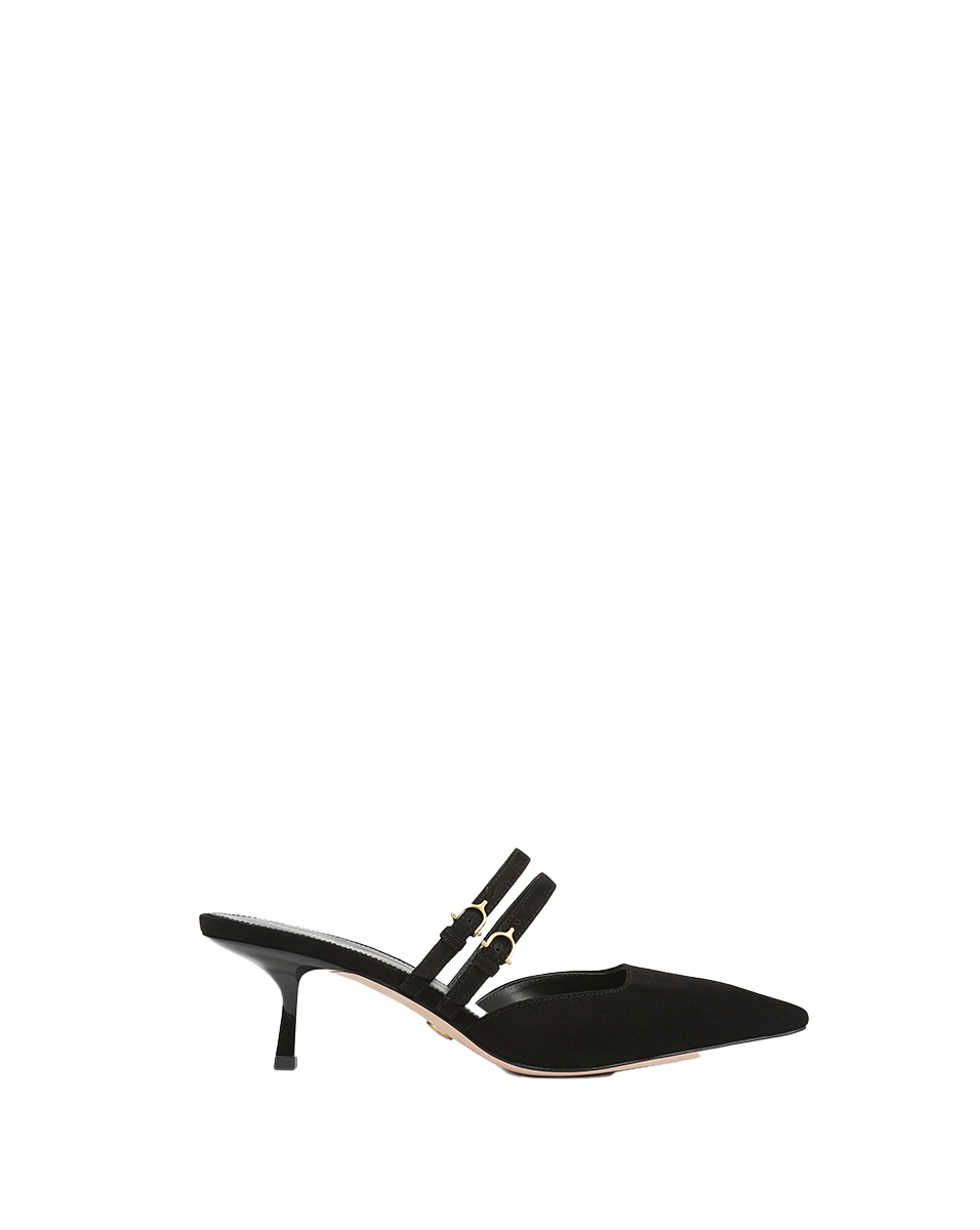 The chicest little kitten heel around. Crafted from rich black, butter-soft suede, the Corrie is a mule pump defined by a low, subtly squared vamp and double Mary Jane-style straps across the top of the foot. A two-inch heel and pointed snip toe complete the look. Pair with your favorite LBD for a night out, or with wide-leg denim for daytime luxe.