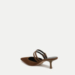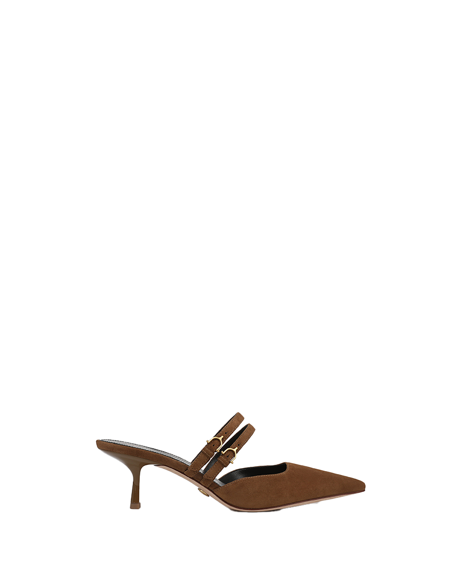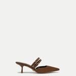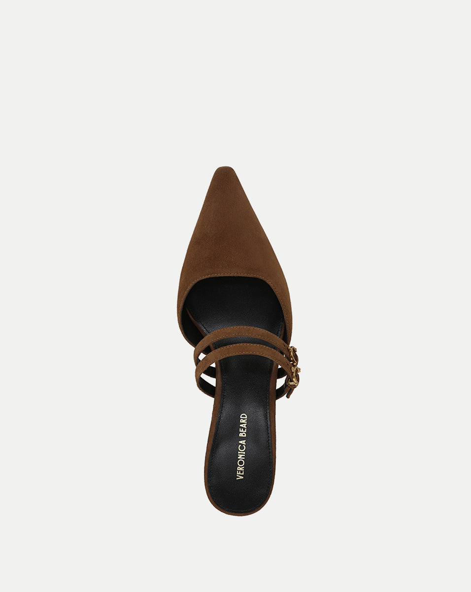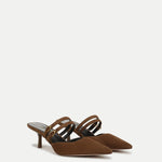 The chicest little kitten heel around. Crafted from rich brown, butter-soft suede, the Corrie is a mule pump defined by a low, subtly squared vamp and double Mary Jane-style straps across the top of the foot. A two-inch heel and pointed snip toe complete the look. Pair with your favorite LBD for a night out, or with wide-leg denim for daytime luxe.
