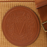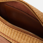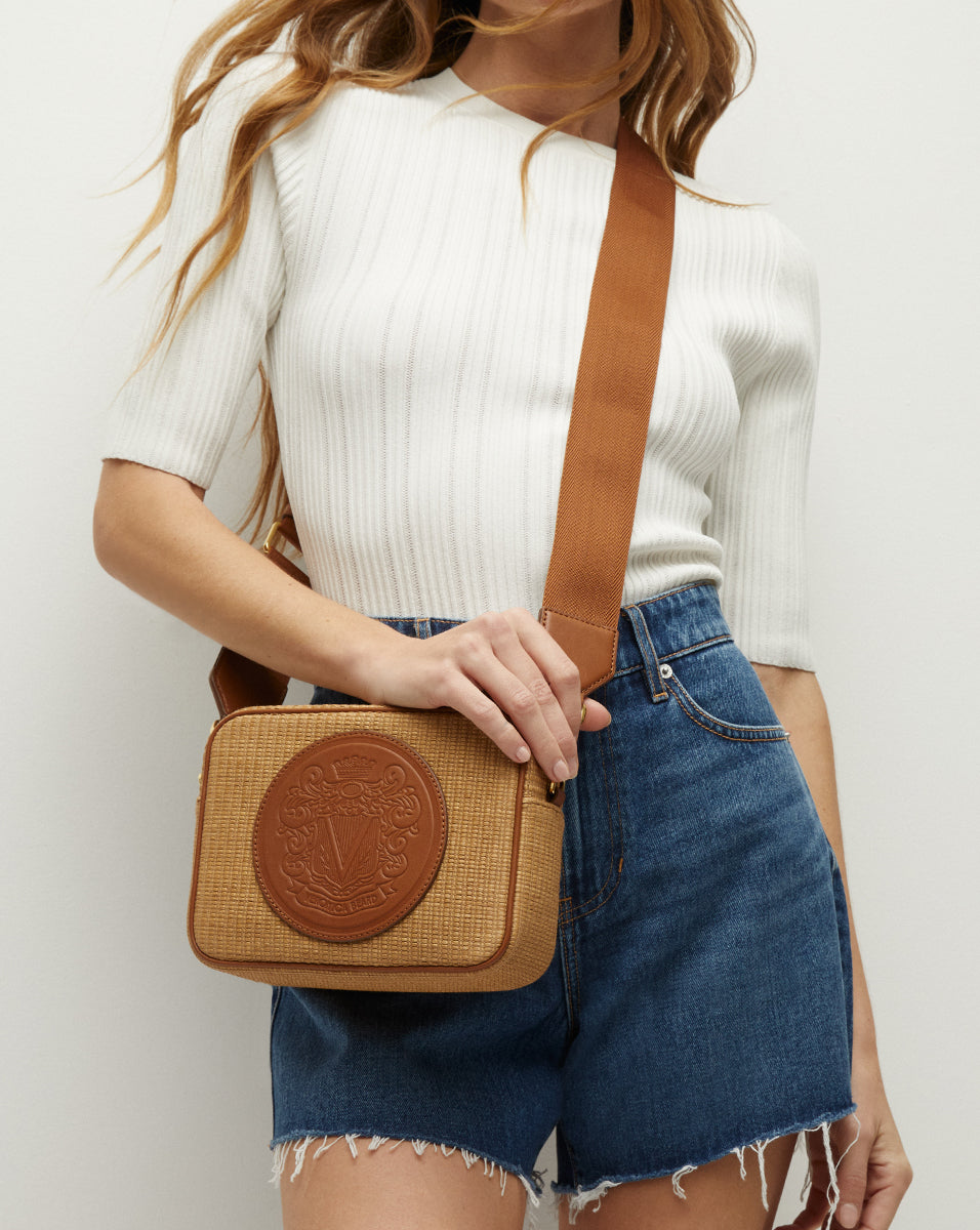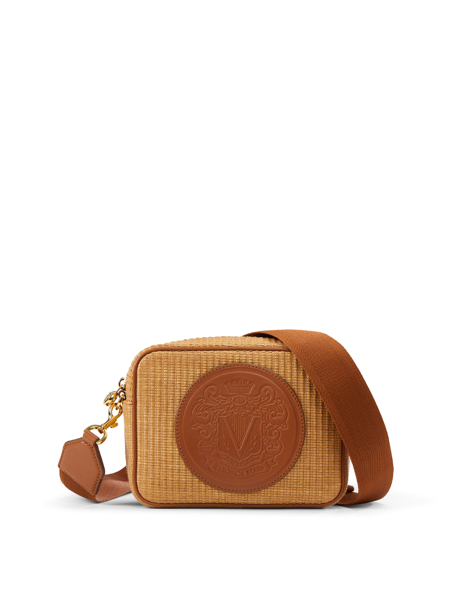 The iconic camera bag shape, through the VB lens. Softly structured in luxury raffia, it has a removable webbing strap—allowing it to be worn as a shoulder bag or as a clutch. An interior pocket and embossed leather crest patch finish the look. Sized to fit all your everyday essentials, it’s the perfect desk to date night handbag.