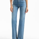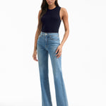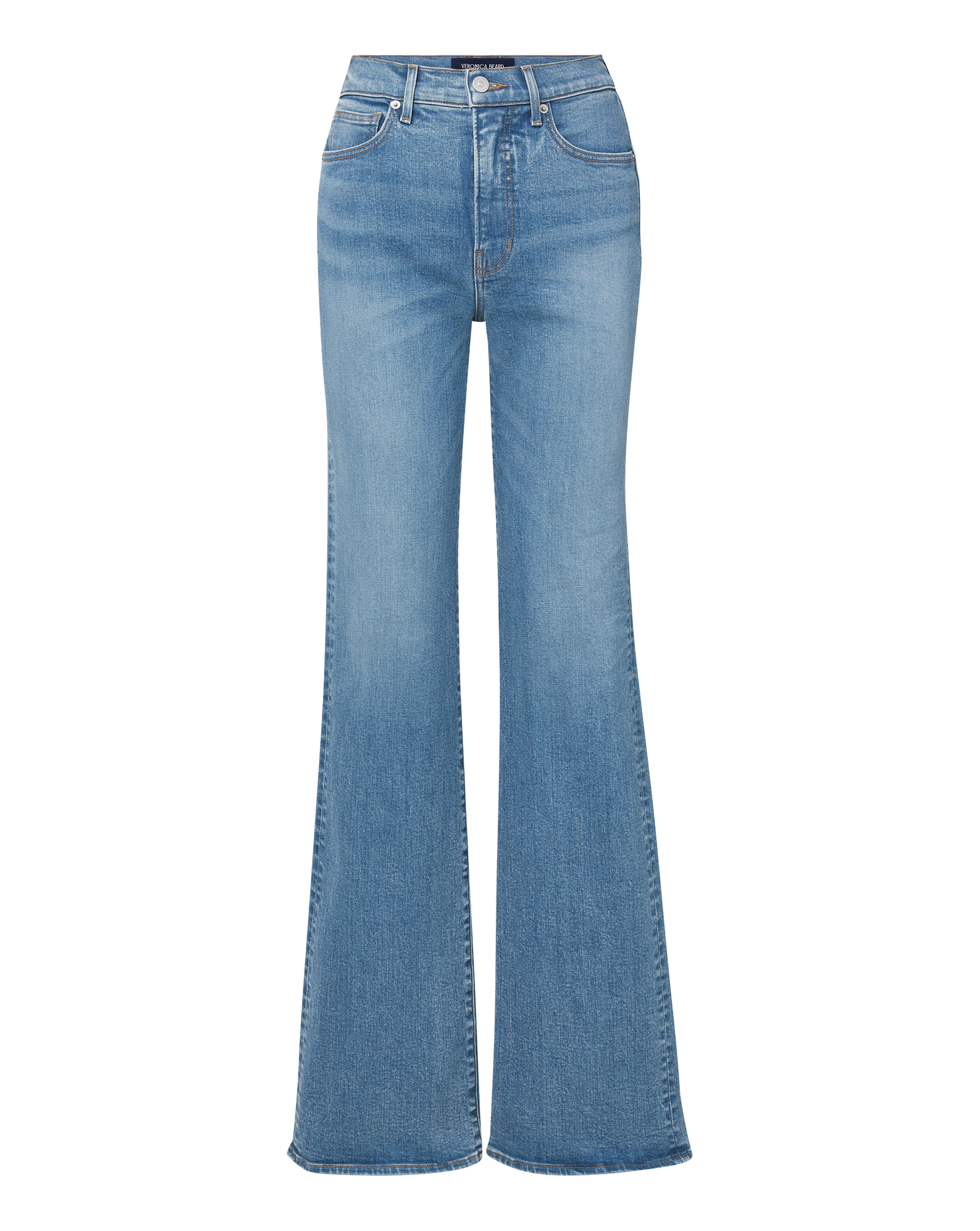 The Crosbie you know and love. This high-rise, slimmed-out wide-leg jean is fitted through the hips and thighs and expertly tailored for an elongating effect. Made in LA from premium Italian denim, it's consciously crafted using a blend of organic cotton and recycled stretch fibers. Finished with our signature V belt loops, it’s the perfect foundation for the VB uniform—just pair with a dickey jacket and heels.