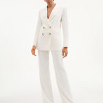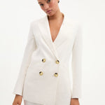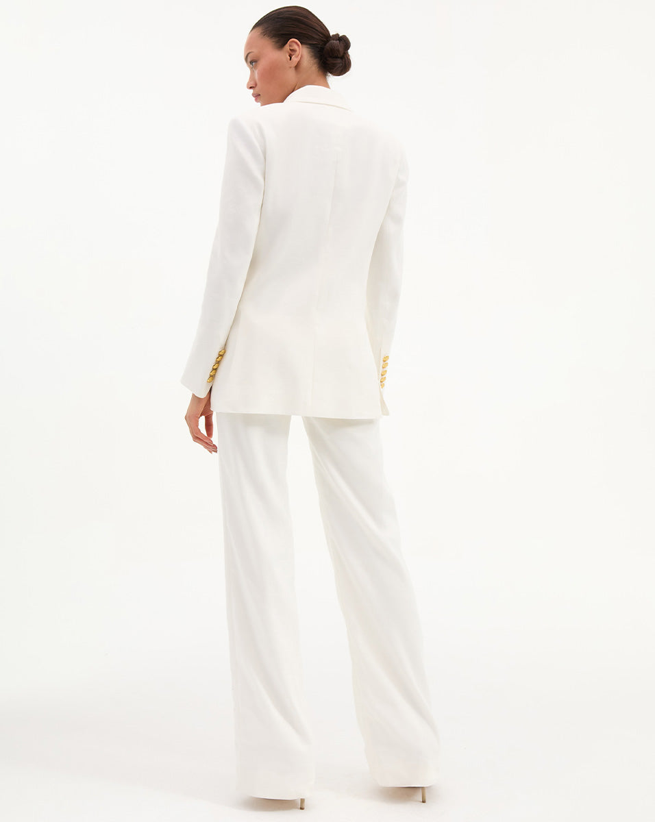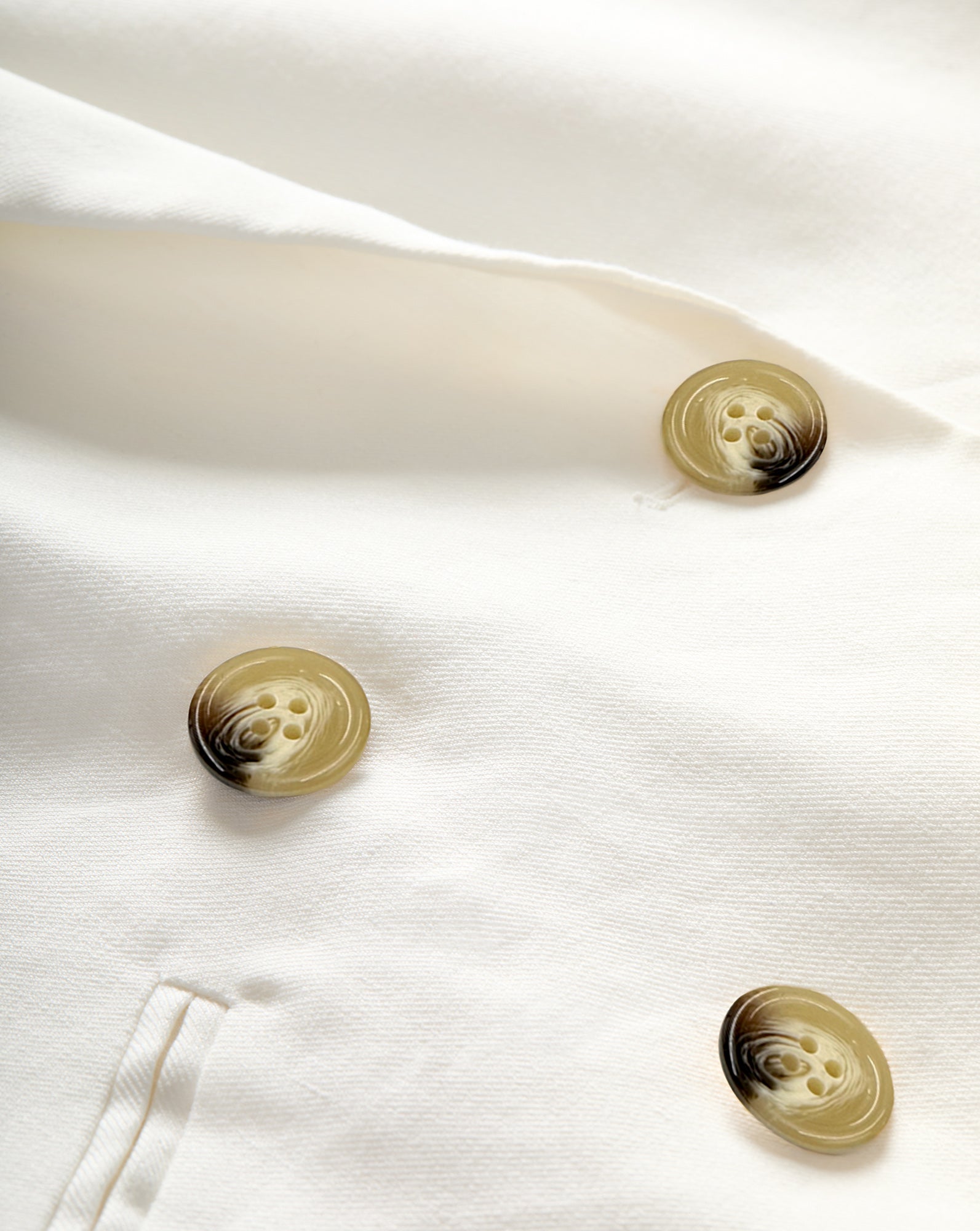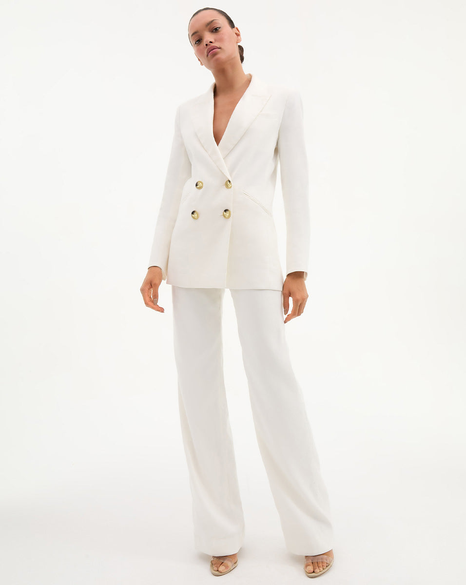 The Dale dickey jacket you know and love, updated with luxe horn buttons. Expertly tailored from premium stretch linen, this white blazer features a relaxed, boxy fit with a perfectly oversized silhouette. Discreet slash pockets and a wide peak lapel complete the look. Pair with matching trousers for a modern suit, or style with denim for laid-back polish.