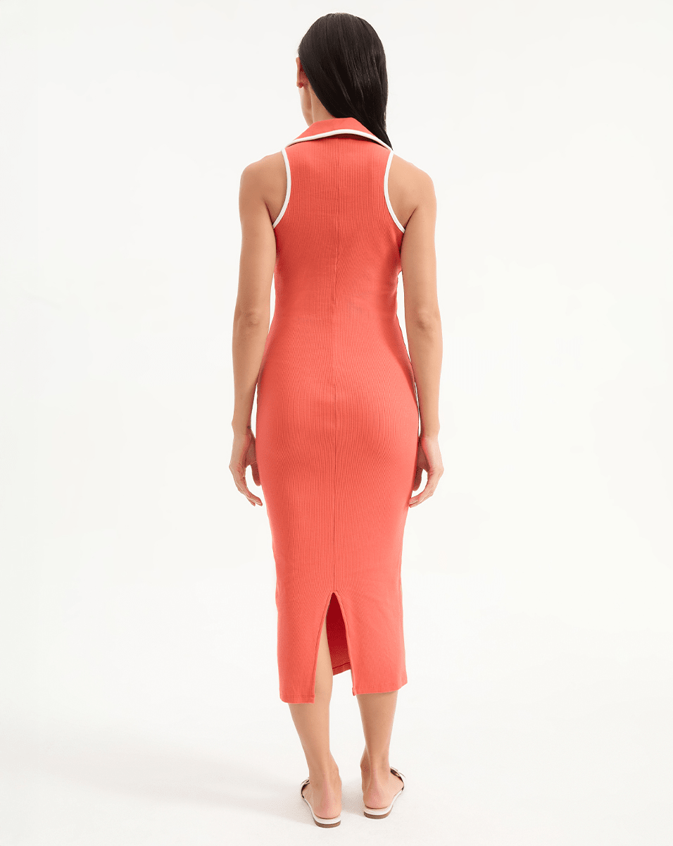 A collared midi dress that boasts endless versatility. The Darien is knit from a premium stretch-cotton blend with soft ribbing for a body-skimming fit. It’s finished with contrast piping along the collar, neckline, and armholes, with a buttonless placket for a refined look and feel. Designed for day-to-night ease, it pairs effortlessly with sneakers and platform sandals alike.