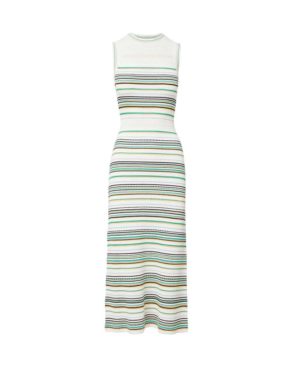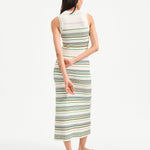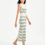 Effortless elegance. The Dawna maxi dress combines a sleek body-skimming silhouette with the comfort and flexibility of our super-stretch, ribbed knit blend. The multicolor stripes in white and greens, meanwhile, add visual intrigue. Consider this sleeveless style the perfect day-to-night, one-and-done wonder—chic with both sandals and elegant stilettos.