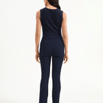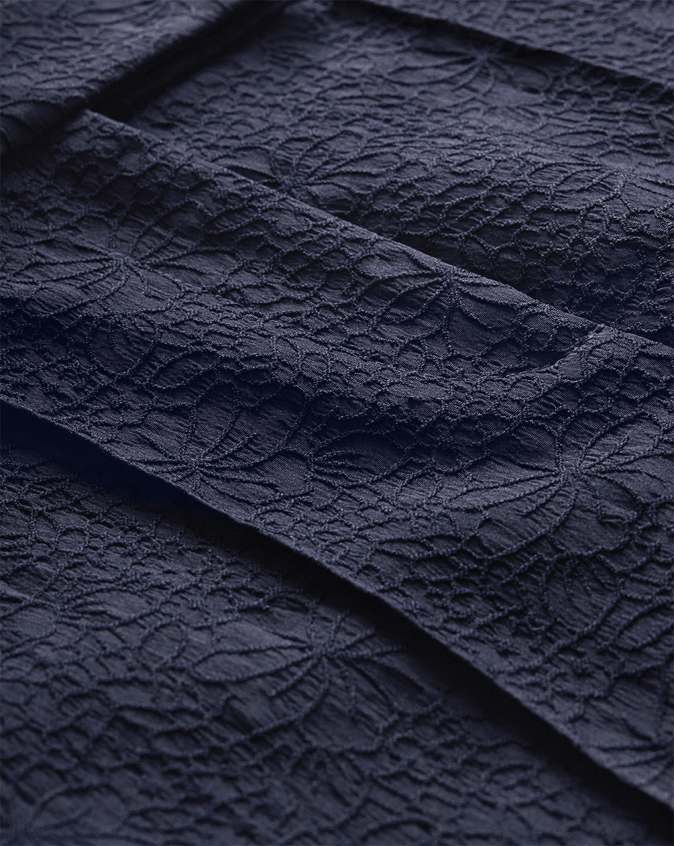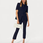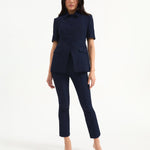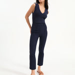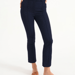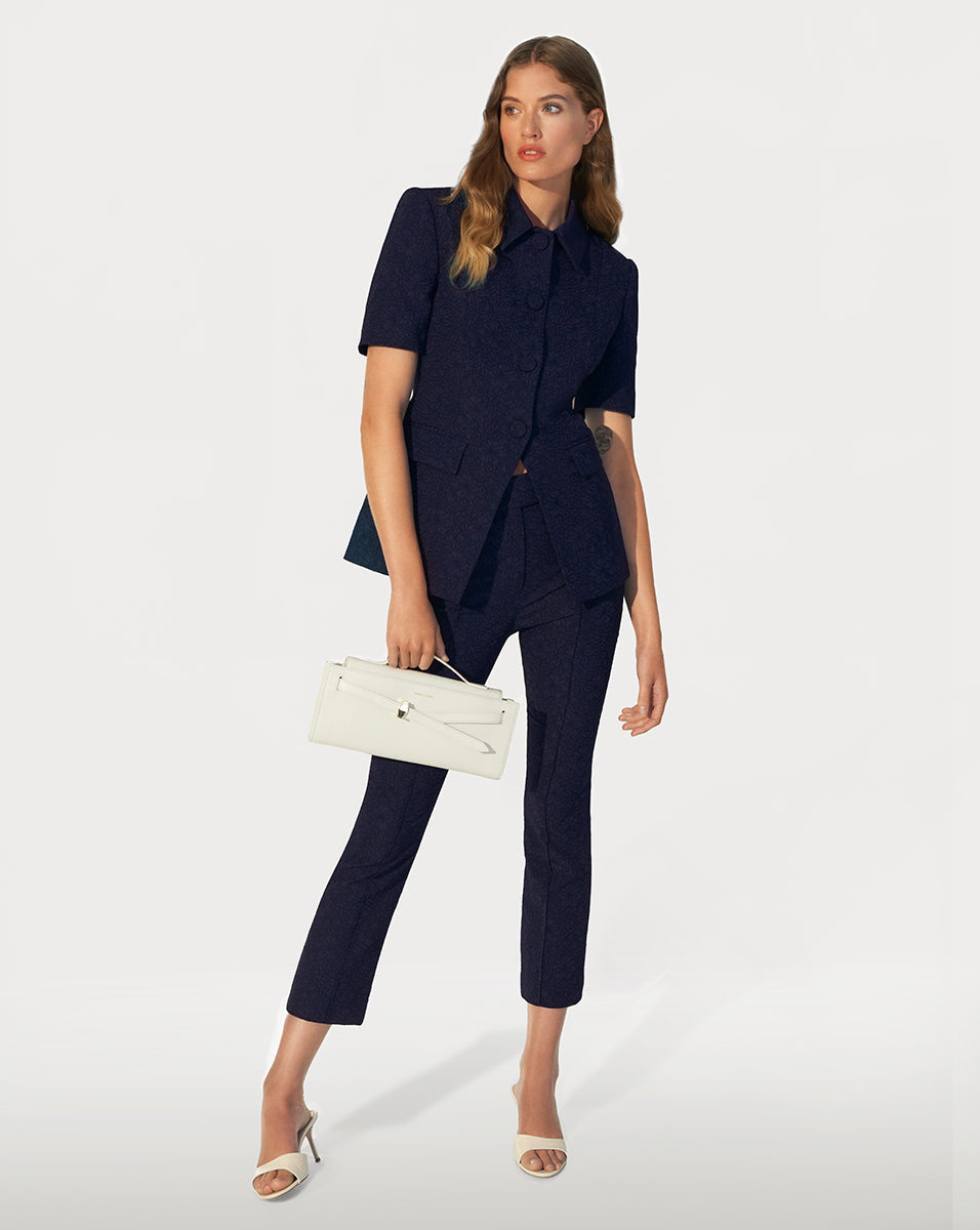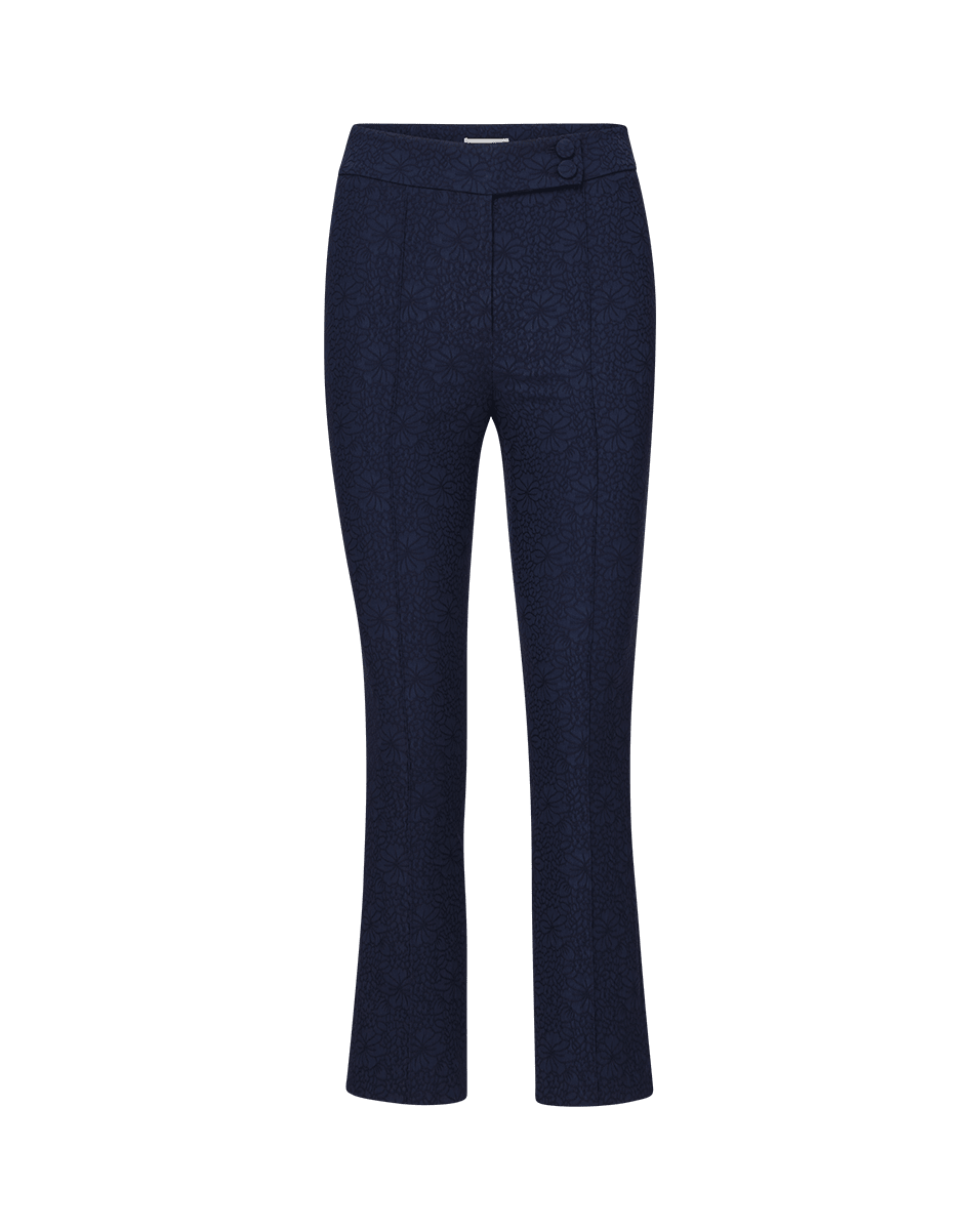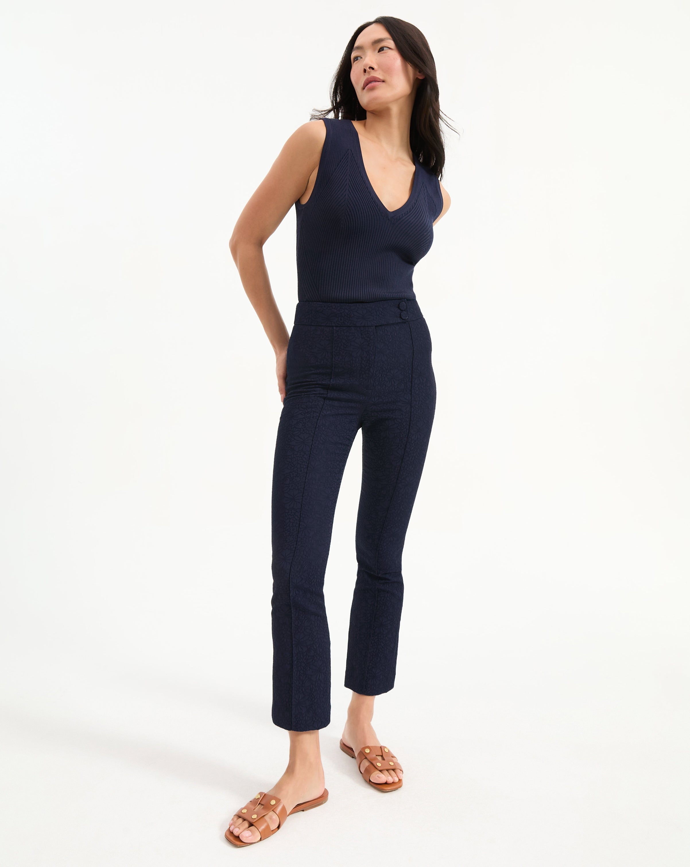 The classic slim tailored trouser, reimagined in navy floral jacquard. The Dell features a high-rise waist, streamlined silhouette, and a versatile cropped ankle, finished with a tonal pattern for understated texture. Pair with the coordinating Bodie jacket for a chic spring set—the cropped length works well with flats and heels alike.