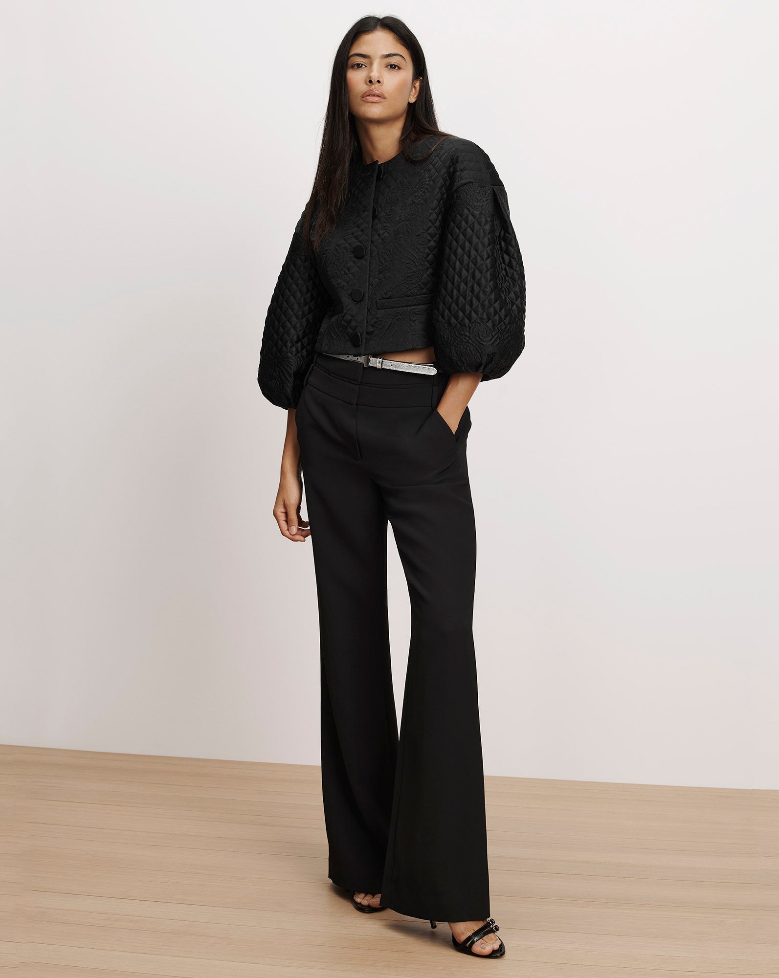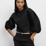 A jacket that makes an entrance. Crafted from smooth, subtly lustrous tailoring fabric, the Drake jacket is defined by intricate allover diamond-and-floral quilting. Voluminous balloon sleeves balance its cropped, collarless silhouette for dramatic effect. Front welt pockets and self-covered buttons complete the look. Style with a slim, black pant for an elegant, modern finish.