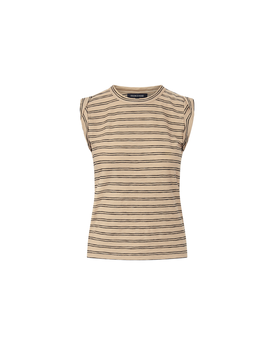 Easy and versatile, the Dree T-shirt is a relaxed muscle tank top featuring khaki and black stripes, a crew neck, and pre-cuffed armholes. Made from 100% cotton, the soft club jersey feels as effortless and cool as it looks. It’s the perfect match for your favorite VB denim, but pairs just as well with tailored trousers.