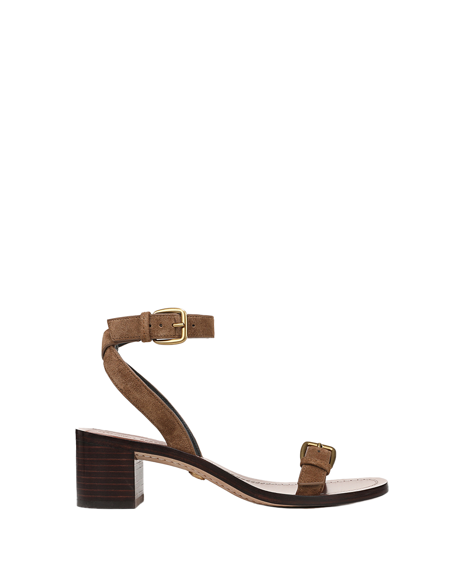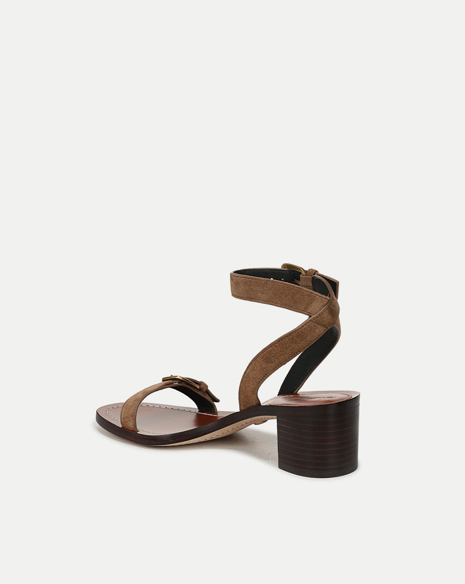 A casual sandal with effortless polish. Crafted from premium suede in versatile taupe, the Elia features a buckled toe vamp and a wraparound buckled ankle strap, set atop a stacked two-inch block heel for ease. Pair it with jeans and a tee to elevate the everyday.