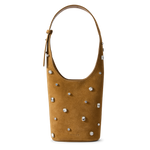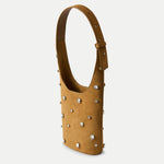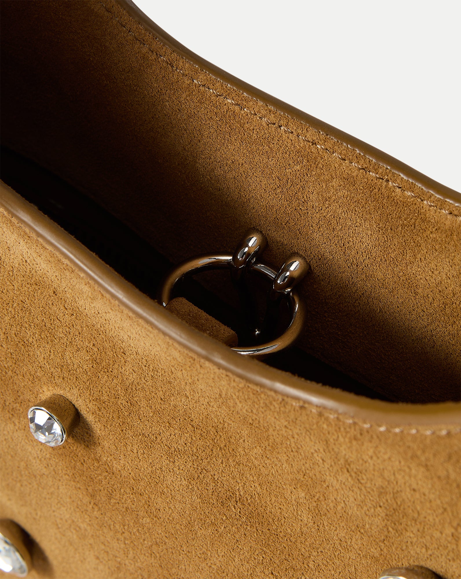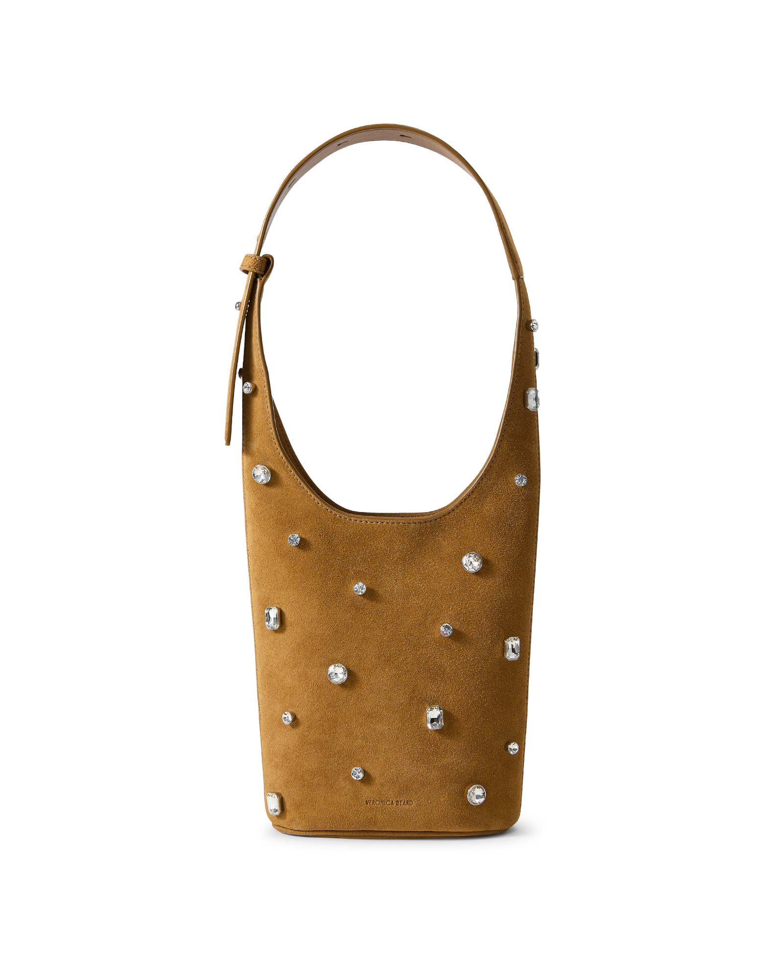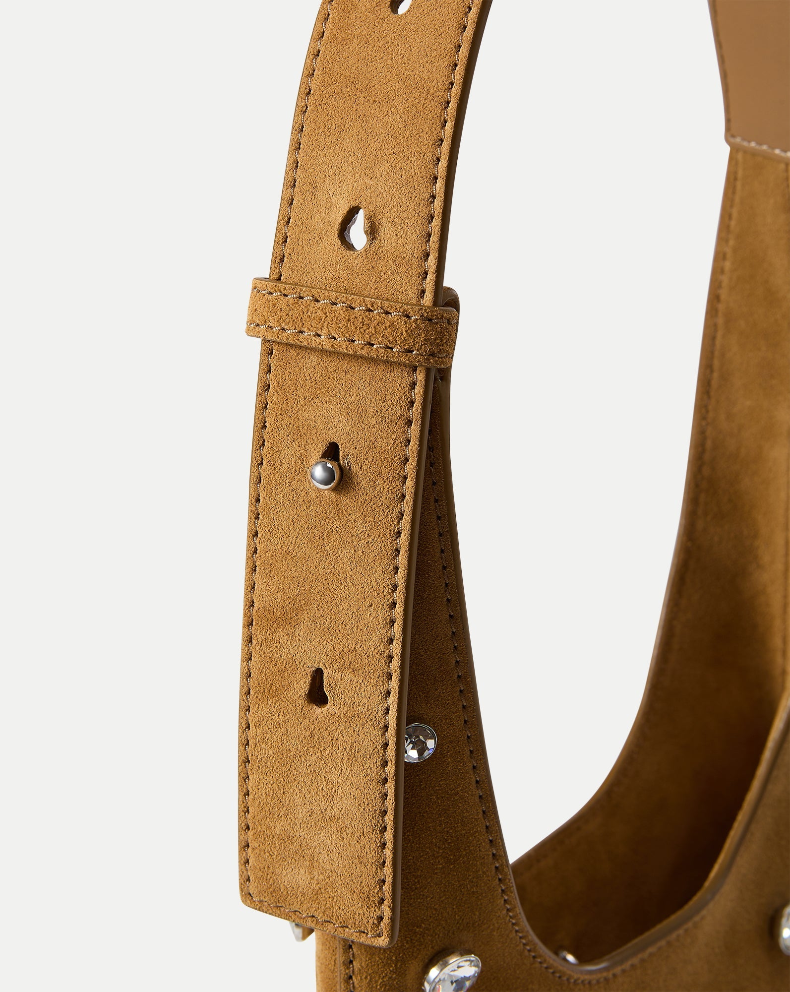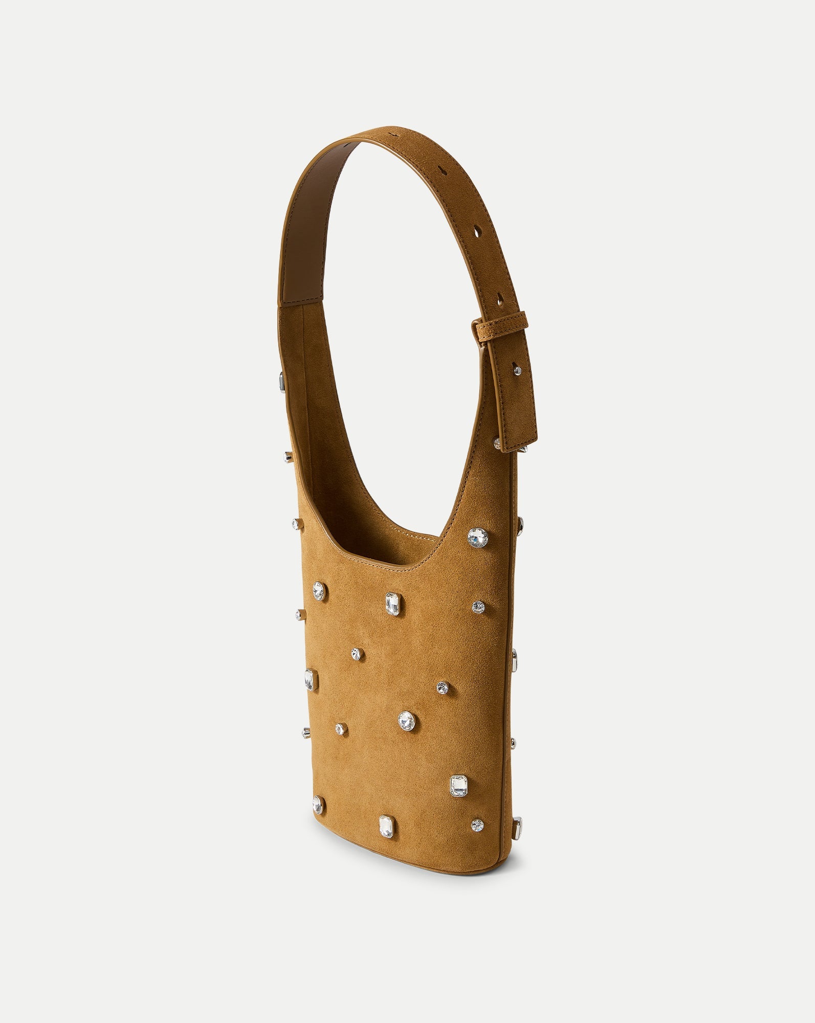A petite bag that makes a big statement. Crafted from tan Italian suede and embellished with assorted crystals, the Loop shoulder bag is defined by its compact, elongated silhouette. An adjustable collar-stud buckle strap allows for comfortable over-the-shoulder wear, while an interior zip pocket and hook-and-eye closure keep your essentials secure. Equal parts playful and polished, it takes you from day to night with ease.