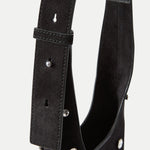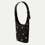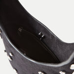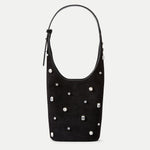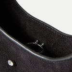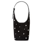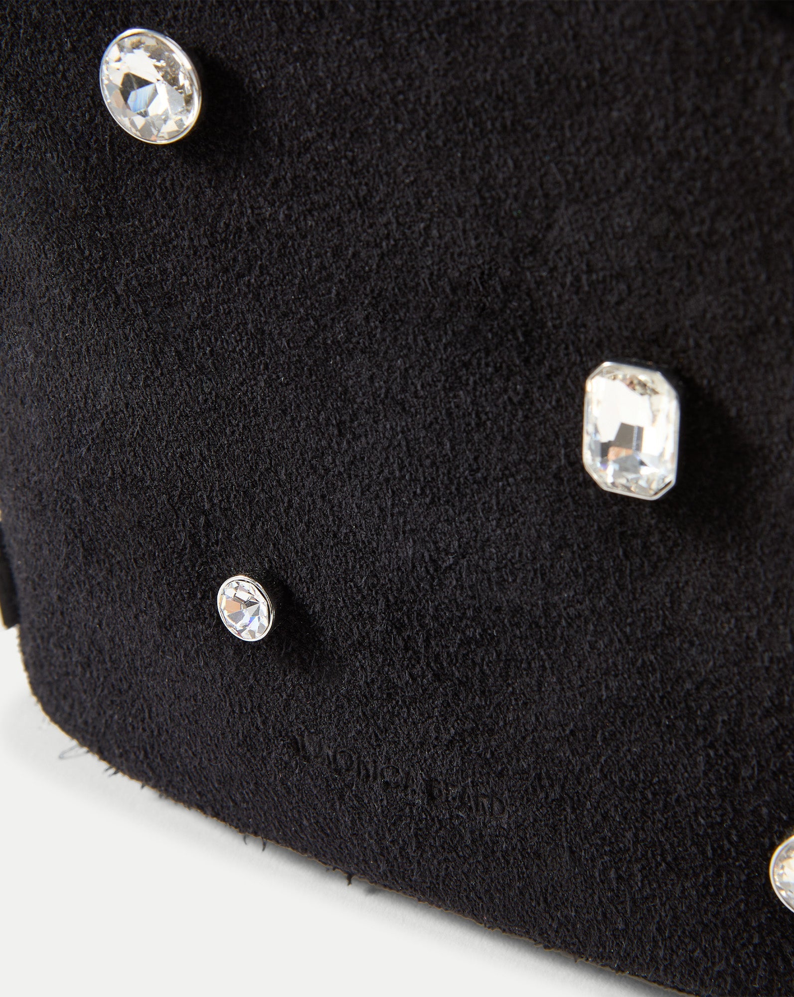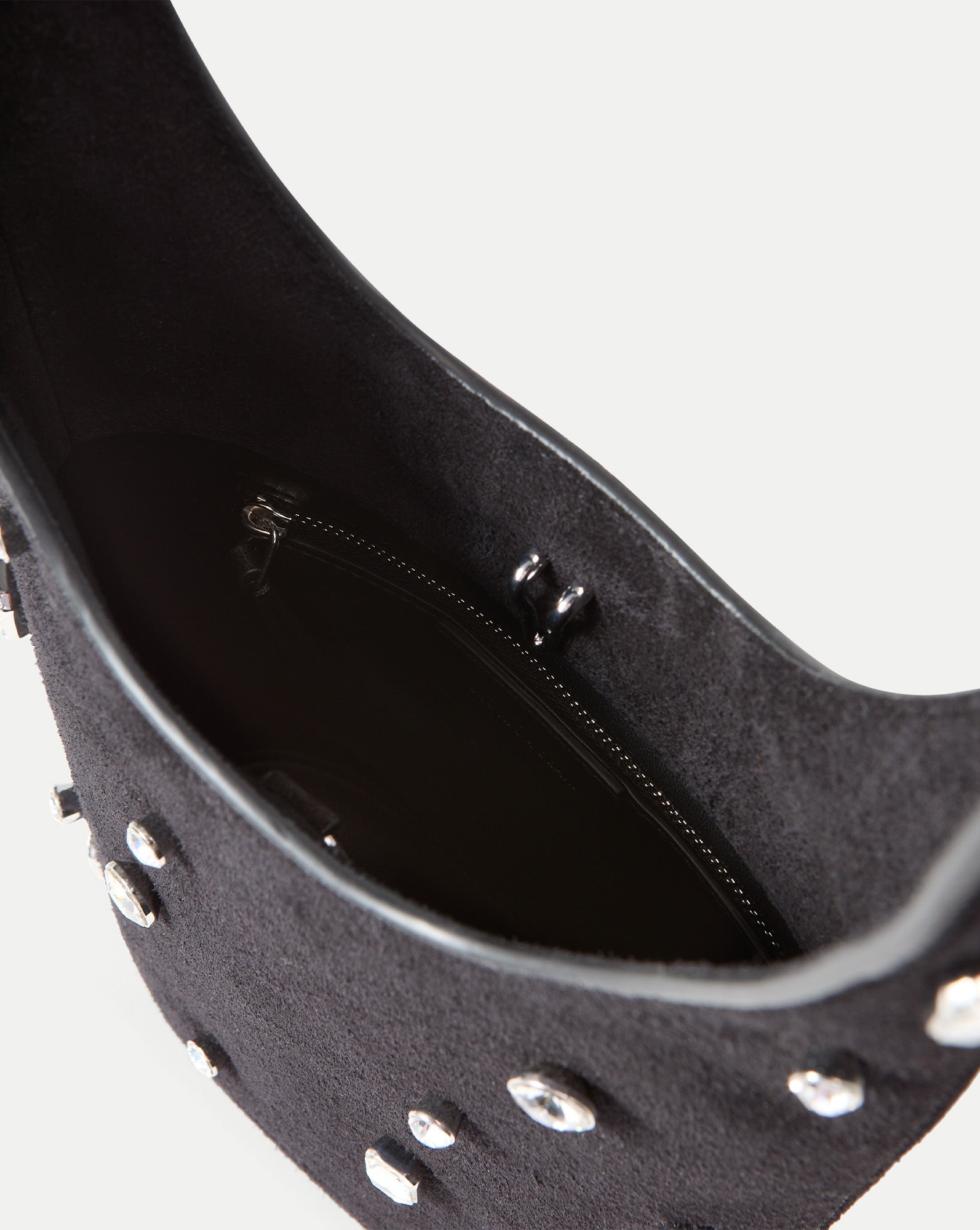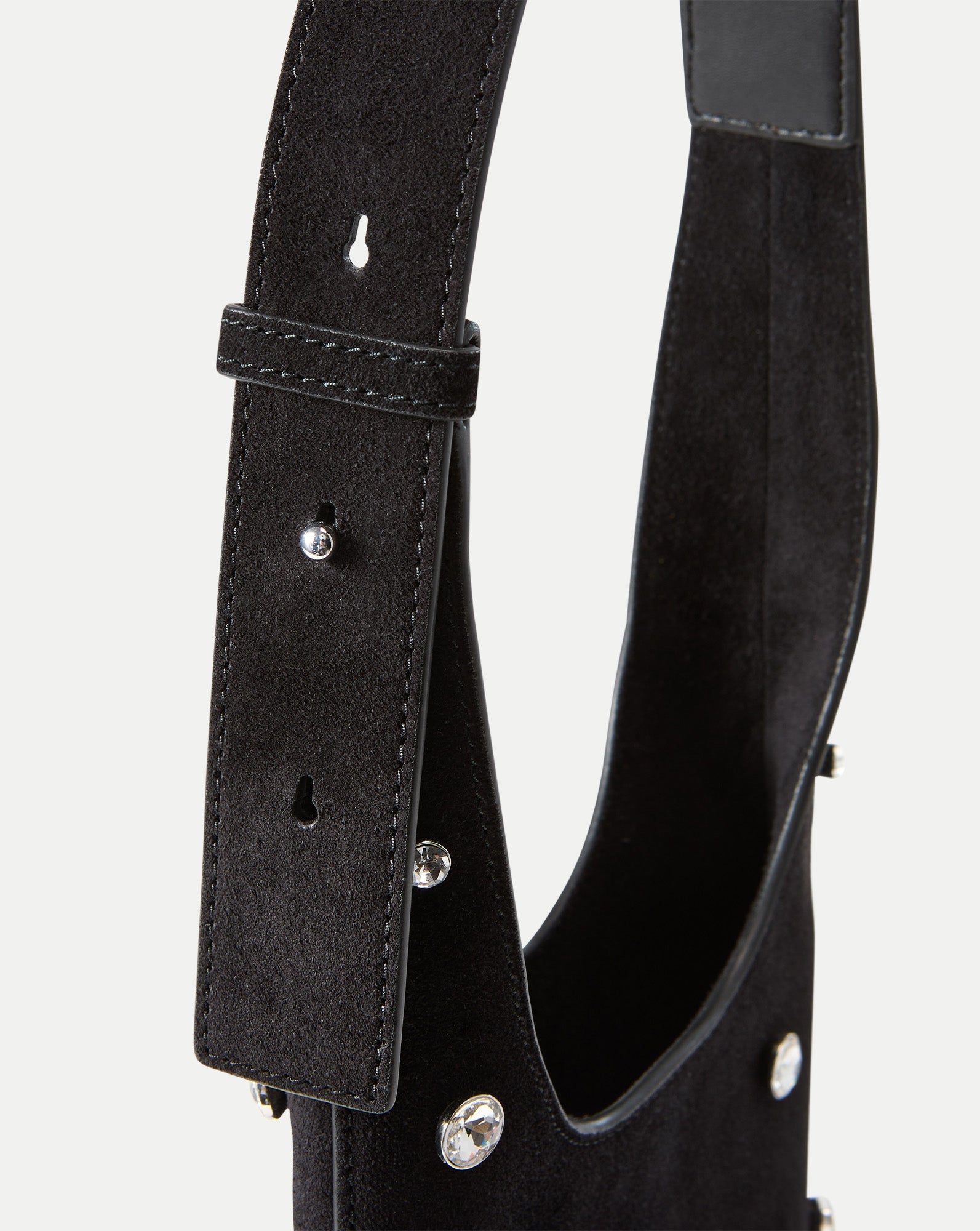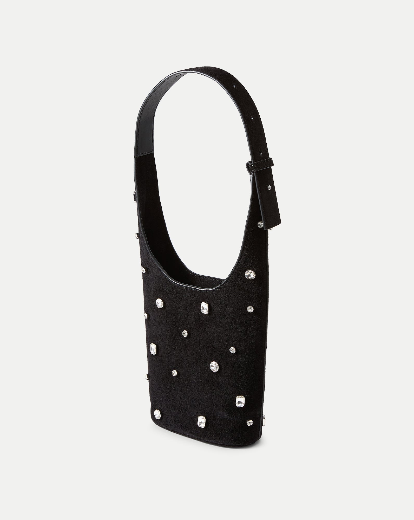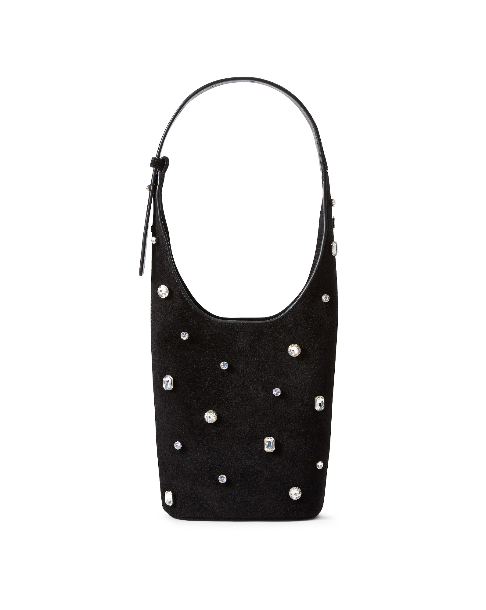 A petite bag that makes a big statement. Crafted from black Italian suede and embellished with assorted crystals, the Loop shoulder bag is defined by its compact, elongated silhouette. An adjustable collar-stud buckle strap allows for comfortable over-the-shoulder wear, while an interior zip pocket and hook-and-eye closure keep your essentials secure. Equal parts playful and polished, it takes you from day to night with ease.