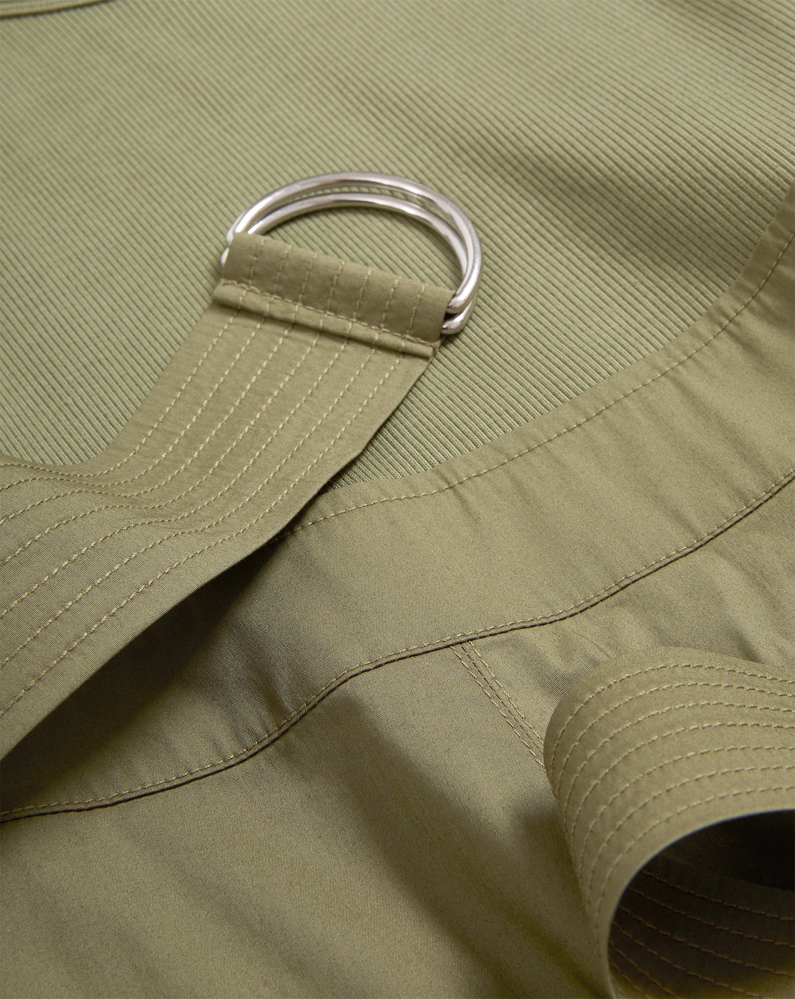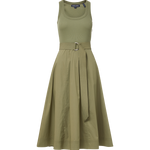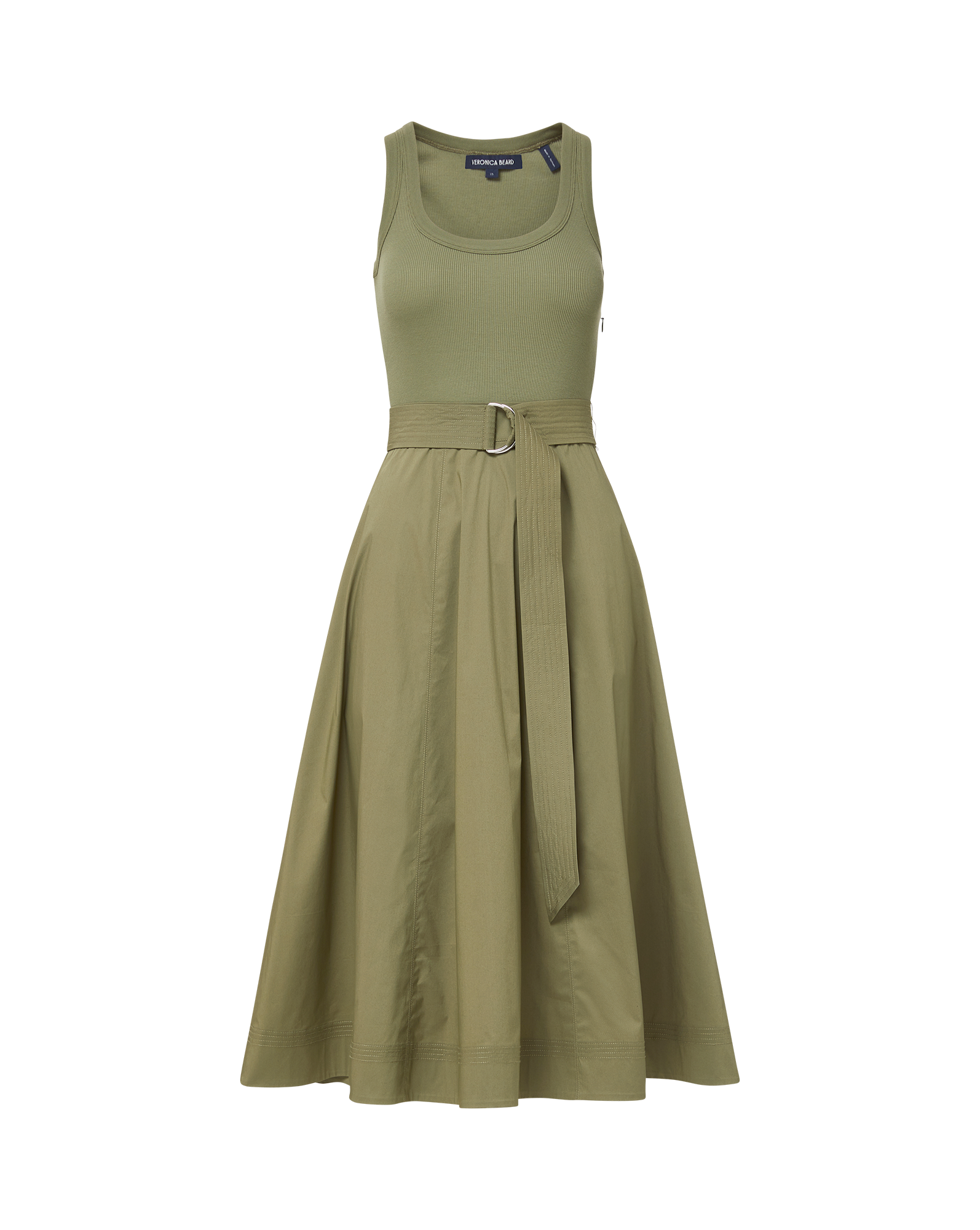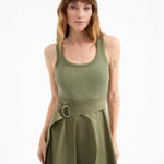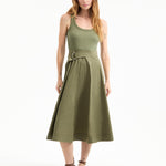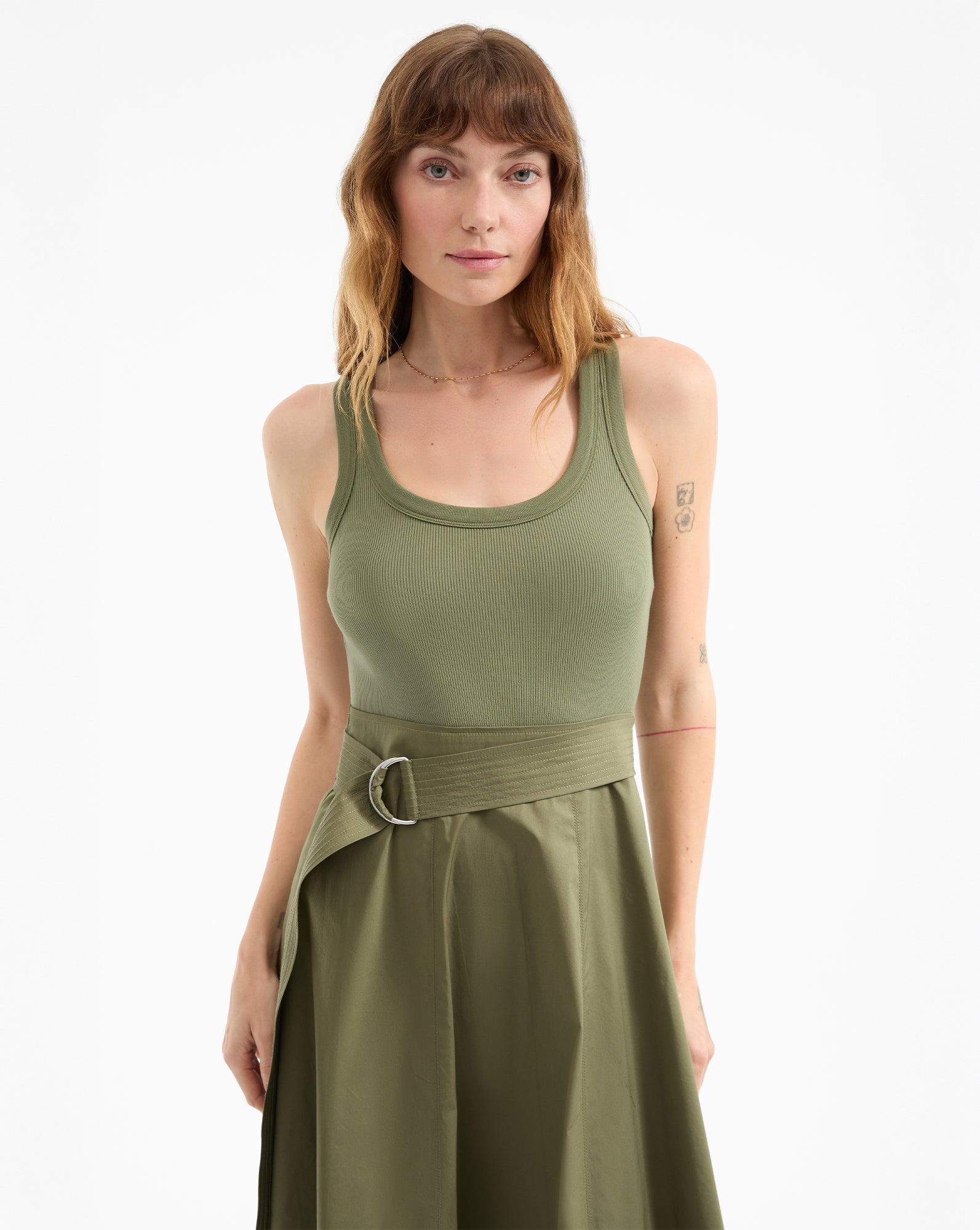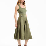The top: a soft tank. The bottom: a crisp A-line skirt, with a D-ring belt. The latest addition to our mixed-media lineup, the Ennis midi dress in army green, is a one-and-done wardrobe hero that takes the guesswork out of getting dressed. Complete the laidback look with strappy sandals or pair with platforms and a scarf for getaway chic.