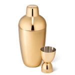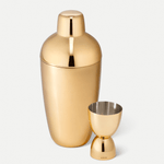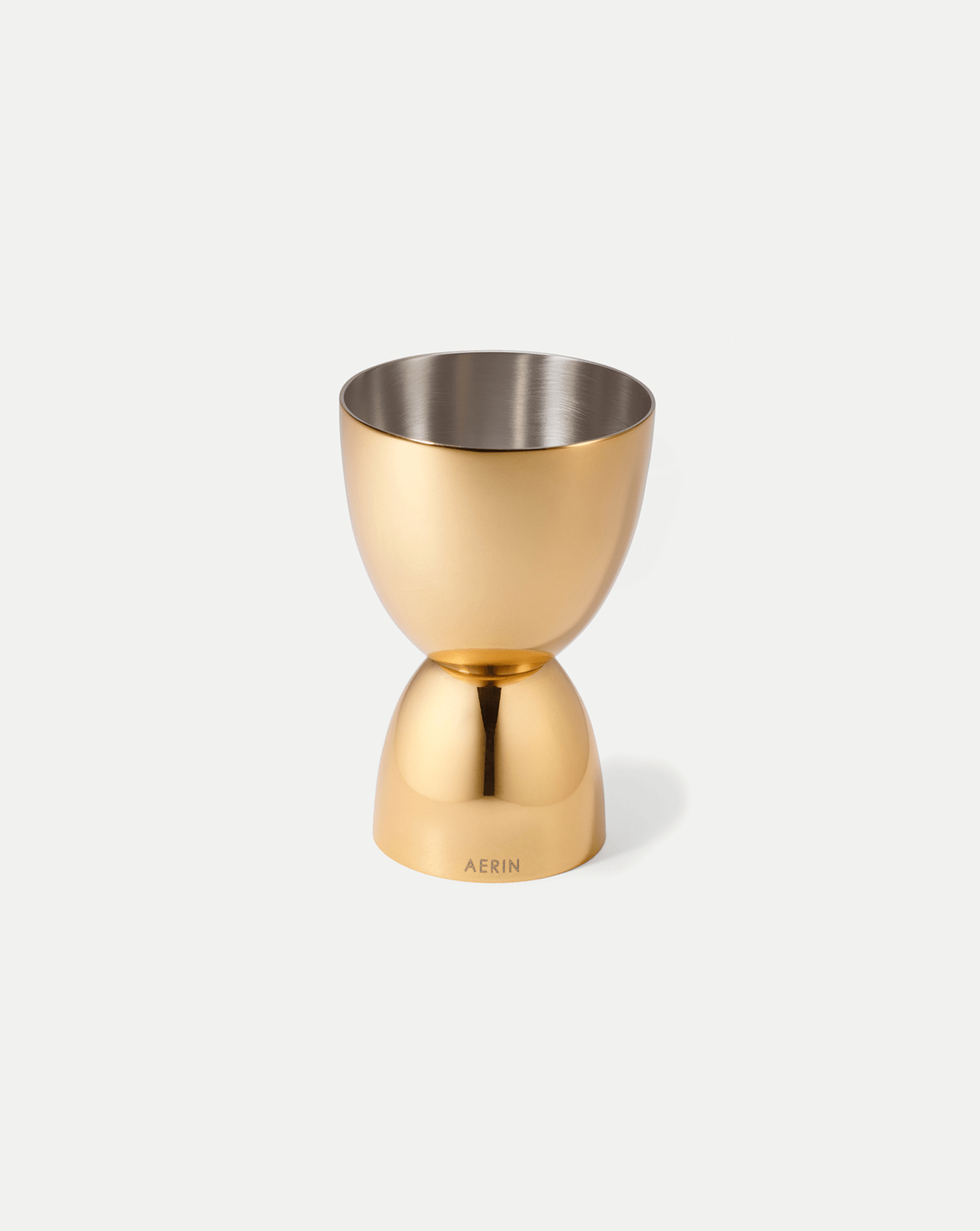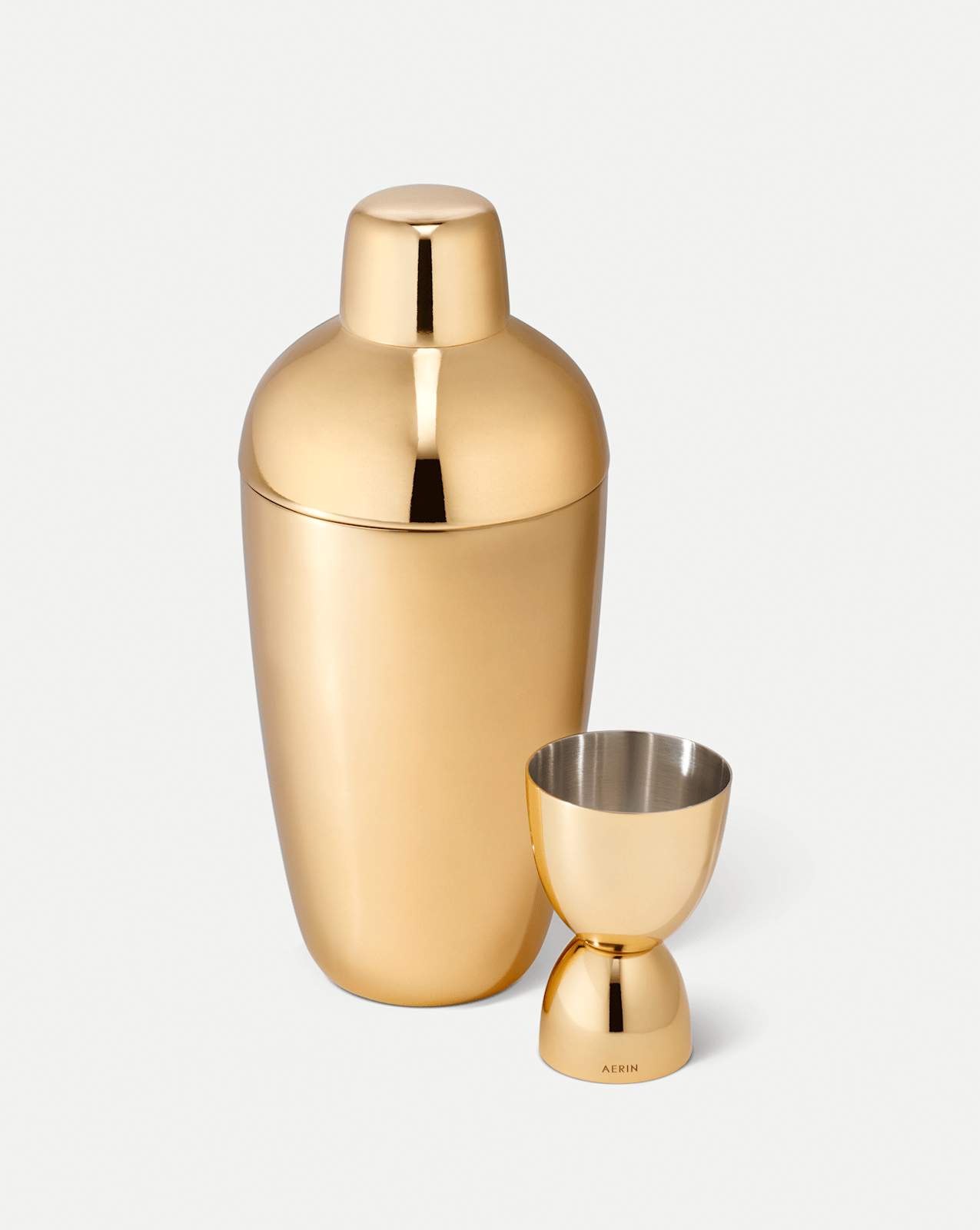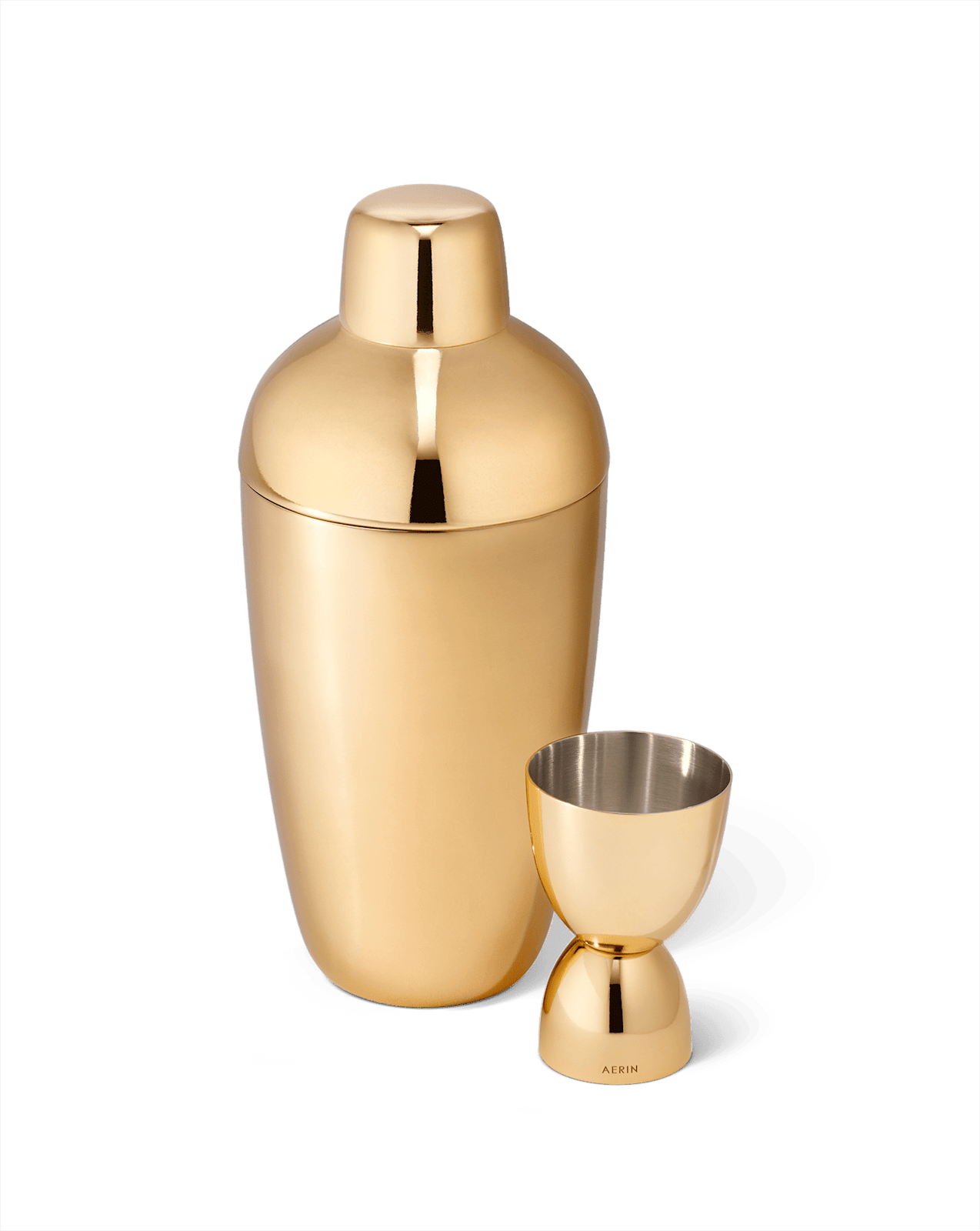 Your bartending essentials, elevated. Crafted from gold-plated brass, this home bar set includes a rounded cocktail shaker and a double-sided jigger with one-ounce and half-ounce measurements for precise mixing. A luxe addition to any bar cart, it’s perfect for entertaining in style.