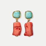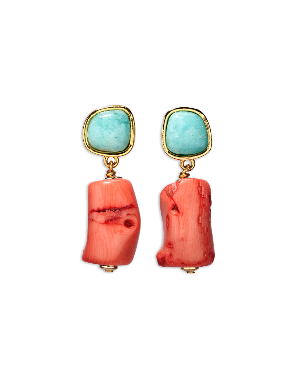 • Gold-plated brass and amazonite earrings with hanging bamboo coral drops