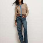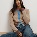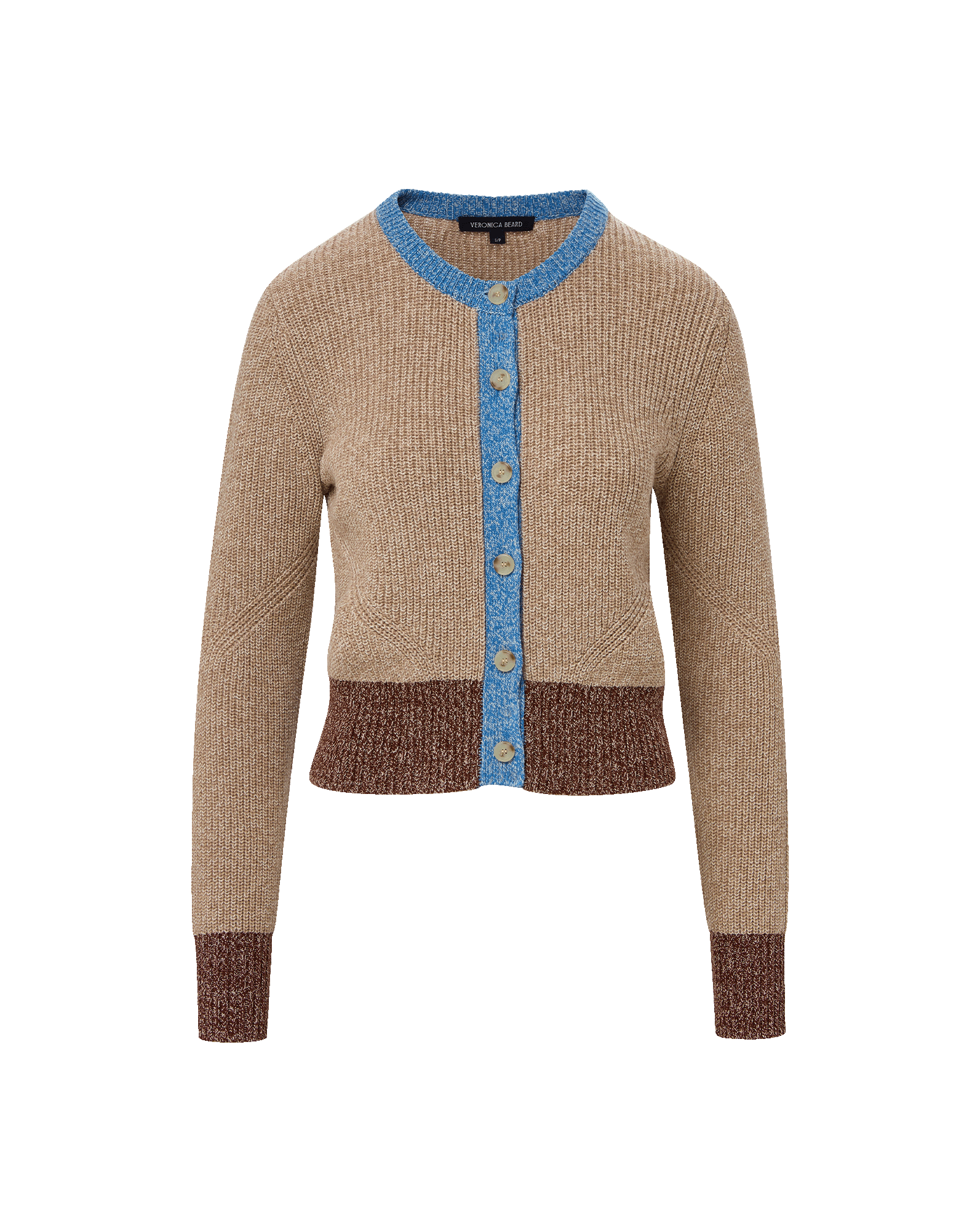 The essential knit for transitional styling. Spun from a premium merino-wool blend in beige, the Ibra cardigan features a slouchy, relaxed fit with soft ribbing throughout. Contrasting brown hem and cuffs and a pop of blue trim complete the look, lending a modern, color-blocked finish. Wear it solo or layered over a T-shirt, and pair with your favorite VB denim.