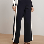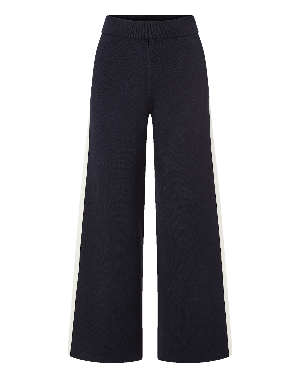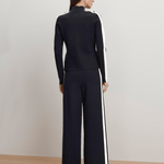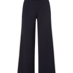The track pant—elevated. Crafted from a soft navy midweight knit, the Jenkins features a flattering high waist and a relaxed wide-leg silhouette, finished with white double stripes for an athletic touch. Pair with the matching Asante top for a sleek off-duty look.