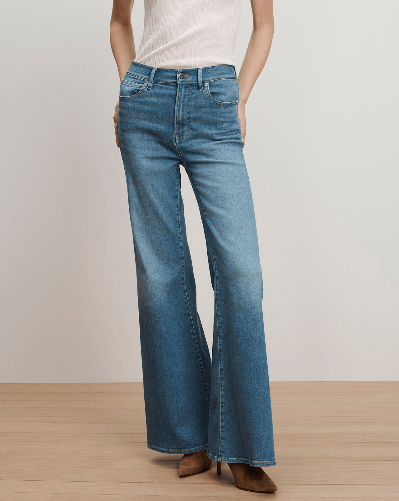 Meet Joplin, our new extra-wide flare jean. Crafted from premium super-stretch denim in a classic blue wash, it features a high-rise, full-length silhouette that’s fitted through the hips before widening at the mid-thigh into an exaggerated flare. Style with a crisp tee for laid-back ease, then add a dickey jacket and heels for instant polish.