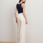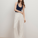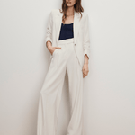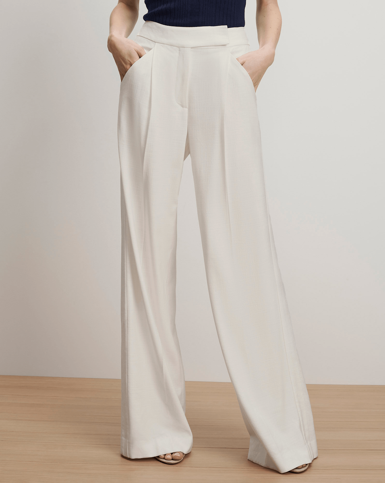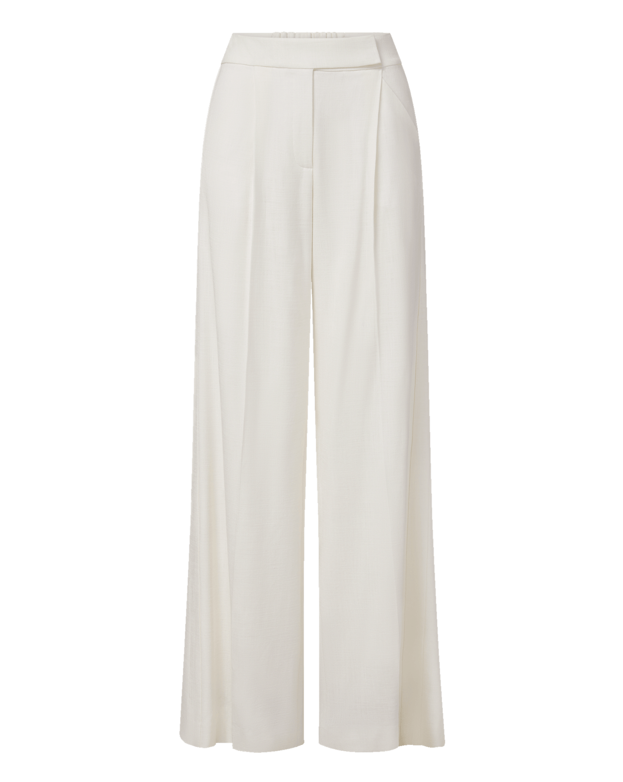 A relaxed, roomy pant that still feels polished. Crafted from a premium stretch-tailoring blend in off-white, the high-waisted Marbeau is defined by a wide-leg silhouette with front pleats and fluid drape. It features an elasticated back band to ensure a comfortable fit, while diagonal side slip pockets and back welt pockets complete the look. Dress it down with a simple tee or sweater—or pair with a matching Battista dickey jacket for an effortless suit.