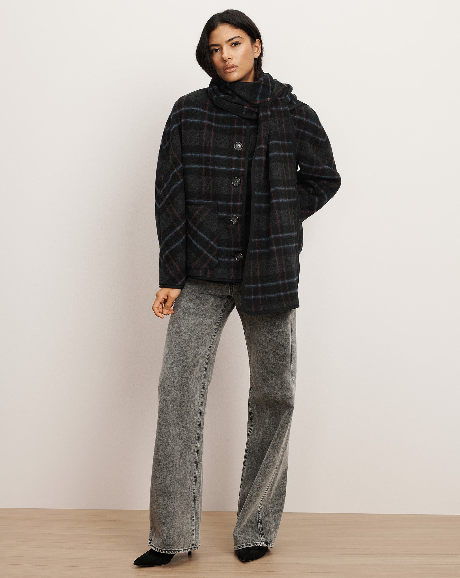 Your most versatile layer. Spun from a premium Italian wool blend in classic plaid, the Martine coat can be worn three ways: with or without its removable scarf, or layered with a dickey. A jewel neckline, front welt pockets, and faux horn buttons complete the design. This is the coat you’ll reach for all season long.