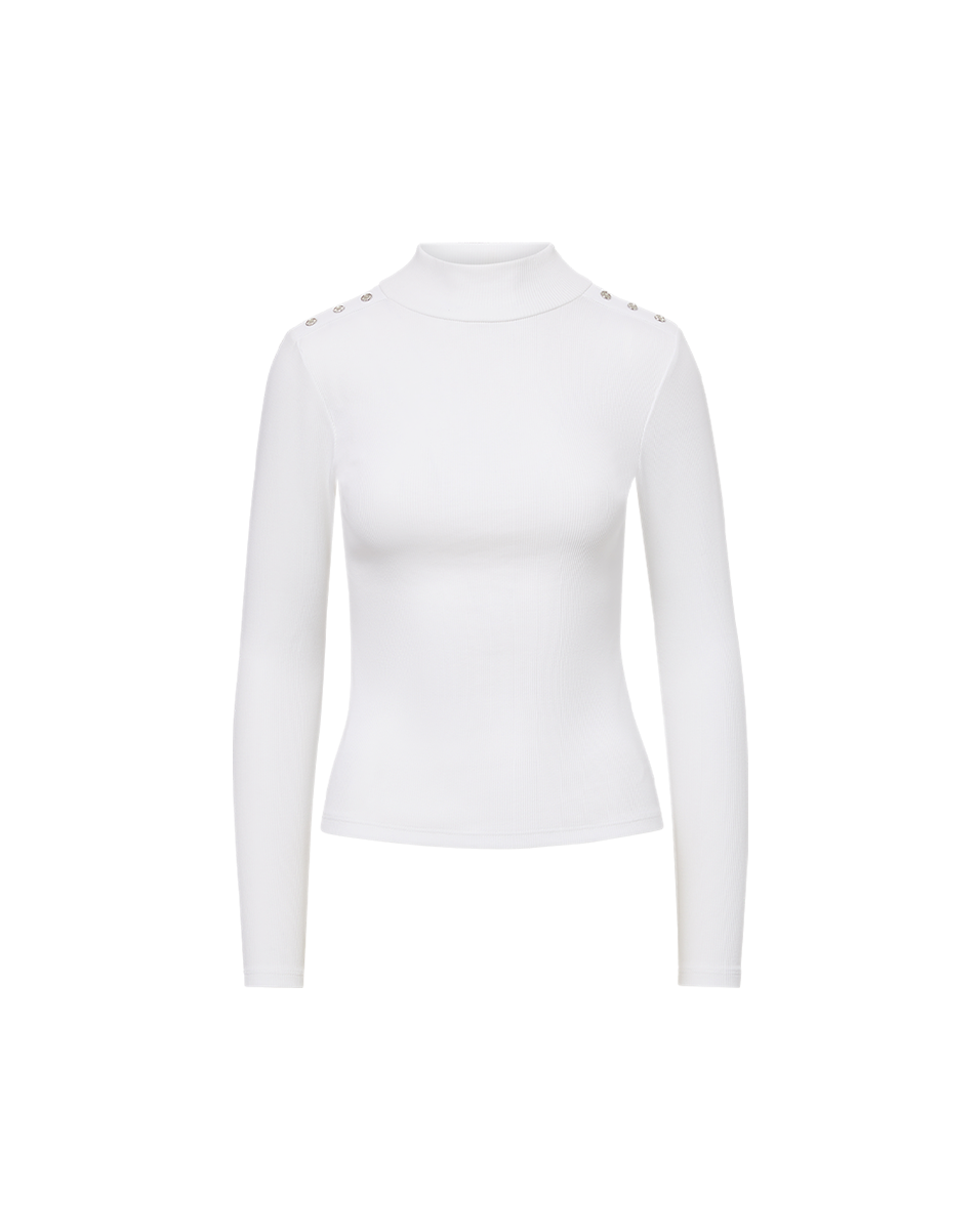 A fashion-forward take on the classic long-sleeve tee. Made from premium stretch cotton, the Nate is defined by a slim fit, a mock neck, and button embellishments on the shoulder. Wear on its own or as a base layer.