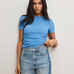 A refined take on the classic tee. Crafted from a premium stretch blend in blue, the Remus T-shirt is cut for a slim, body-hugging fit, defined by ruching along the waist for a cinched effect. Finished with a crew neckline and short sleeves, it’s an endlessly versatile foundational piece. Style it with denim, trousers, or skirts alike.