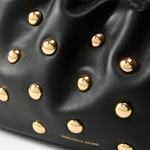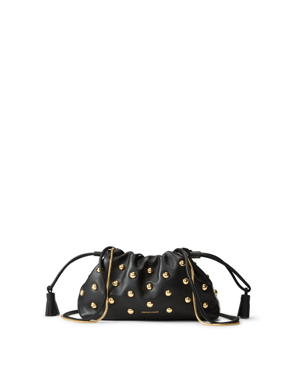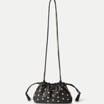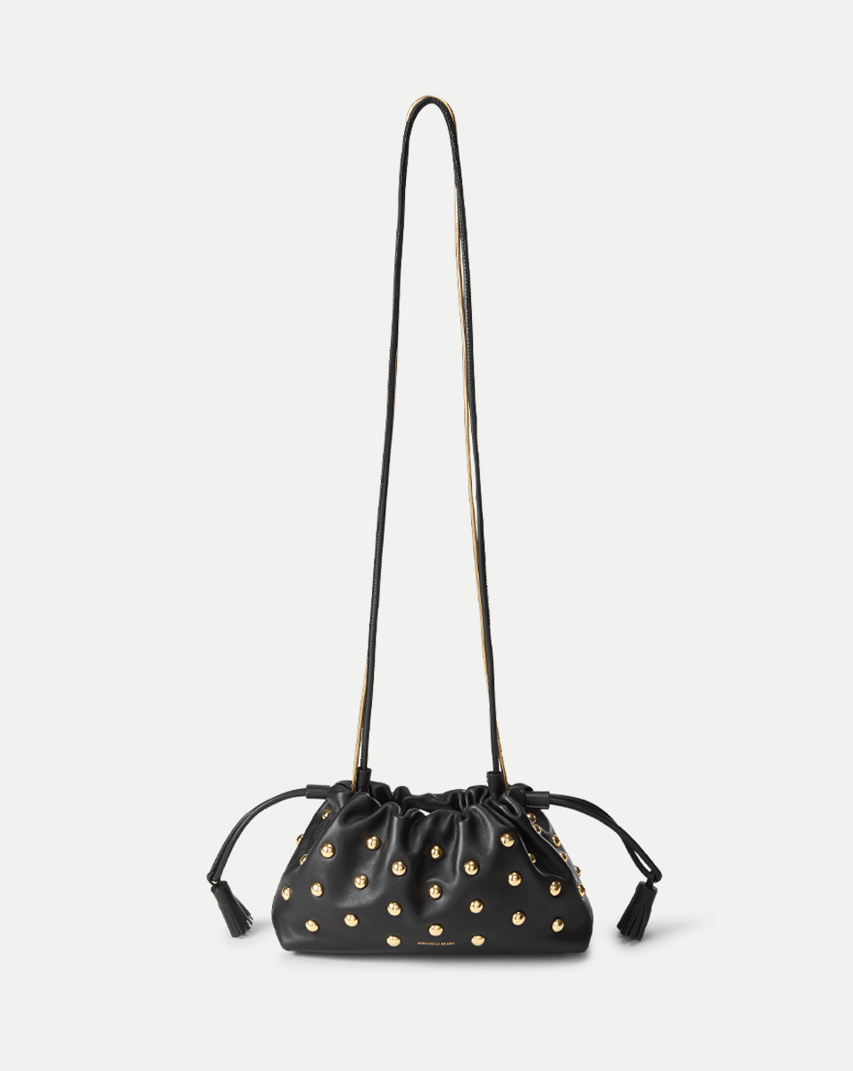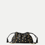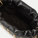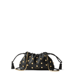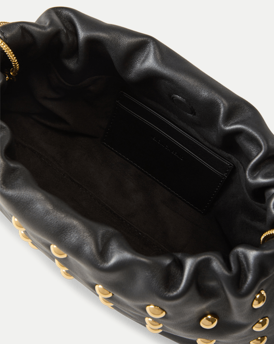 A petite take on our Stash bag in black. Crafted from smooth, supple leather with chic gold studs, this pouch bag features a soft silhouette with gathering up top, double tassels and double straps—including one in gold snake chains. An interior zip pocket and magnetic tab closure keeps your belongings safe and secure.