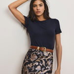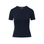The ultimate foundation for an elevated wardrobe. Crafted from a premium stretch blend, the navy Benedict T-shirt is cut for a slim, body-skimming fit with a clean crew neckline and short sleeves. Wear this versatile top on its own, tucked into denim, or layered under your favorite blazers and cardigans.