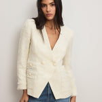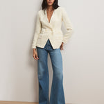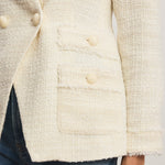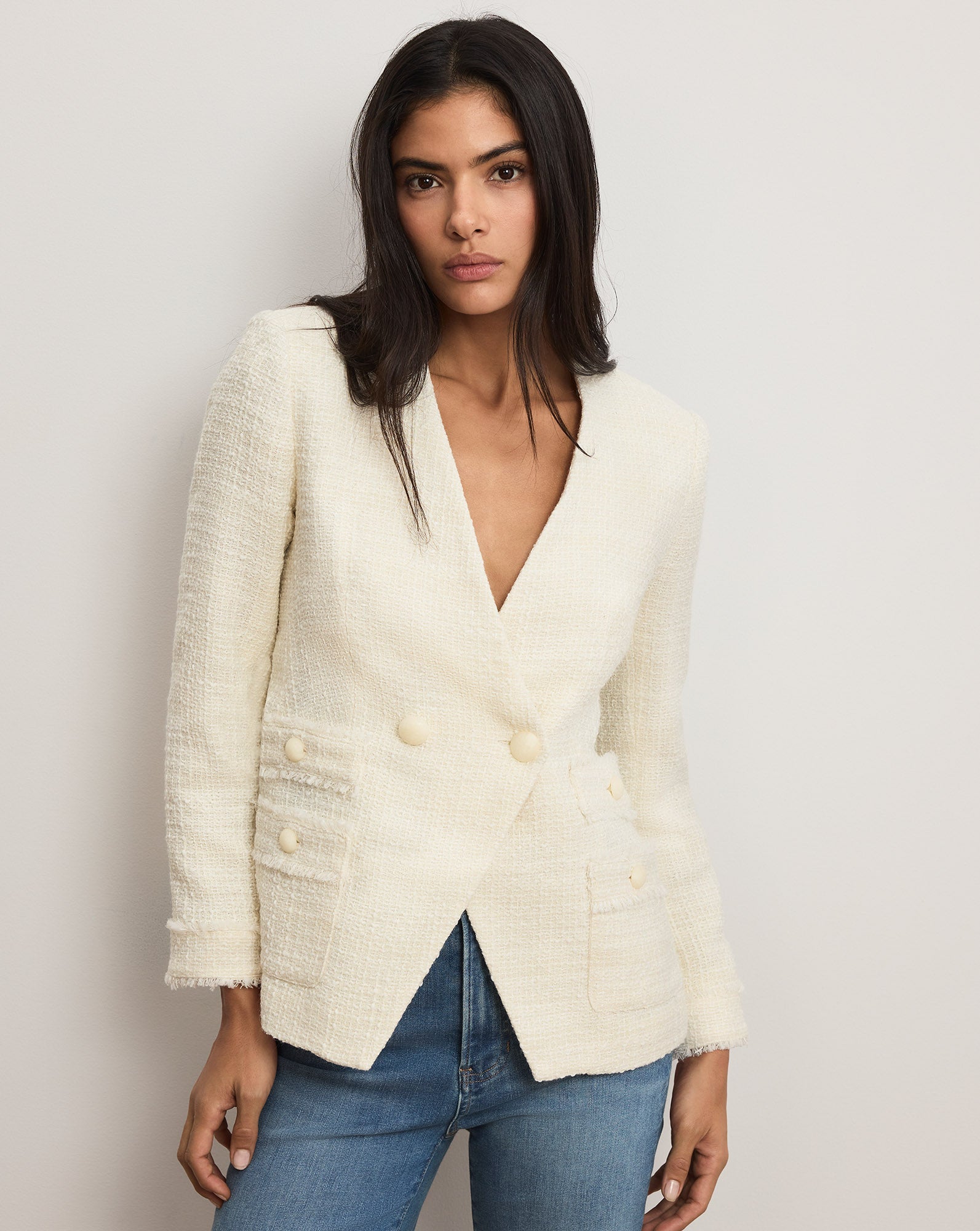 Tailored to perfection. Crafted from off-white Italian tweed, the Yves jacket features a slim, waist-defining fit with a clean, collarless double-breasted silhouette. A cutaway hem further accentuates the waist, while fringe-trimmed patch pockets add dimension. Style with sleek dark-wash denim and a heeled bootie for a classic VB look.