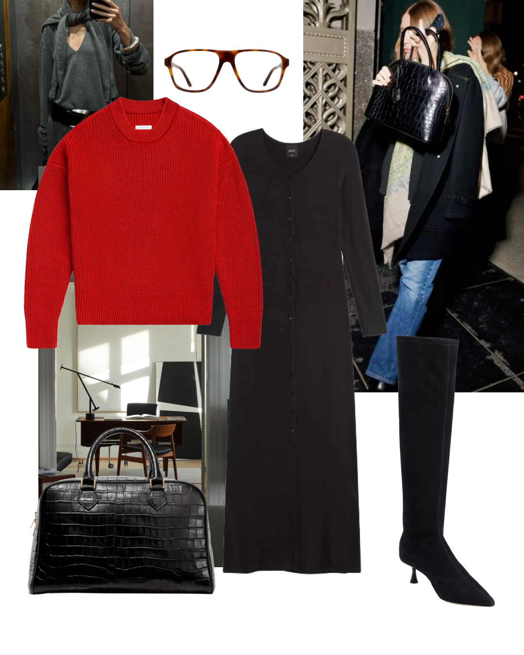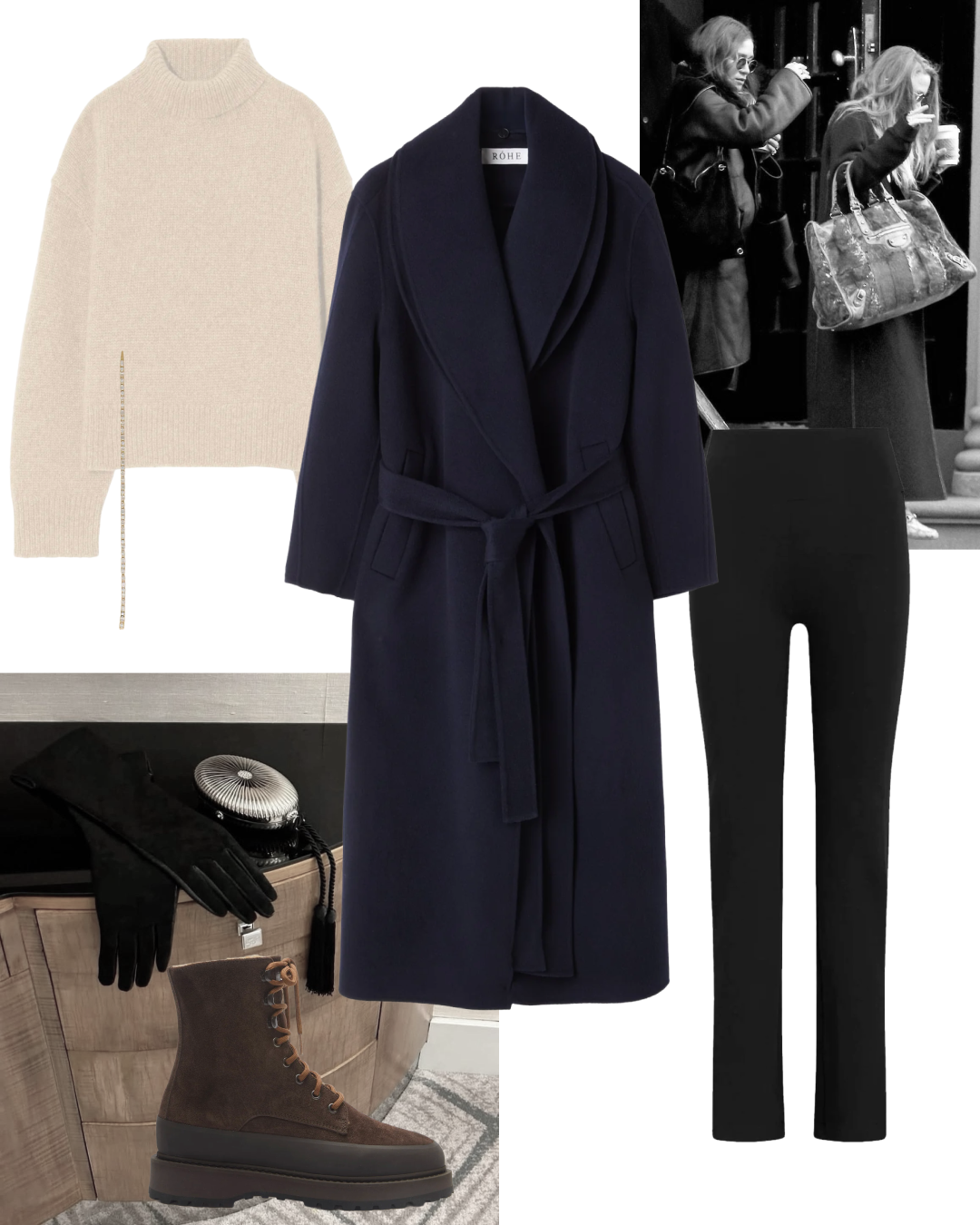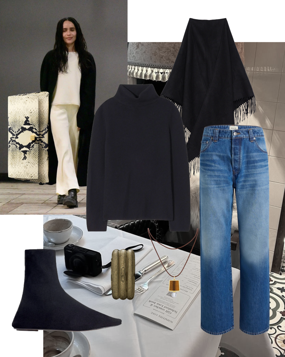 Winter denim matters more than summer denim because you wear it under coats, with boots, through long days. It needs to keep its shape and hold the line. The knit has to have structure (no collapsing necklines, no slouch that turns sleepy). Then you add one polished detail - bag, glove, ring - and suddenly the whole outfit reads as considered.