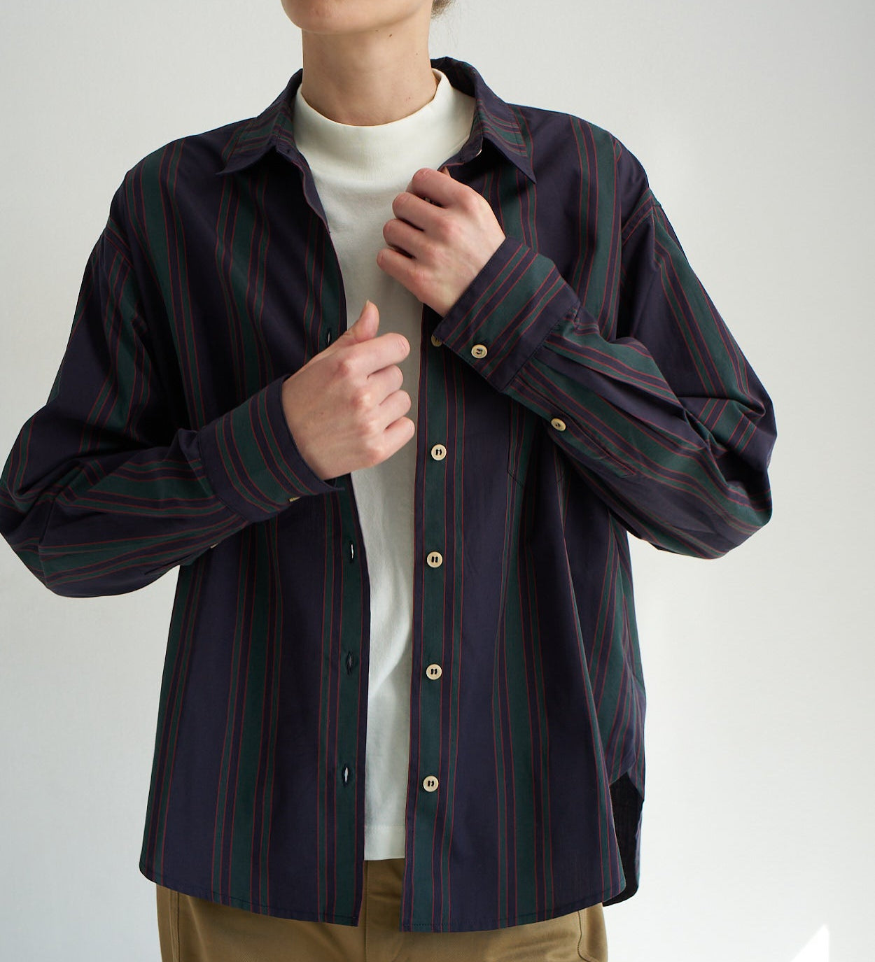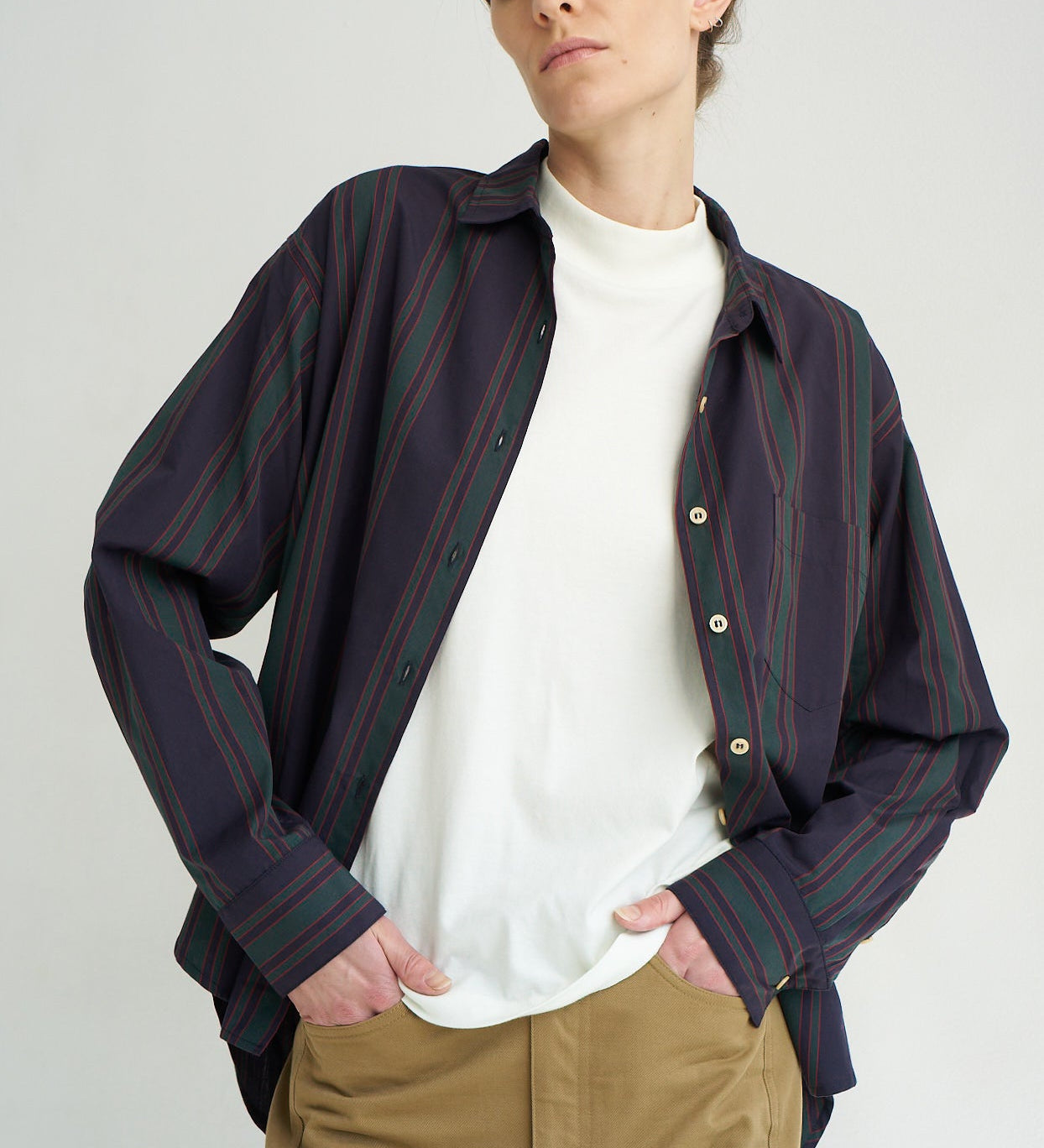 The trouser does the heavy lifting. The shirt makes it cool but effortless. The key is proportion: the shirt should feel relaxed, but not messy. The trouser should sit cleanly and hold shape. When this uniform is right, you don’t need extra styling tricks, it already reads as polished.