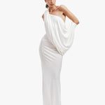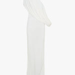 The Aiba Draped Jersey Tee Dress is cut in a fluid viscose jersey and defined by a sculptural, one-shoulder silhouette. A clean column base is contrasted by a softly gathered overlay that drapes diagonally across the body, creating organic volume through the neckline and hip. The asymmetric construction is secured with a fine shoulder strap and left unstructured at the hem.