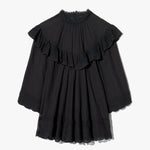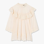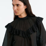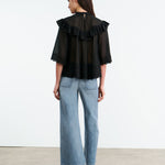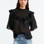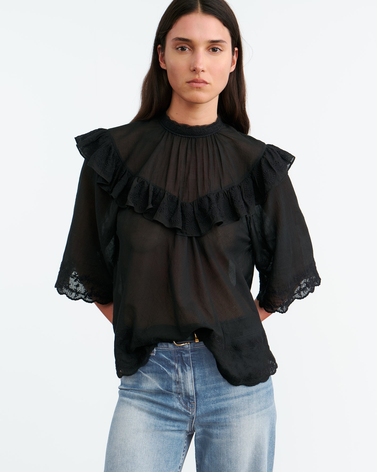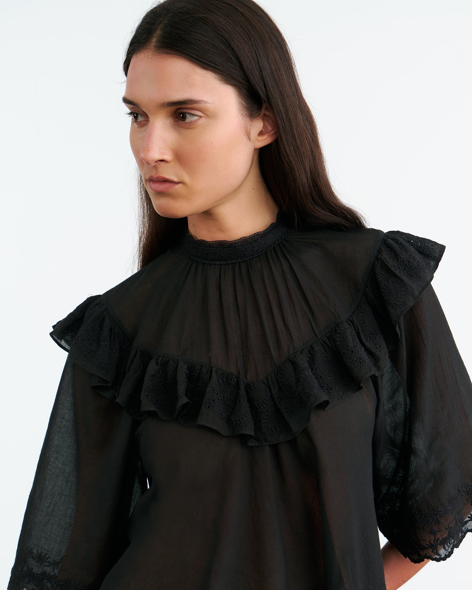 Relaxed pullover blouse in Indian cotton voile. Floral thread embroidery. Ruffle detail. Scalloped detail at sleeve and hem. Key hole with button closure at center back. Shirring detail at back.