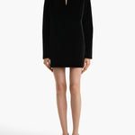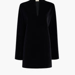 A sleek, funnel-neck minidress that blends tailoring and flou in compact Italian velvet selected for the softness and slight sheen of its short, tightly packed pile. Darts at notched neckline. Extended long sleeves. Slips on.